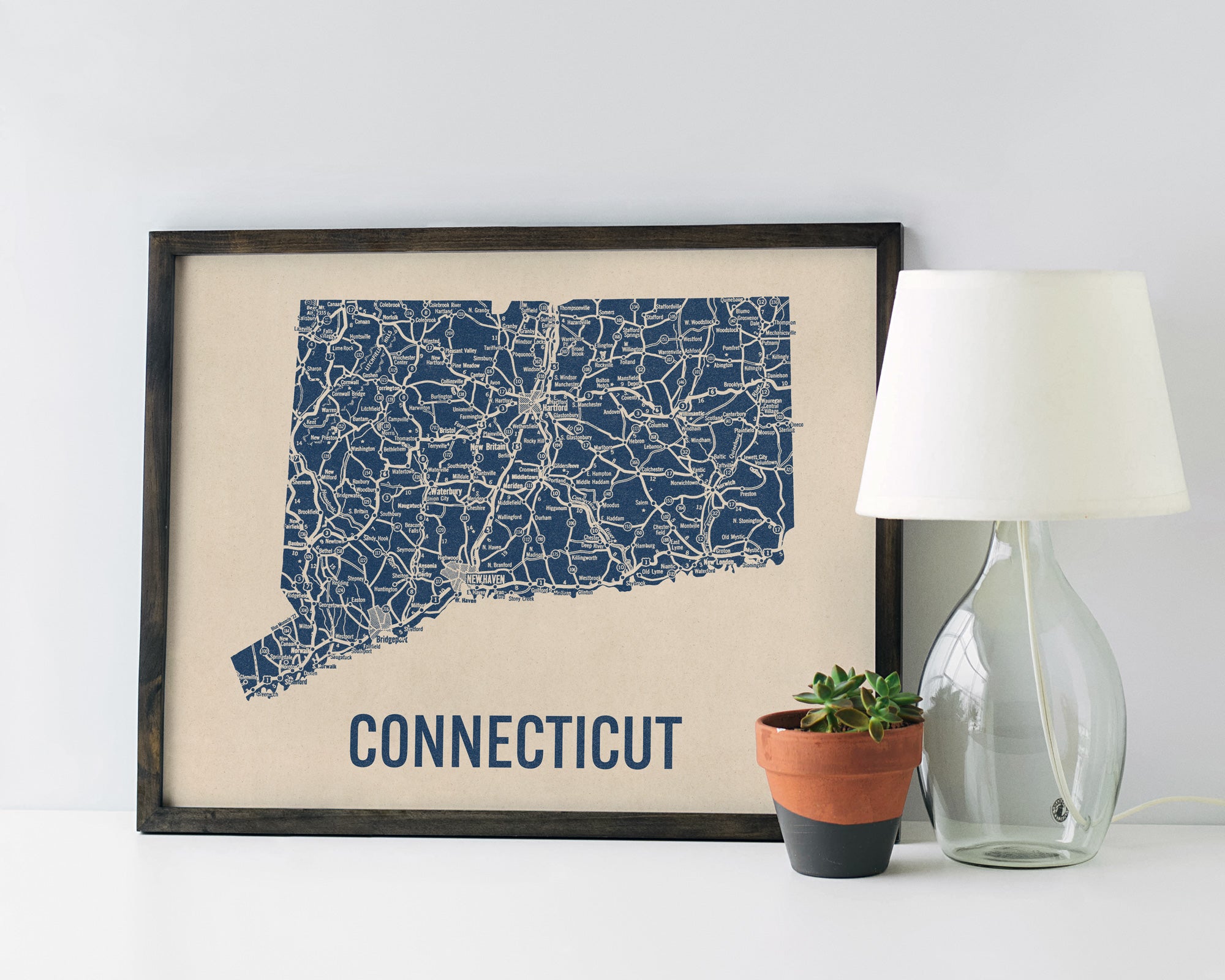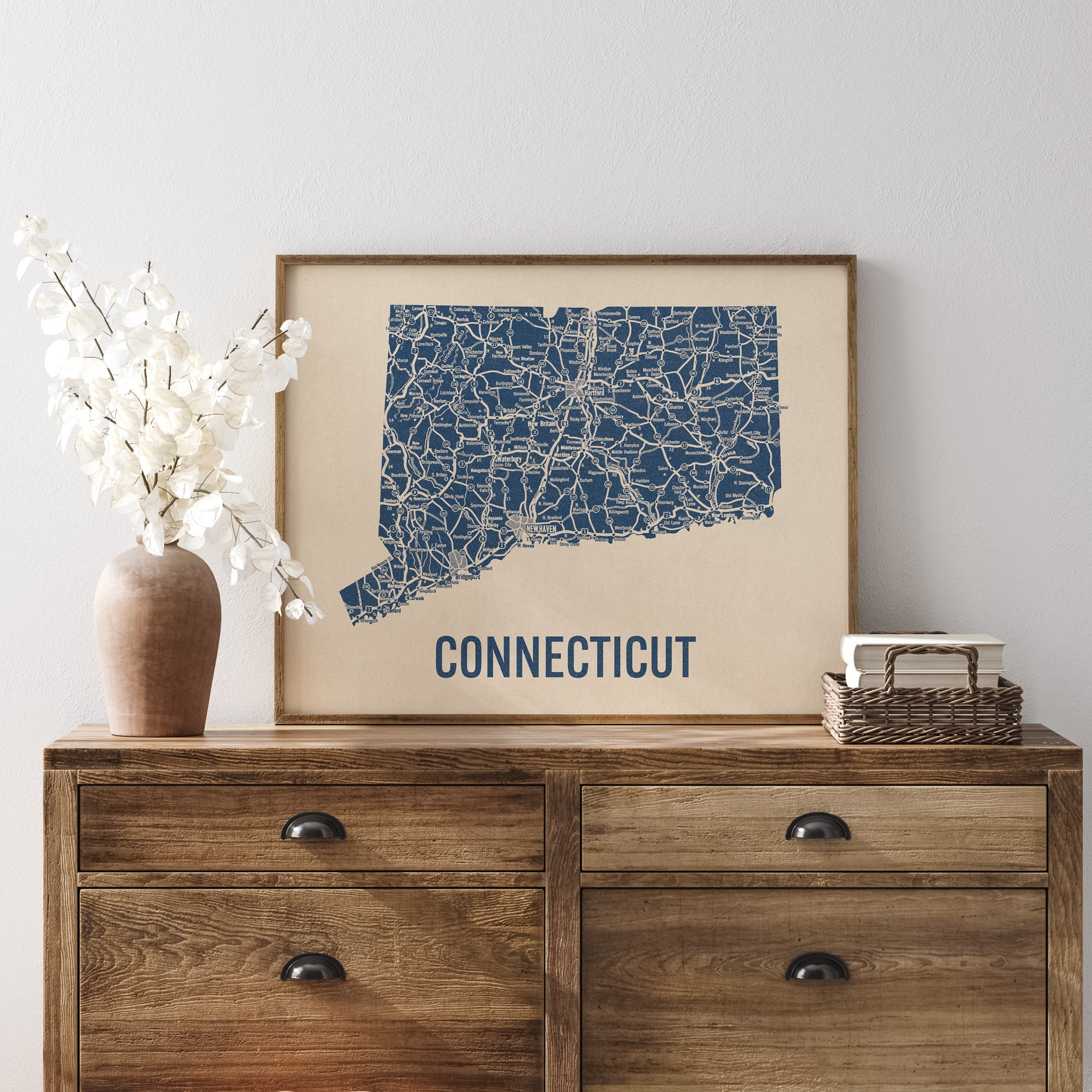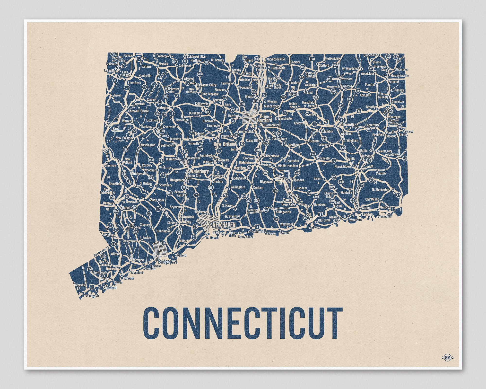 Archival art print based on a vintage 1930s highway map of Connecticut, blue on beige.
