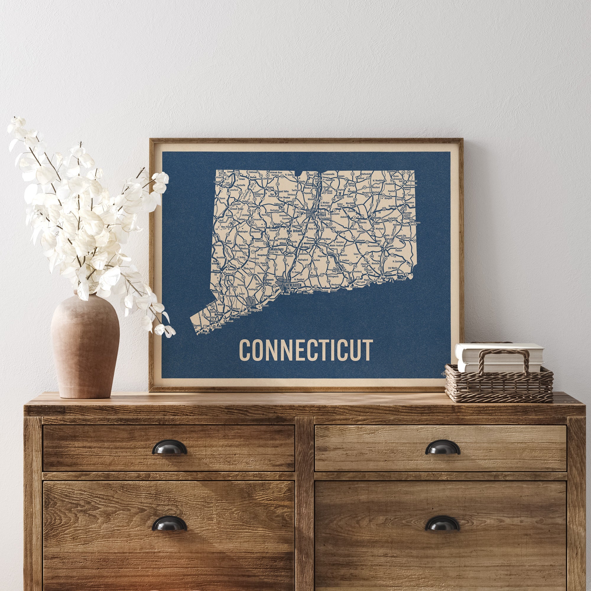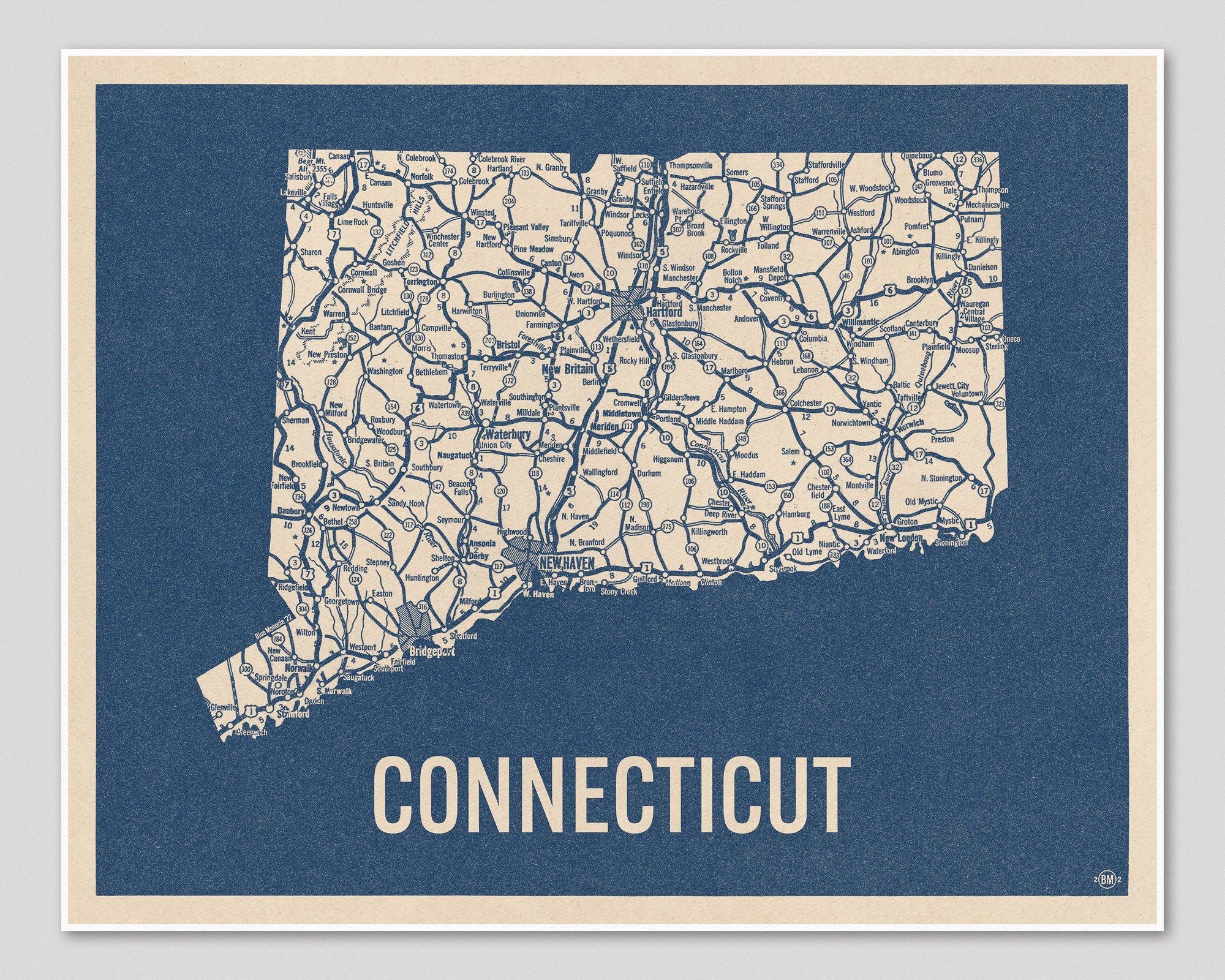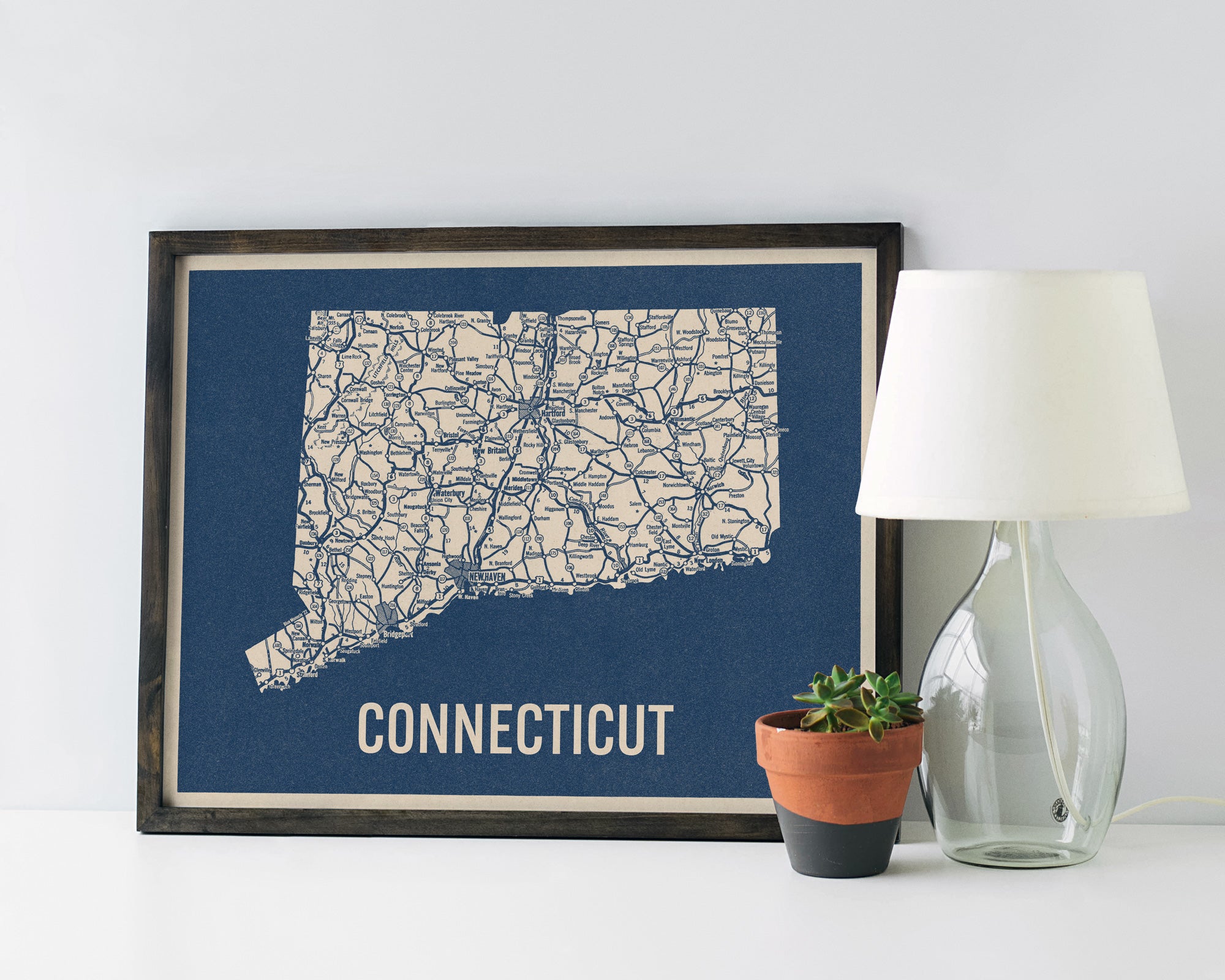 Archival art print based on a vintage 1930s highway map of Connecticut, blue on beige.