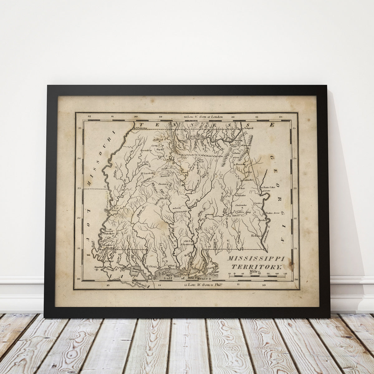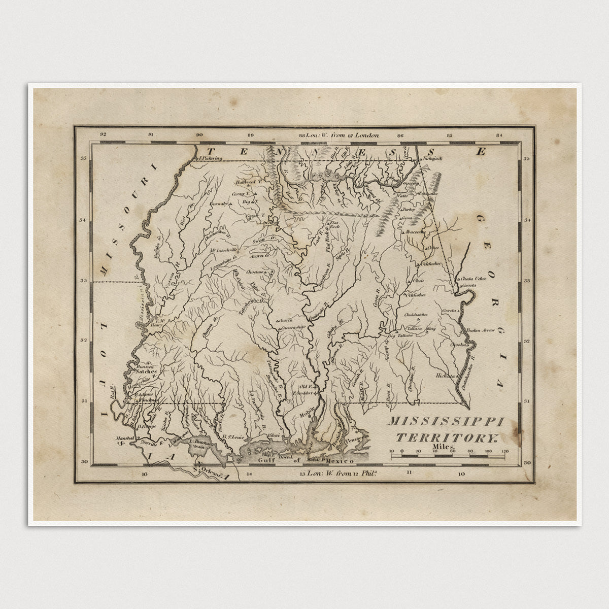 Archival print reproduction of an antique map of Alabama and Mississippi from 1816 by Mathew Carey.