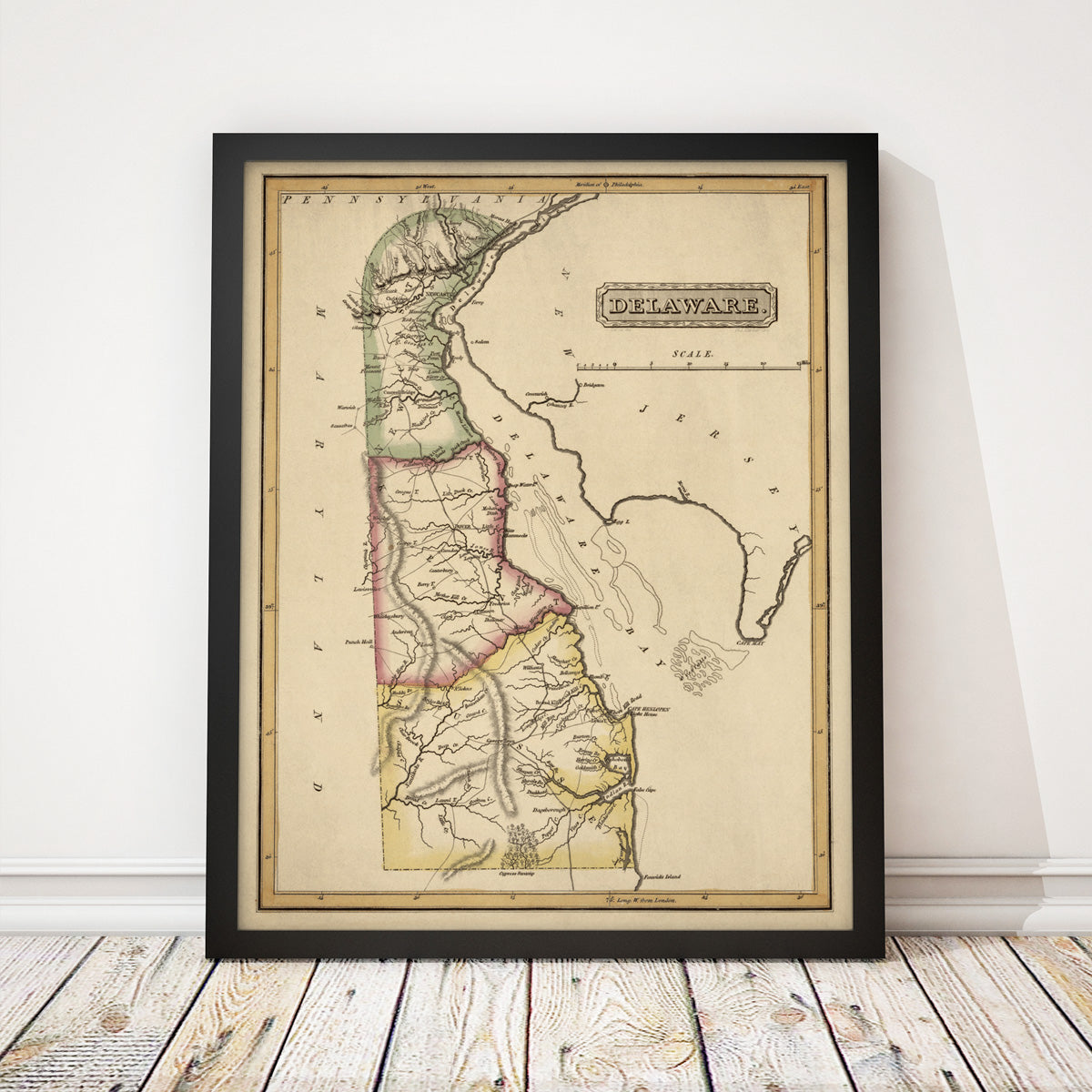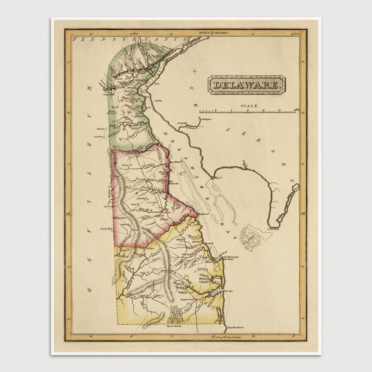 Archival print reproduction of an antique map of Delaware from c1817 by Fielding Lucas.