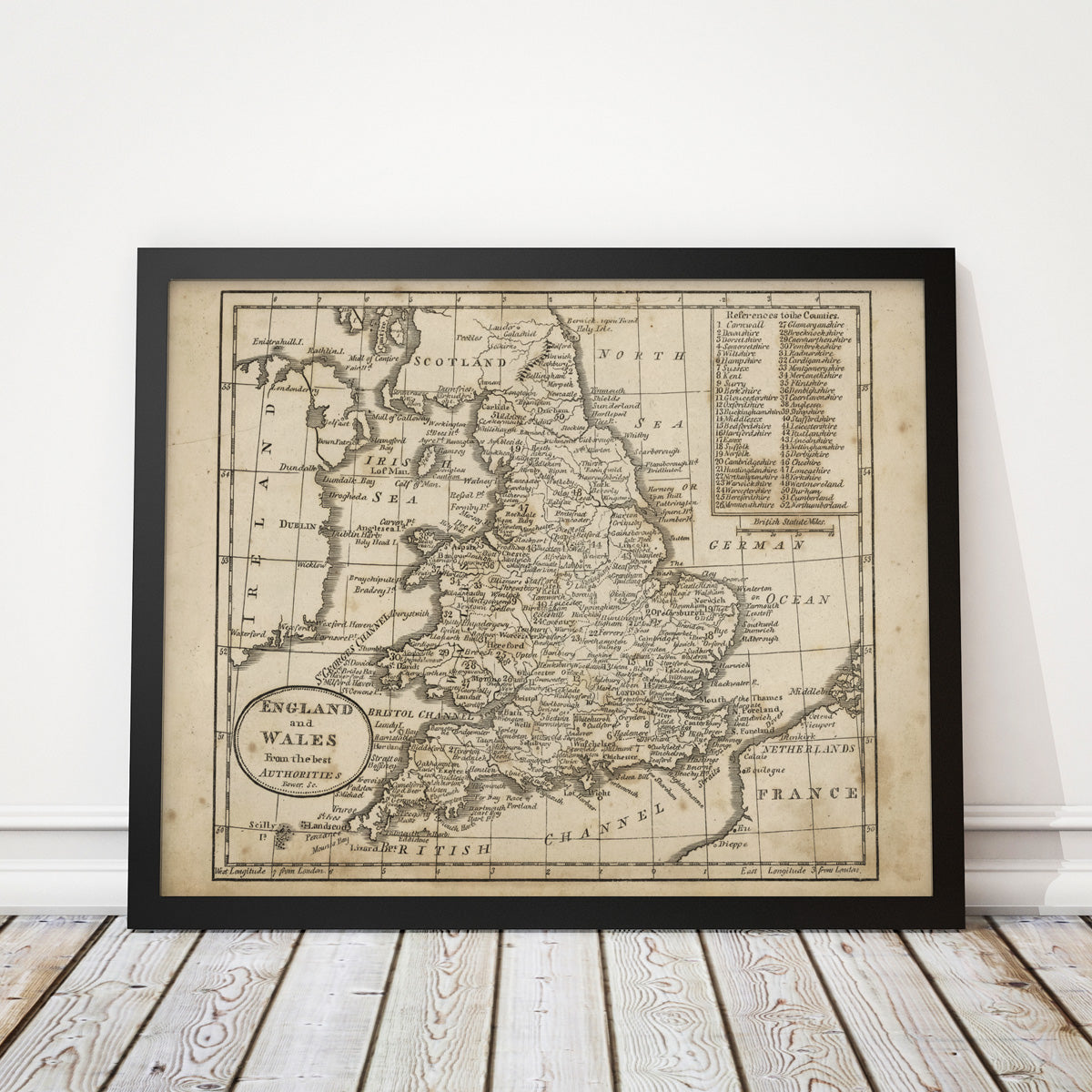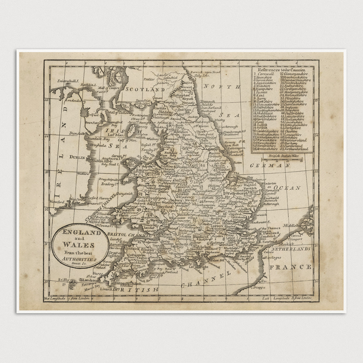 Archival print reproduction of an antique map of England and Wales from 1816 by Mathew Carey.