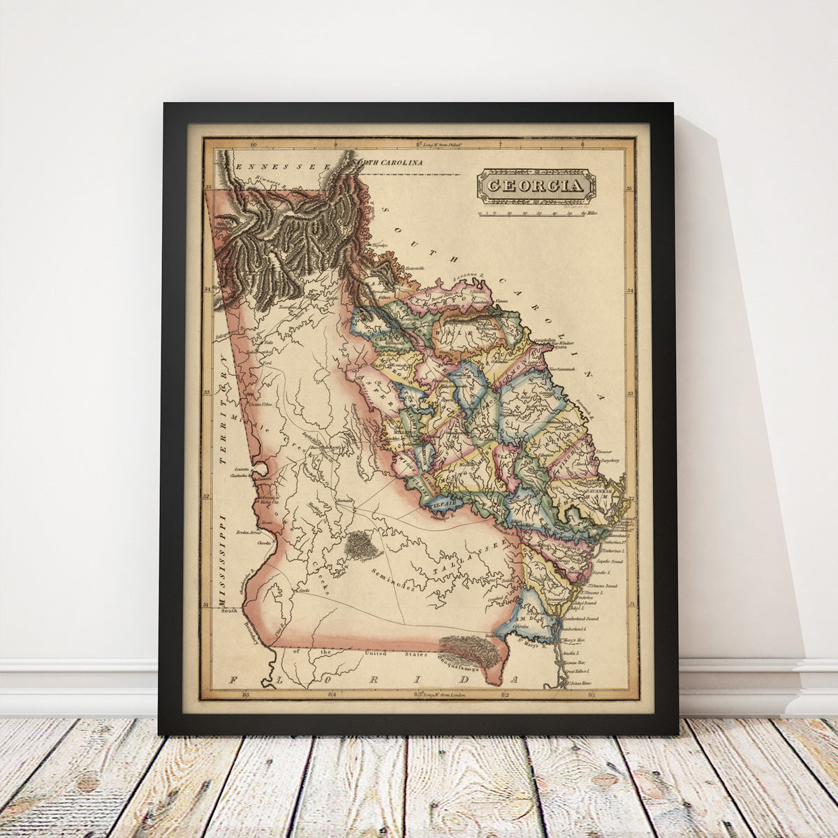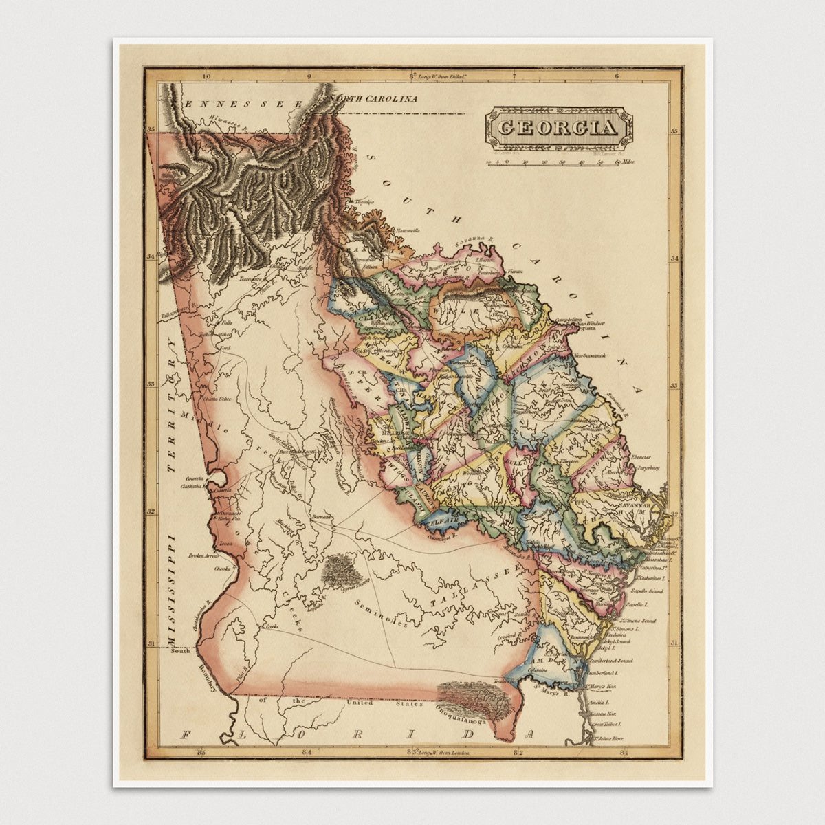 Archival print reproduction of an antique map of Georgia from c1817 by Fielding Lucas.