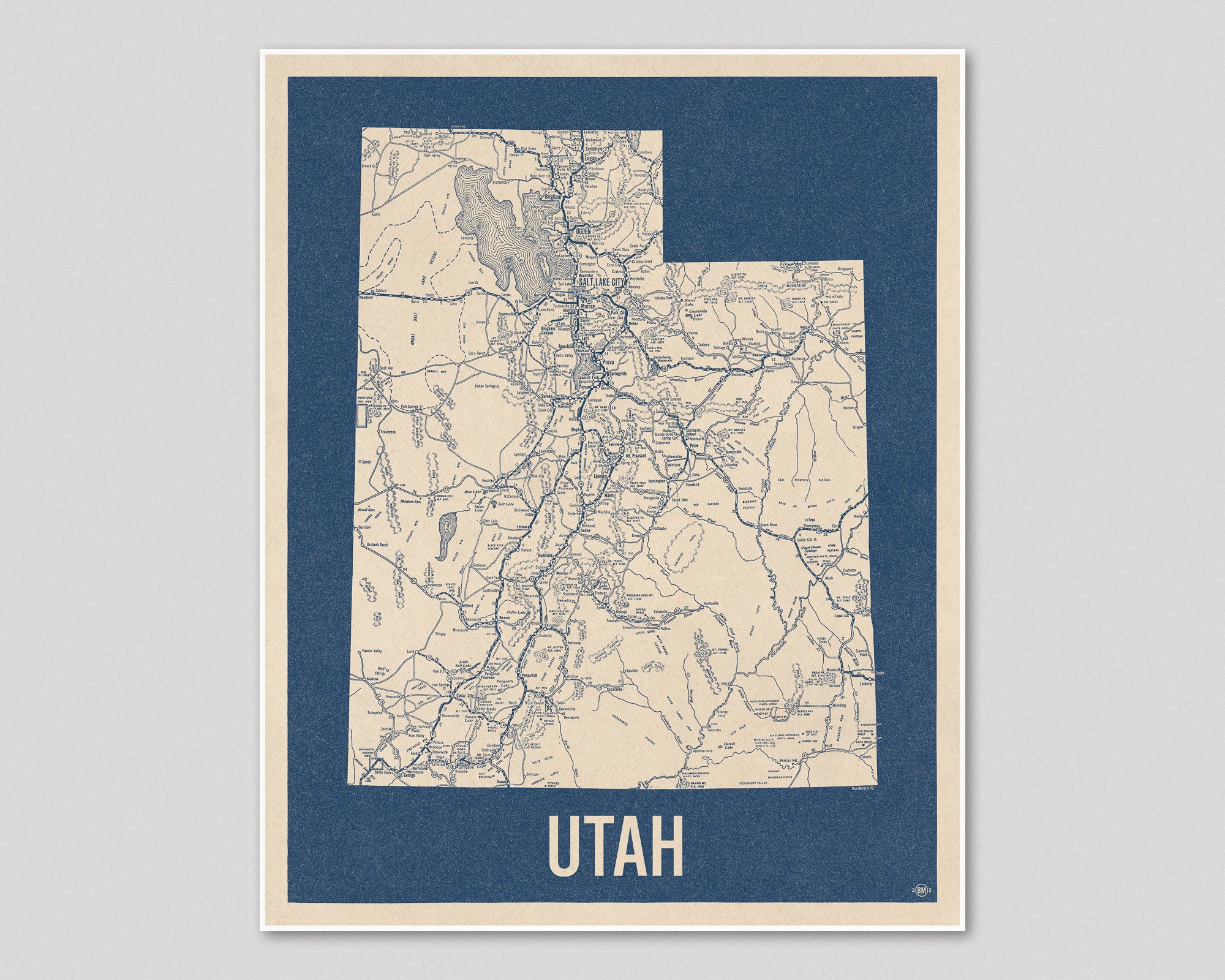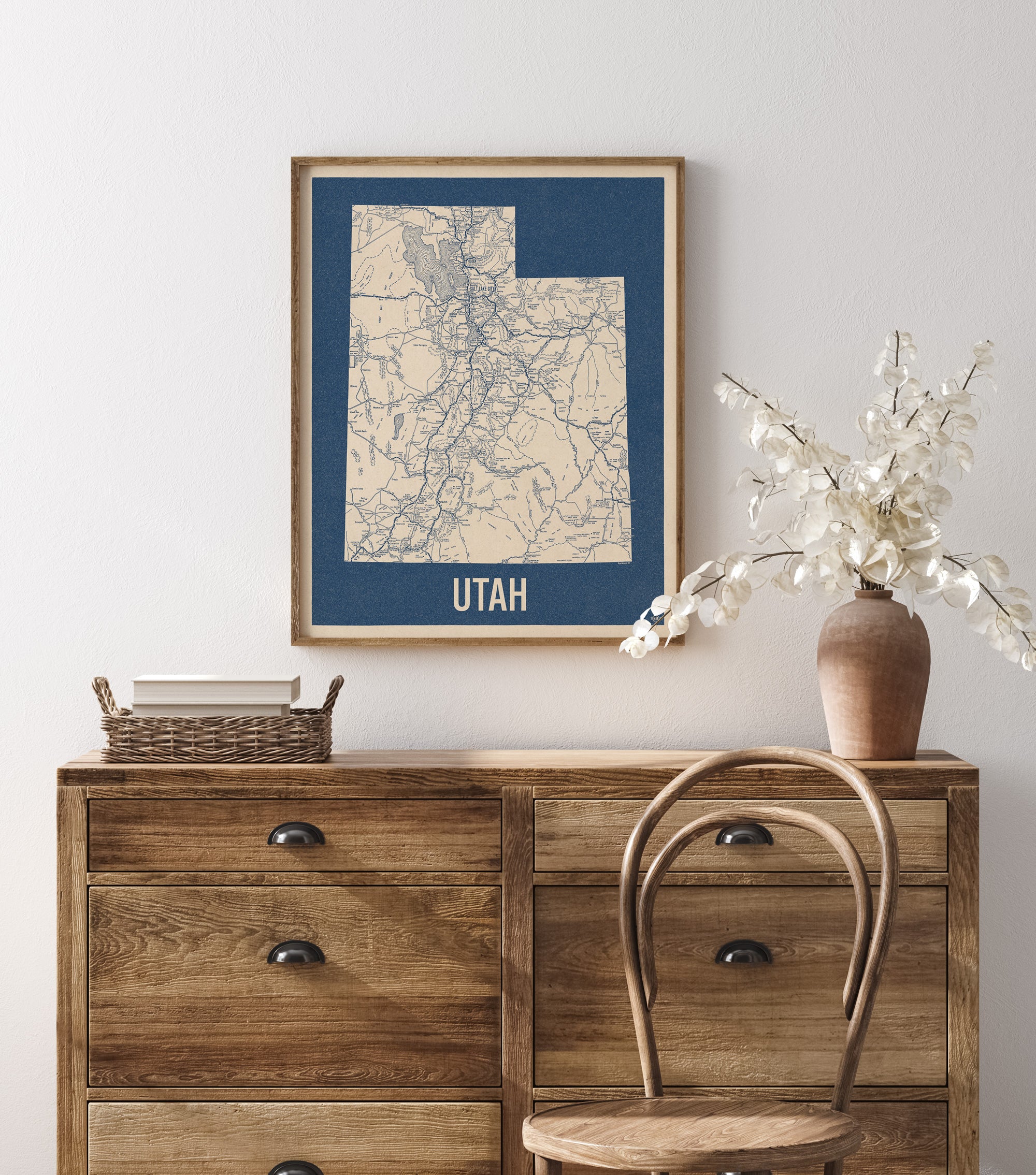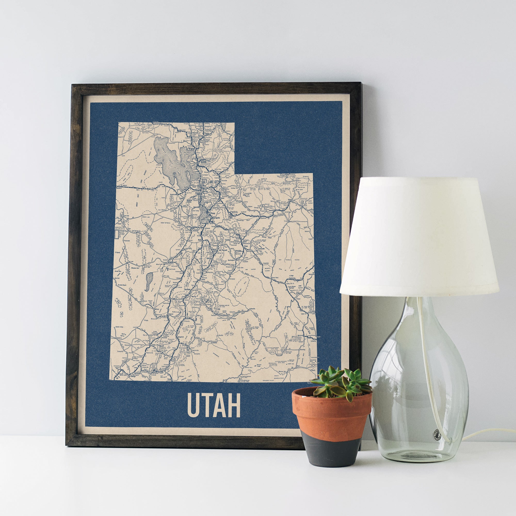 Archival art print based on a vintage 1930s highway map of Utah, blue on beige.