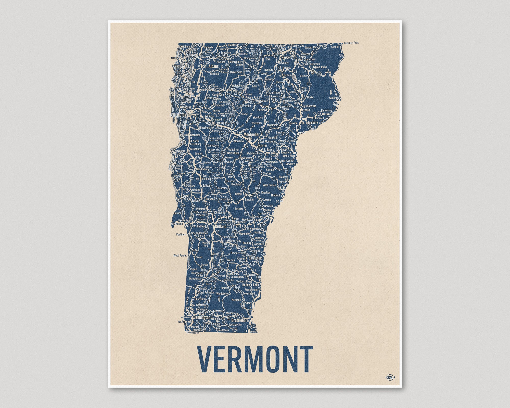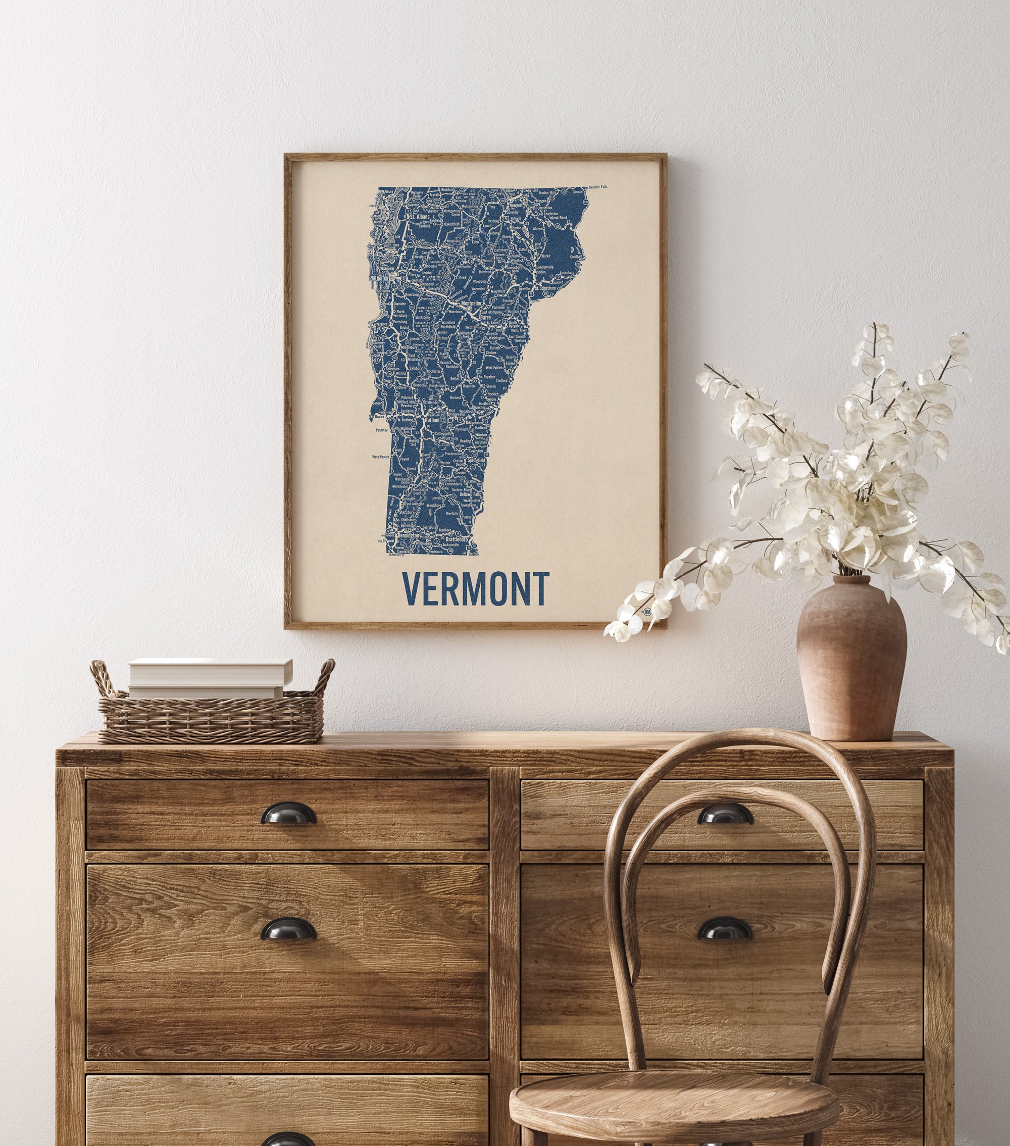 Archival art print based on a vintage 1930s highway map of Vermont, blue on beige.