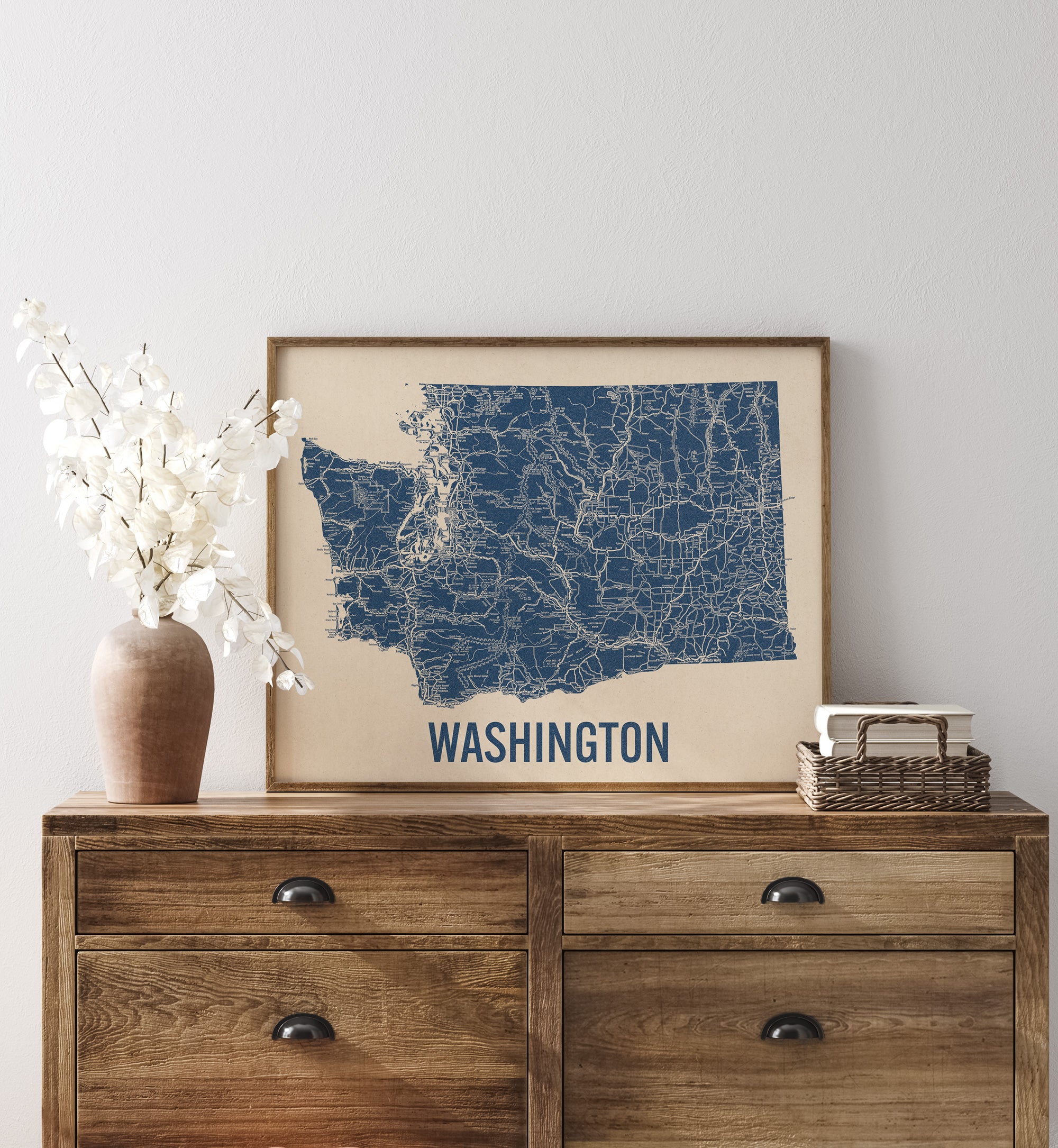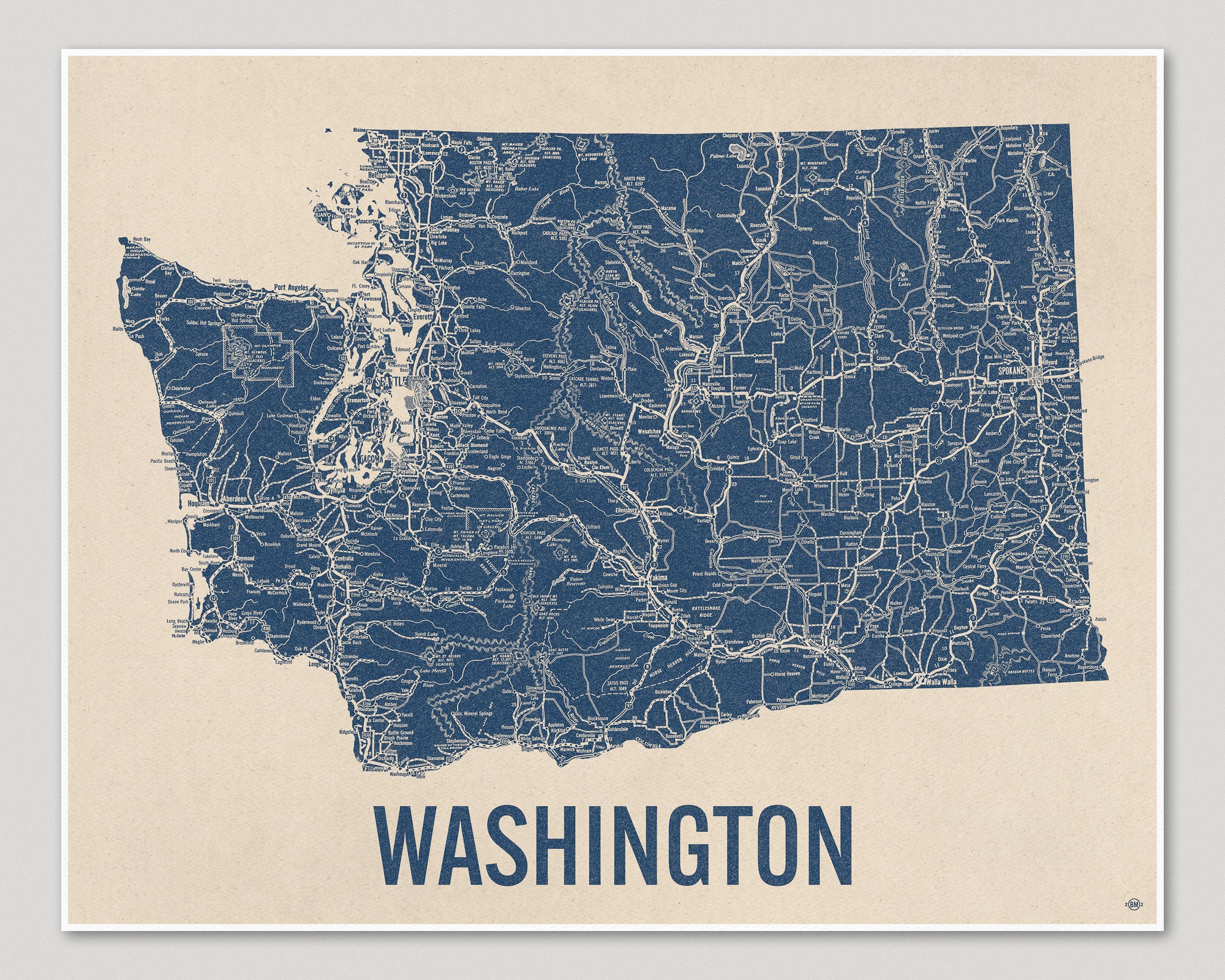 Archival art print based on a vintage 1930s highway map of Washington State, blue on beige.