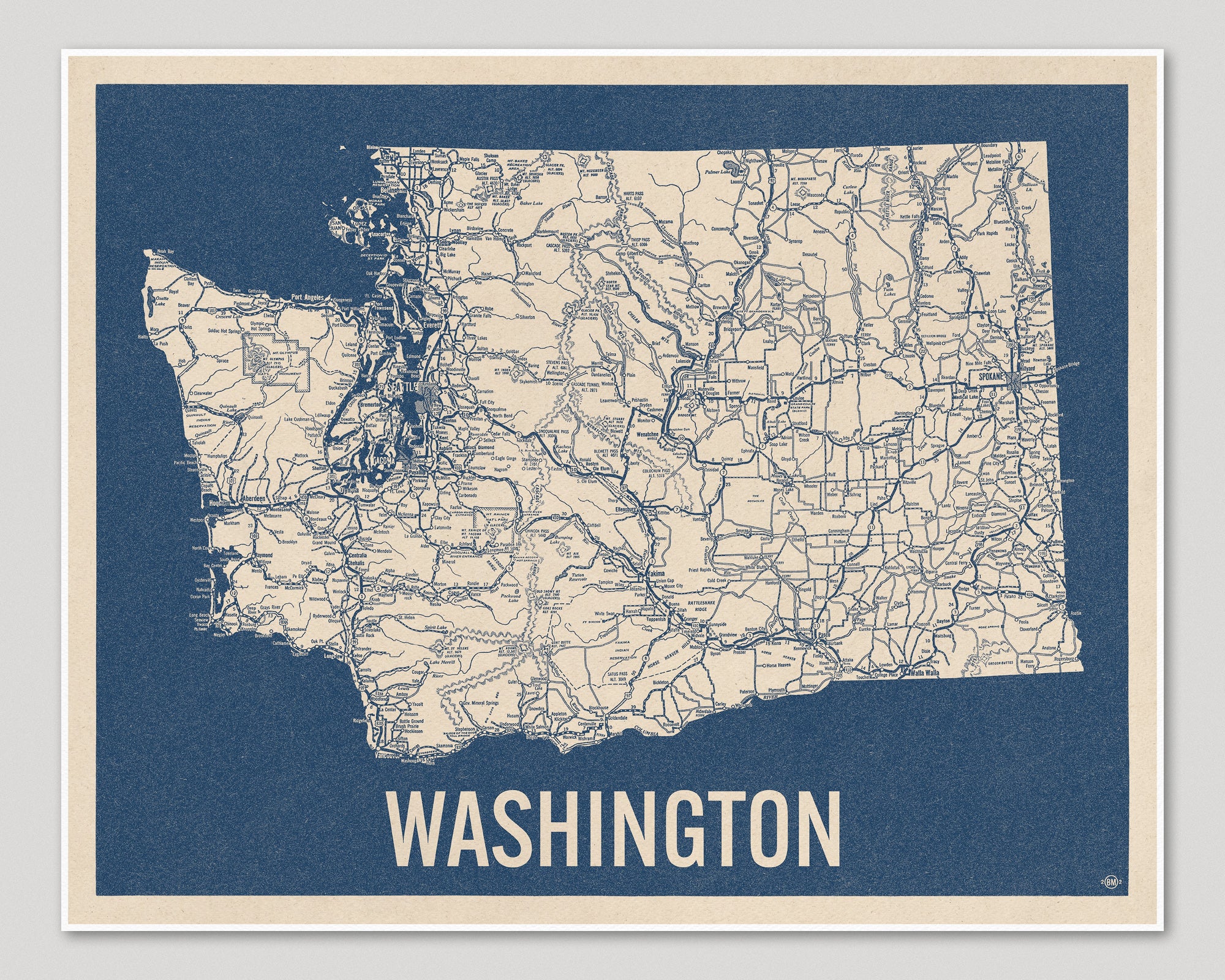 Archival art print based on a vintage 1930s highway map of Washington State, blue on beige.