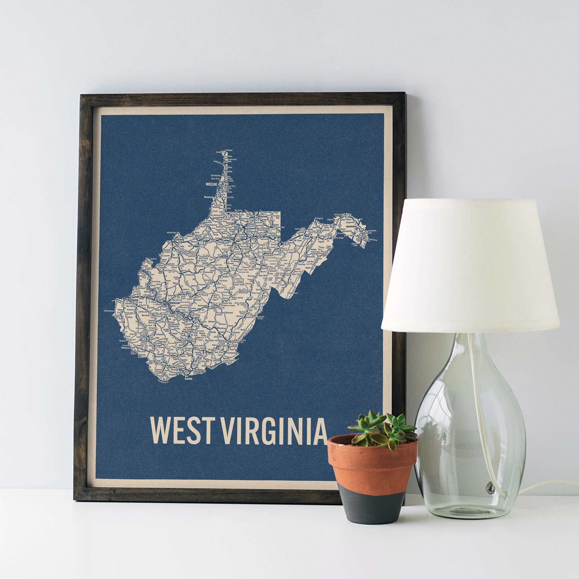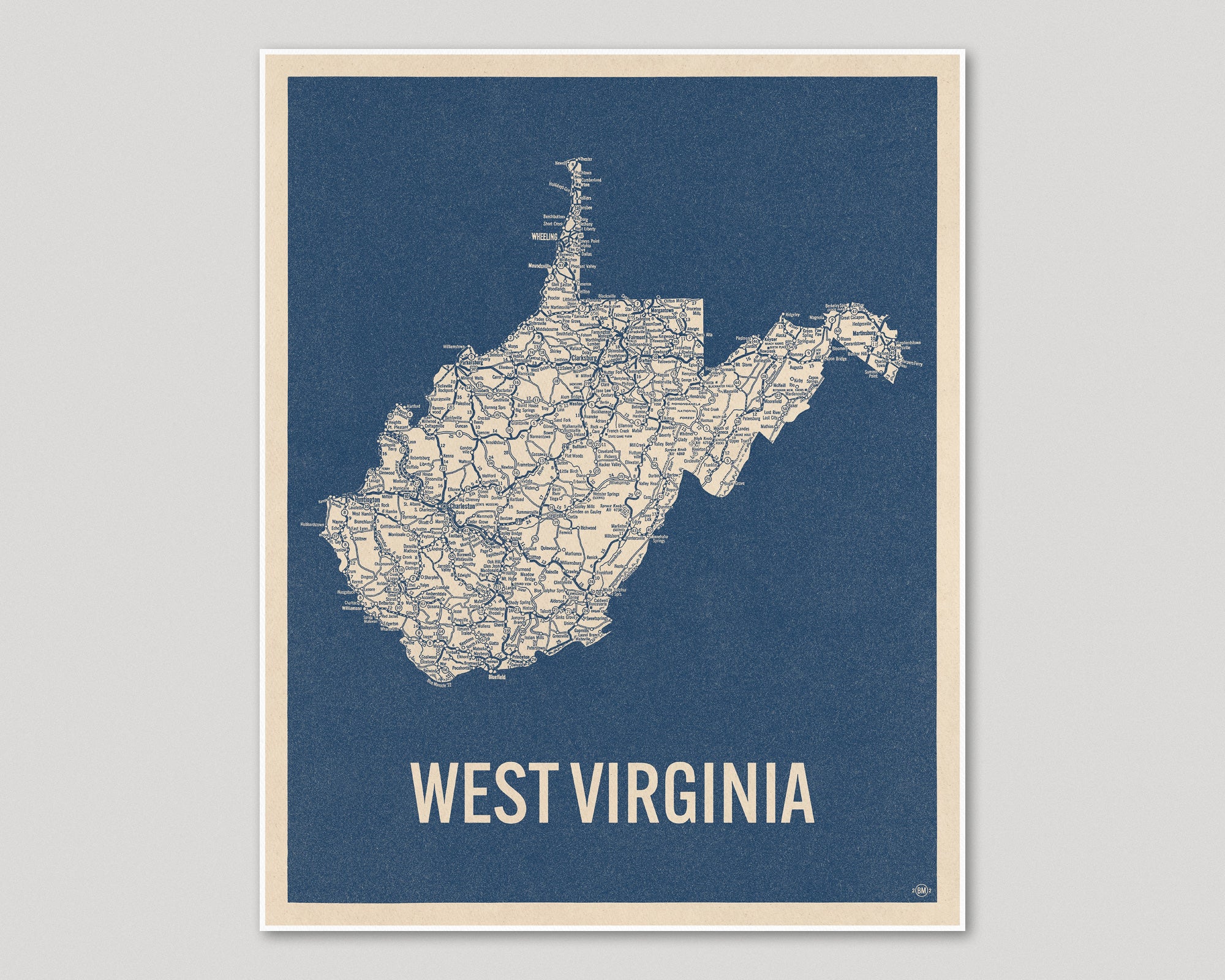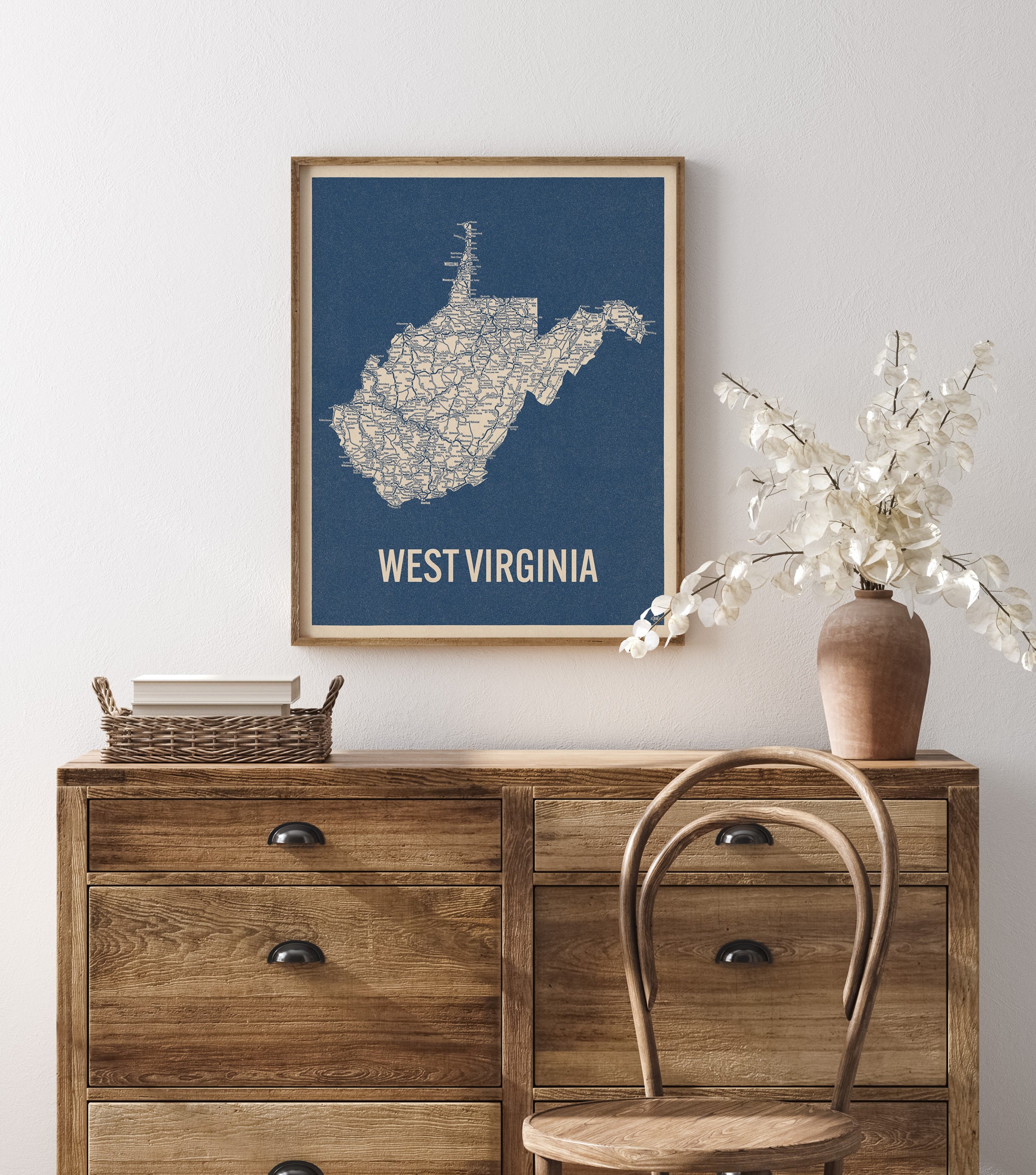 Archival art print based on a vintage 1930s highway map of West Virginia, blue on beige.