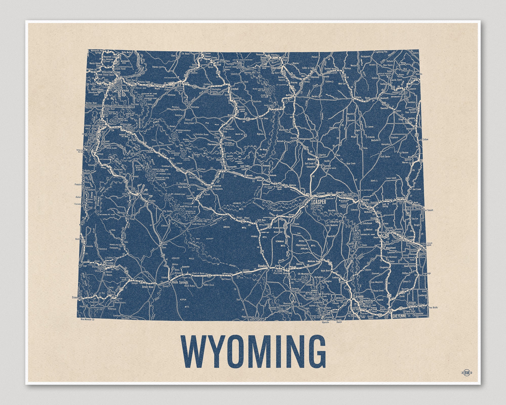 Archival art print based on a vintage 1930s highway map of Wyoming, blue on beige.