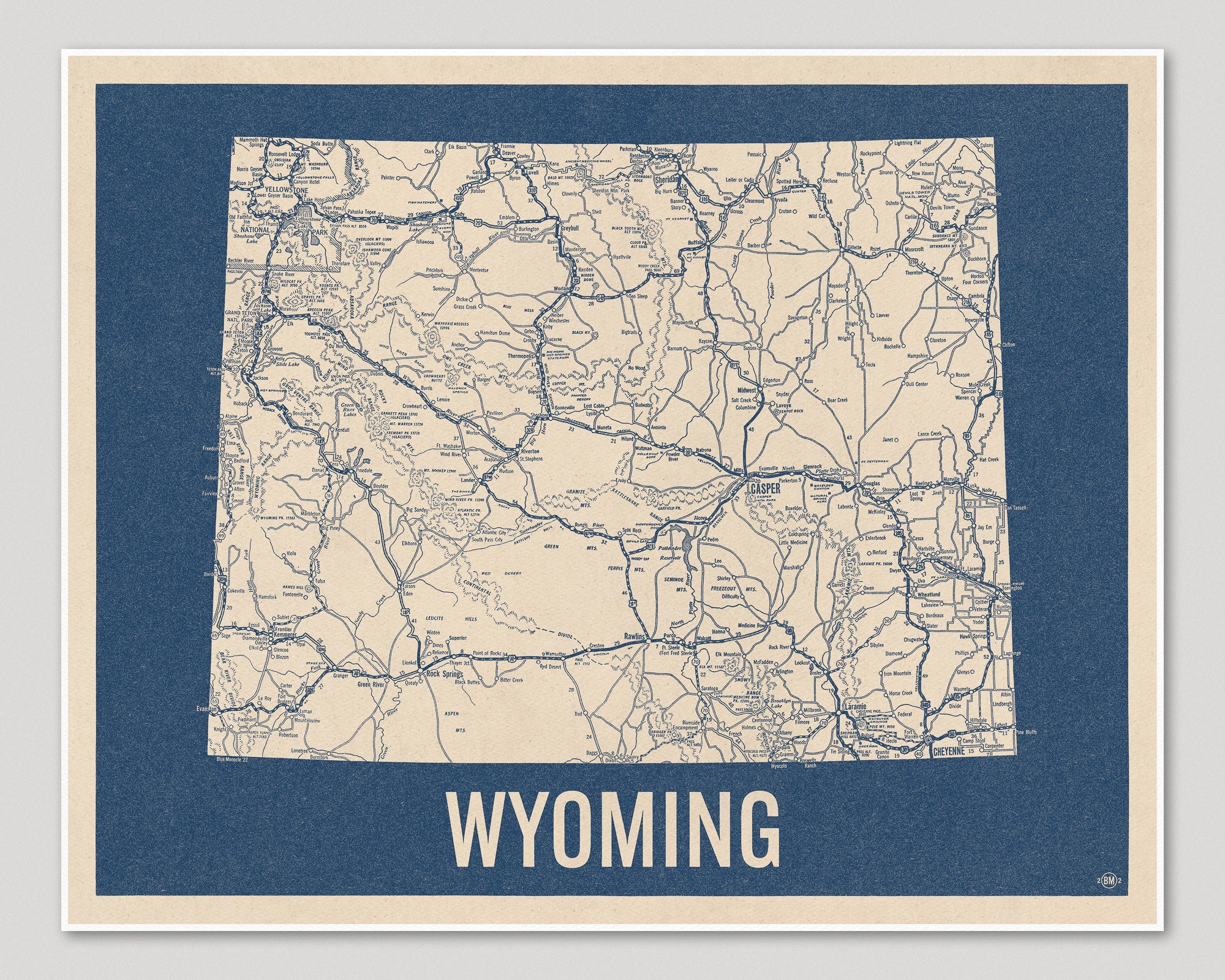 Archival art print based on a vintage 1930s highway map of Wyoming, blue on beige.