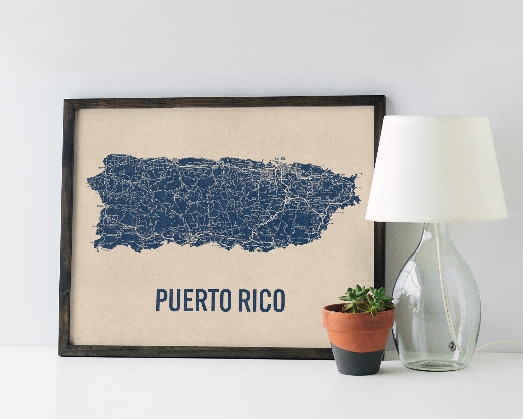 Archival art print of a modern highway map of Puerto Rico in a vintage style, blue on beige.