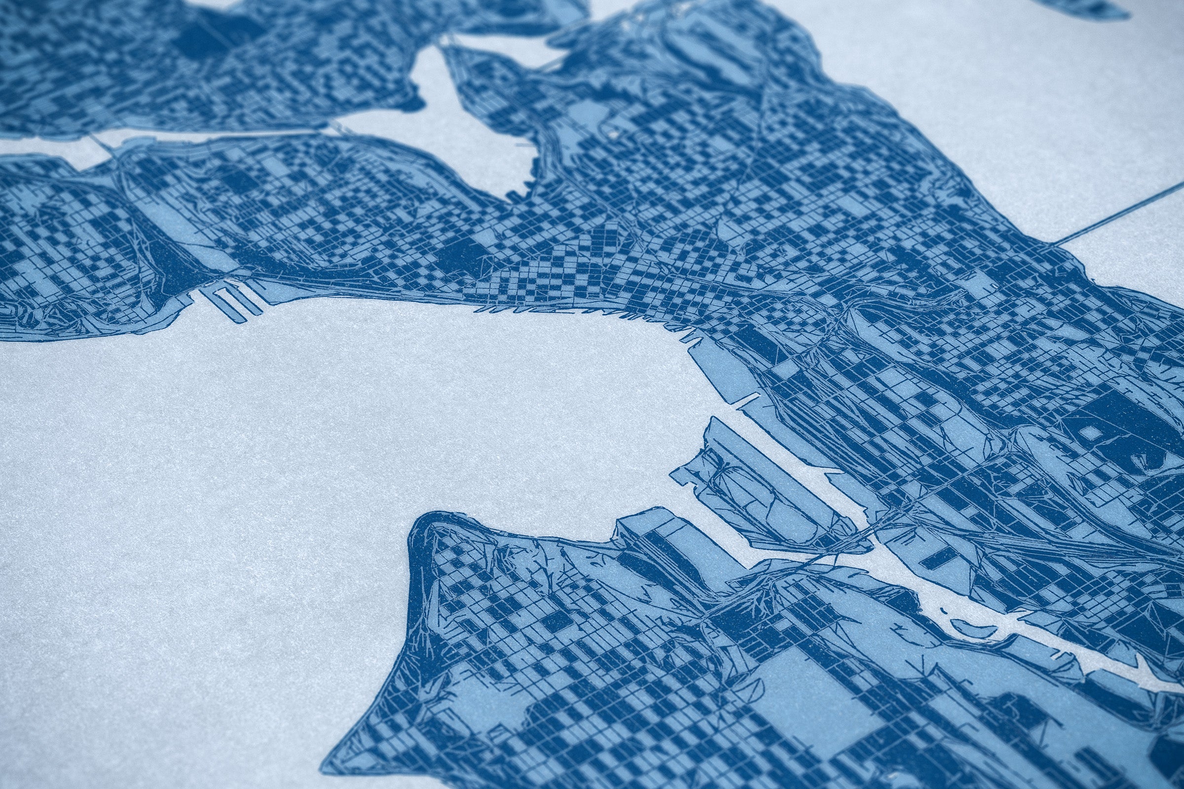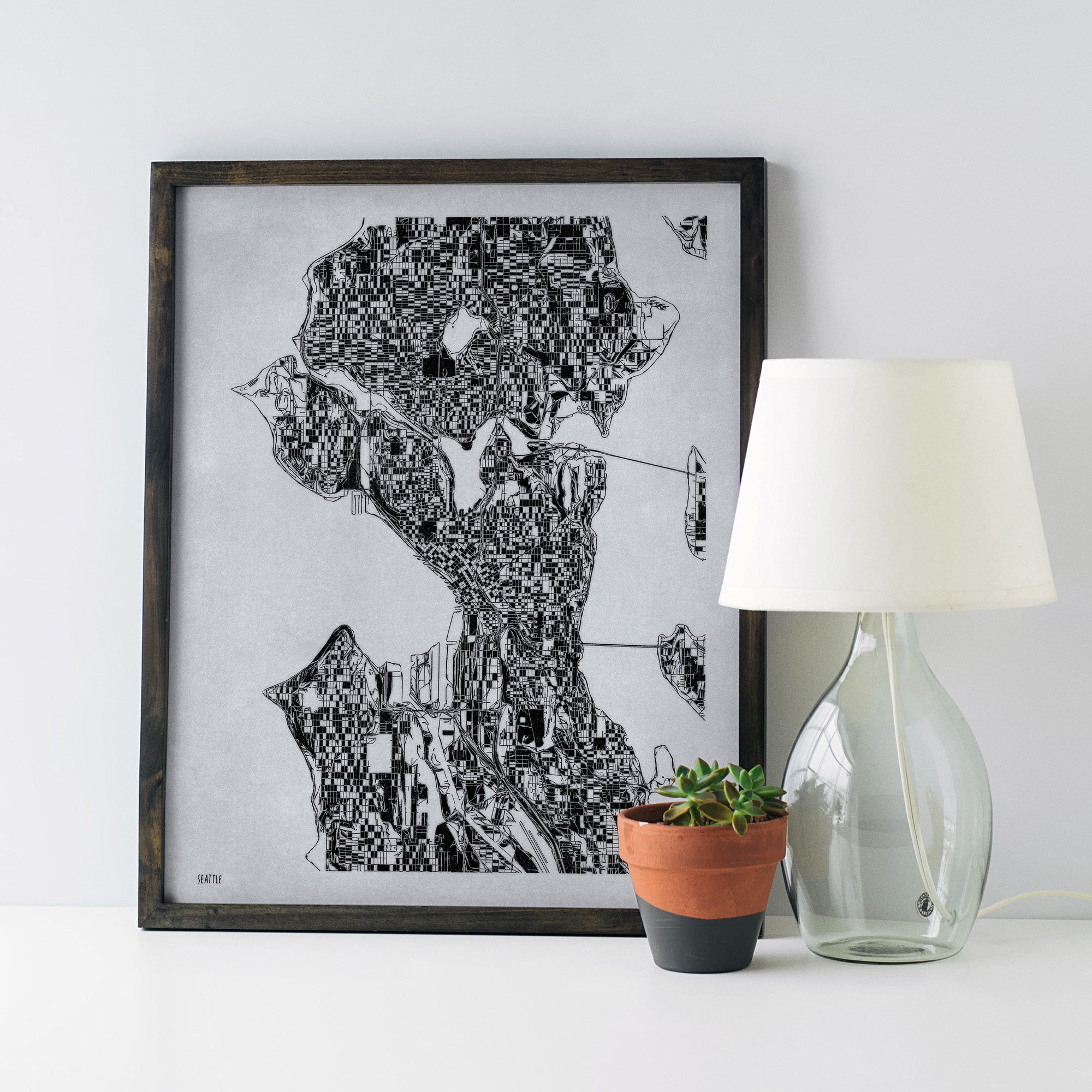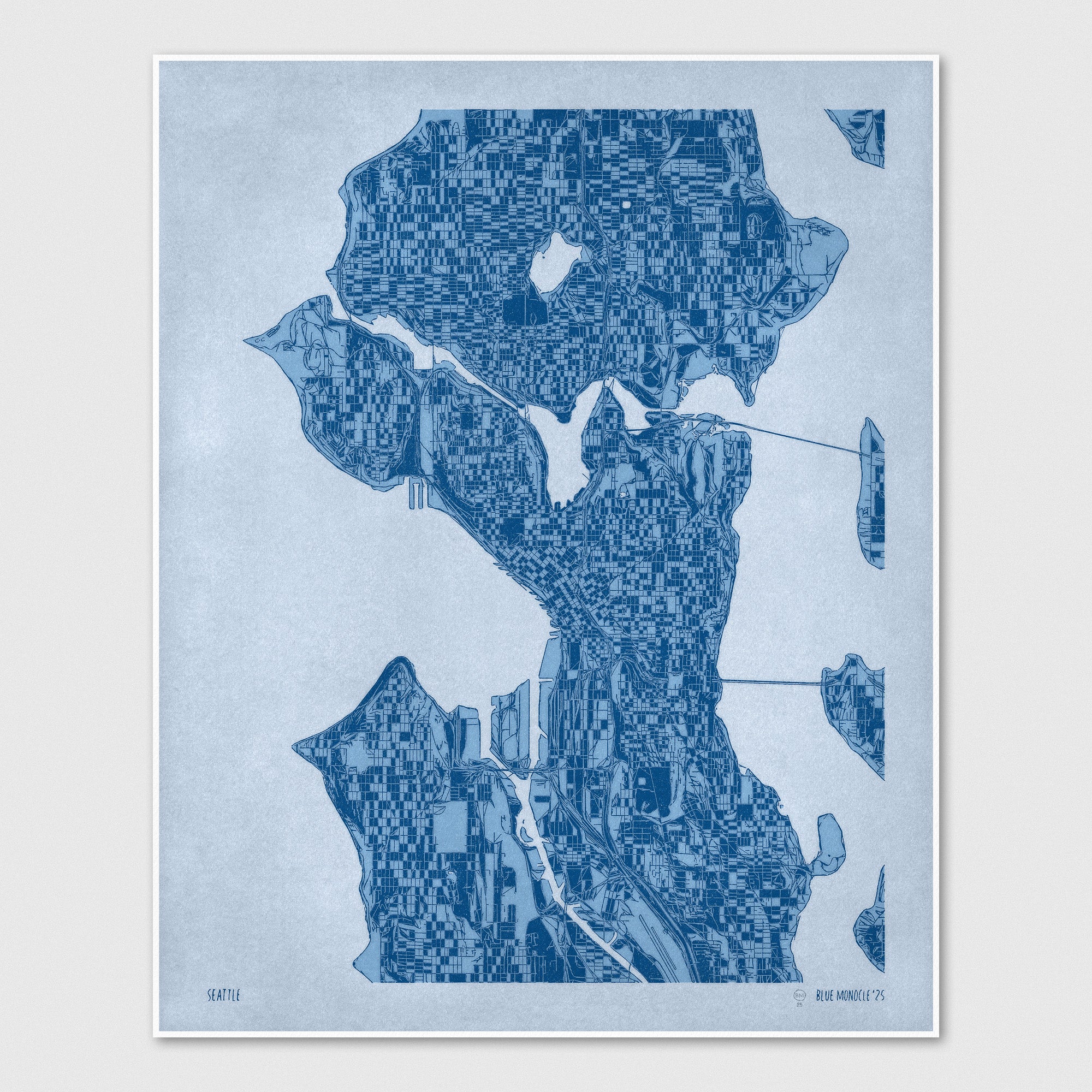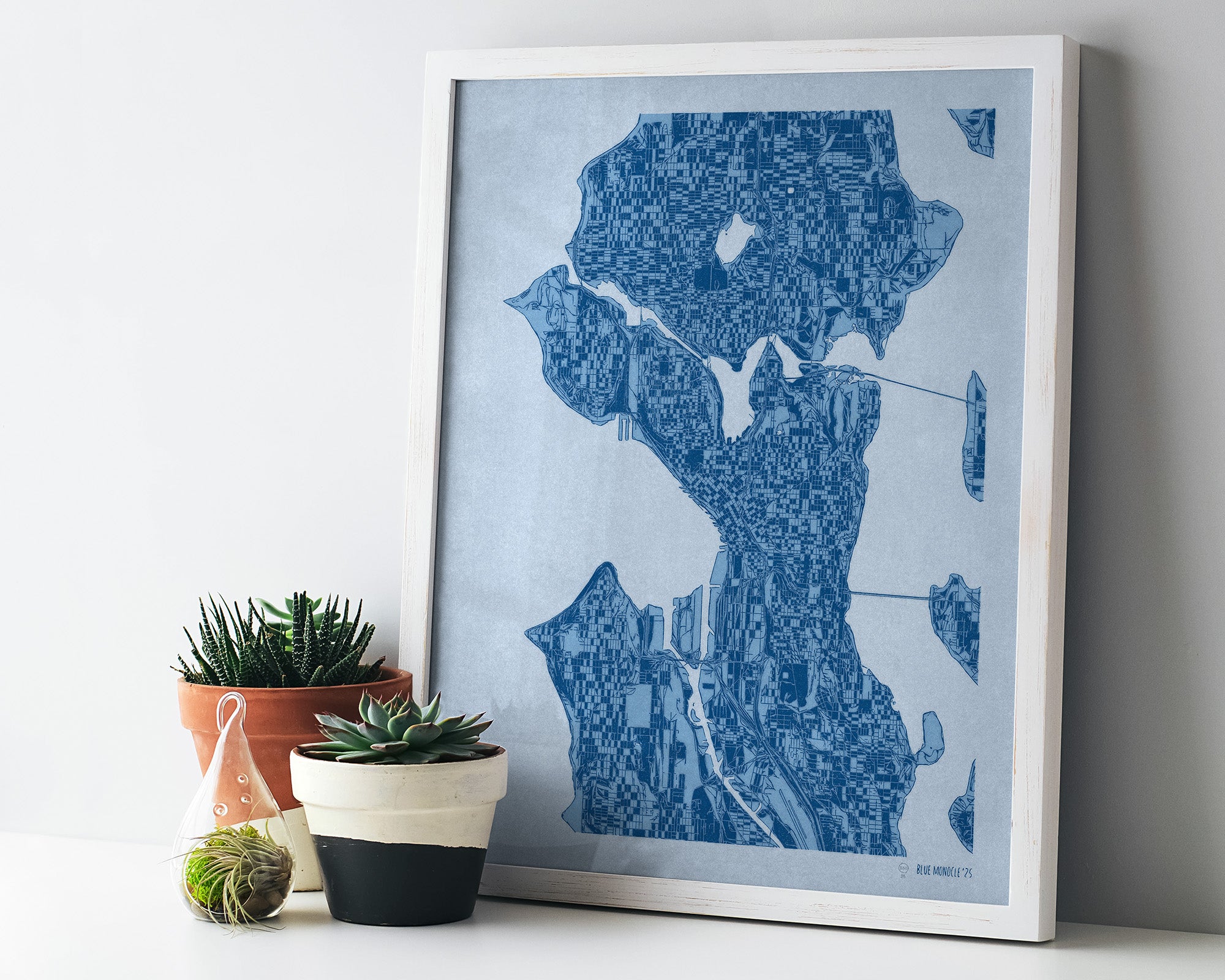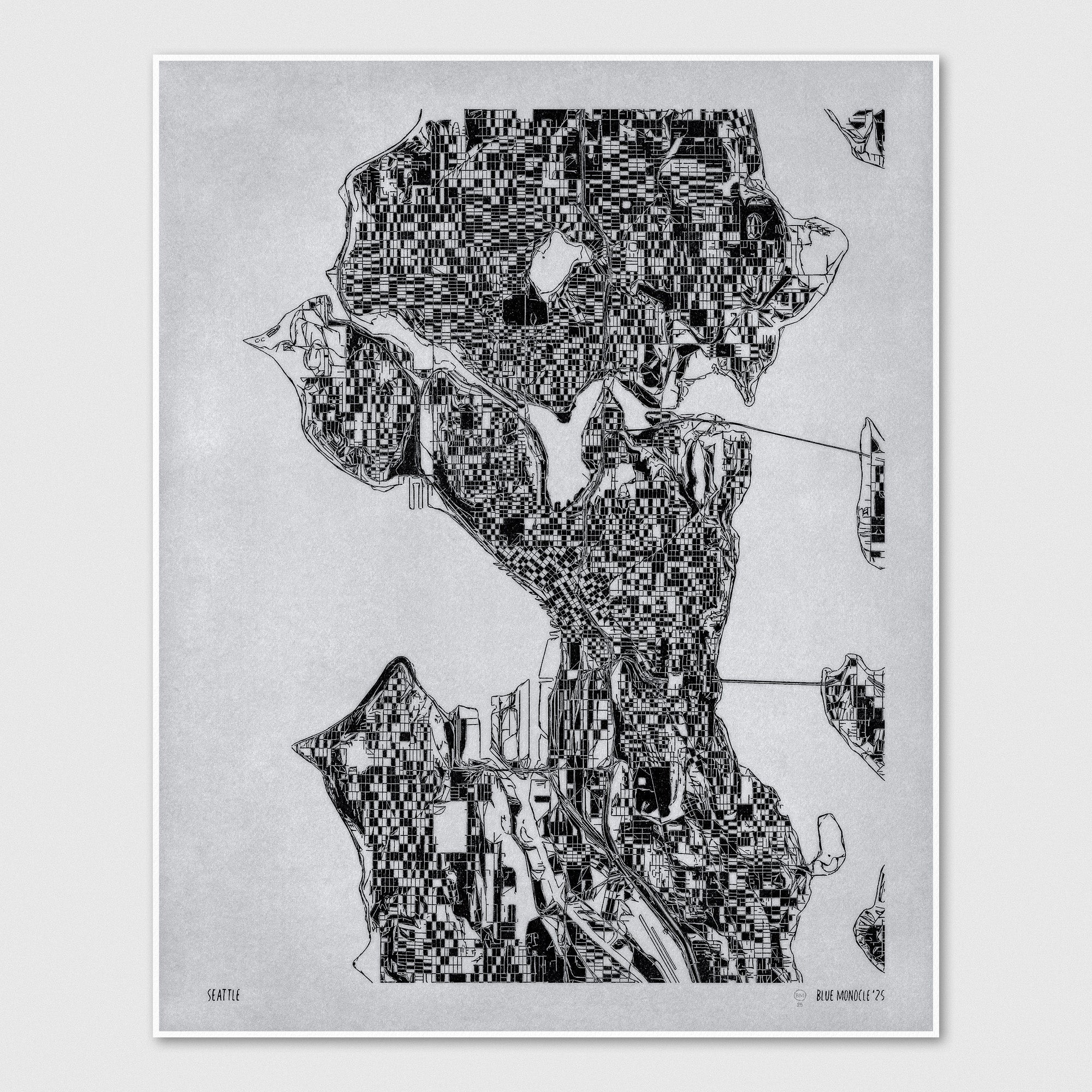 Archival art print of a modern street map of Seattle, WA in an abstract, geometric, hand-drawn style, available in blue or black/gray. Printed on 100% cotton, acid-free fine art paper with archival pigment inks.