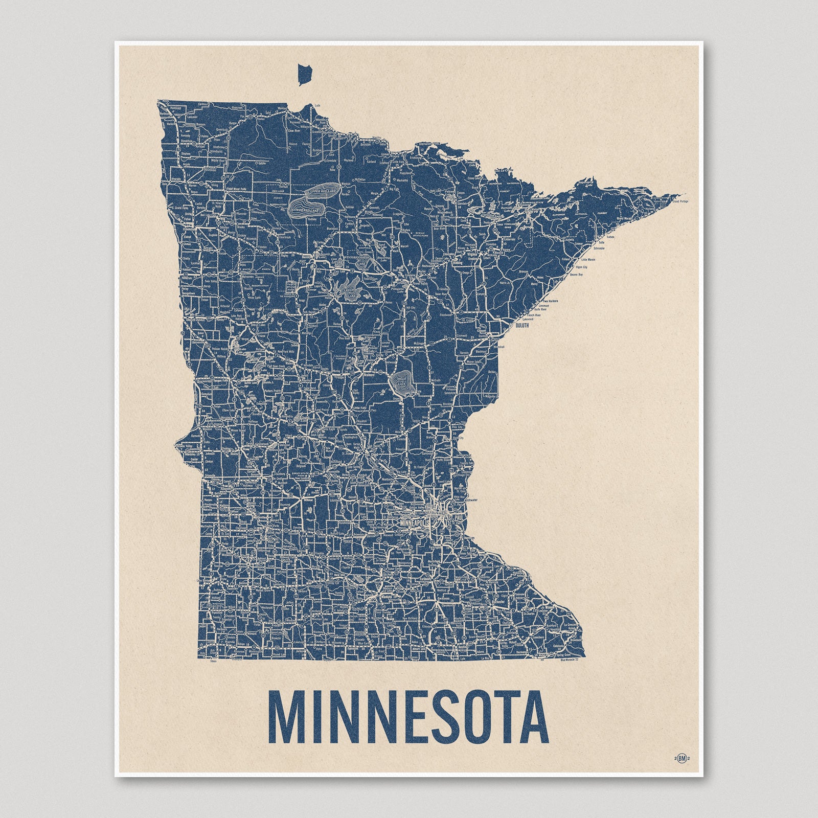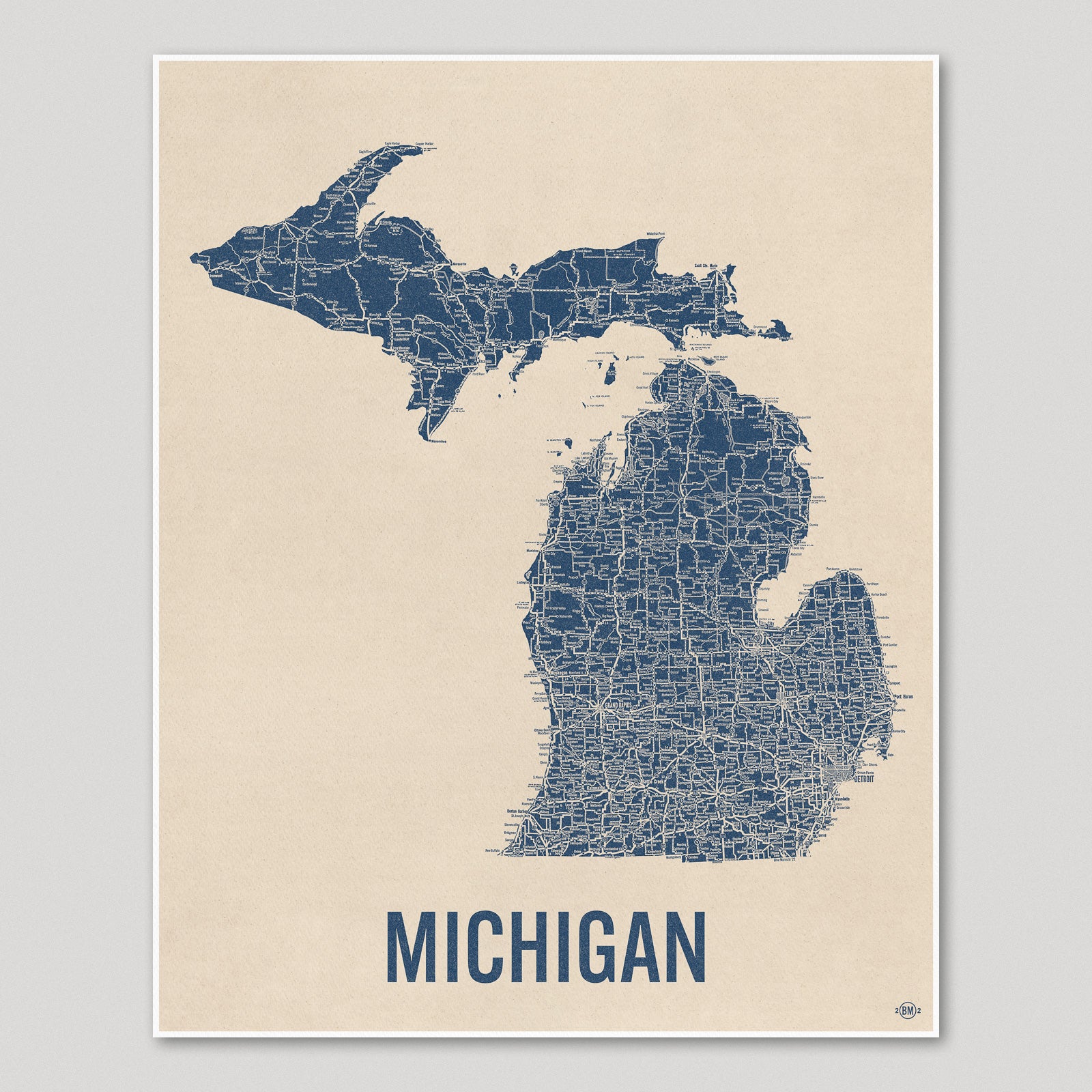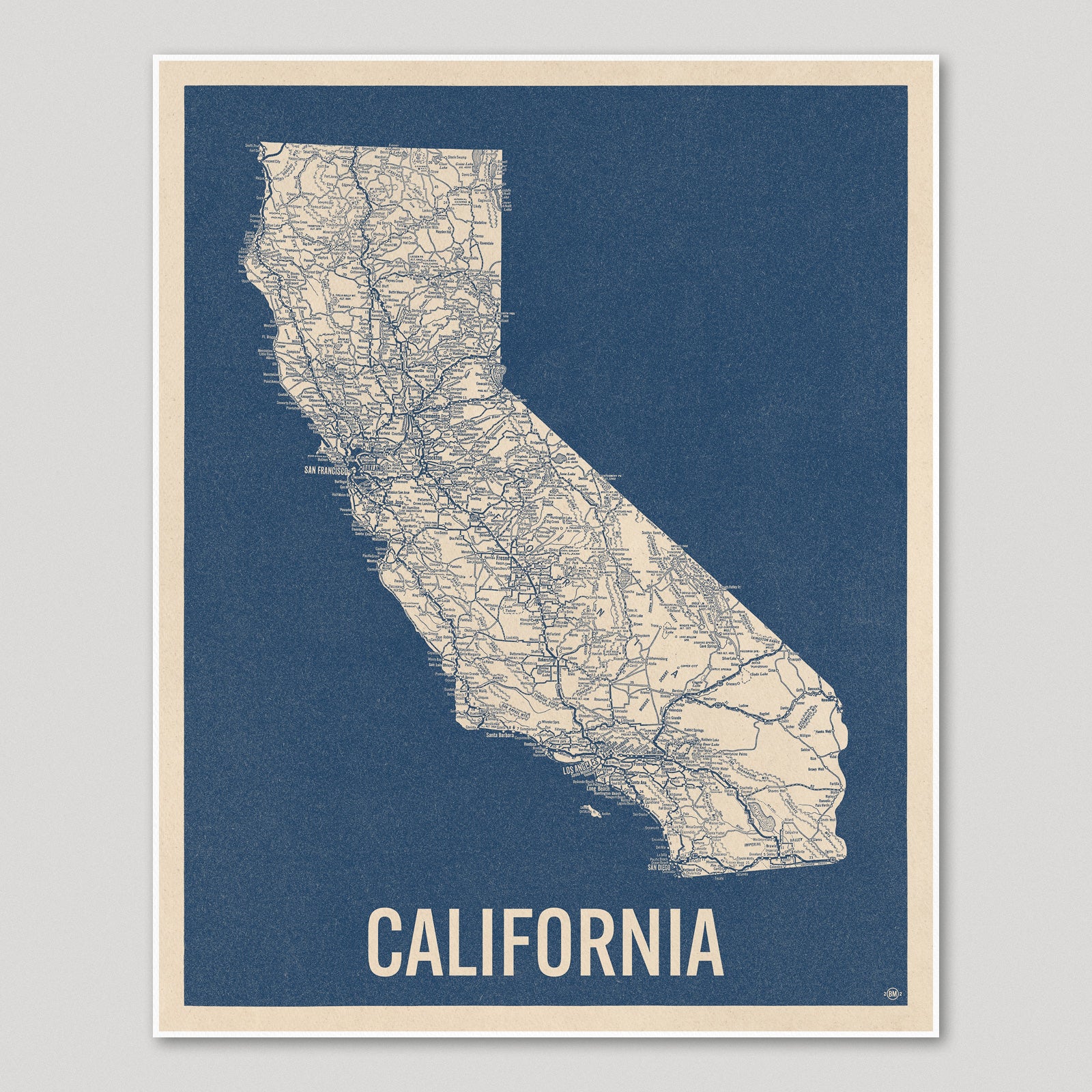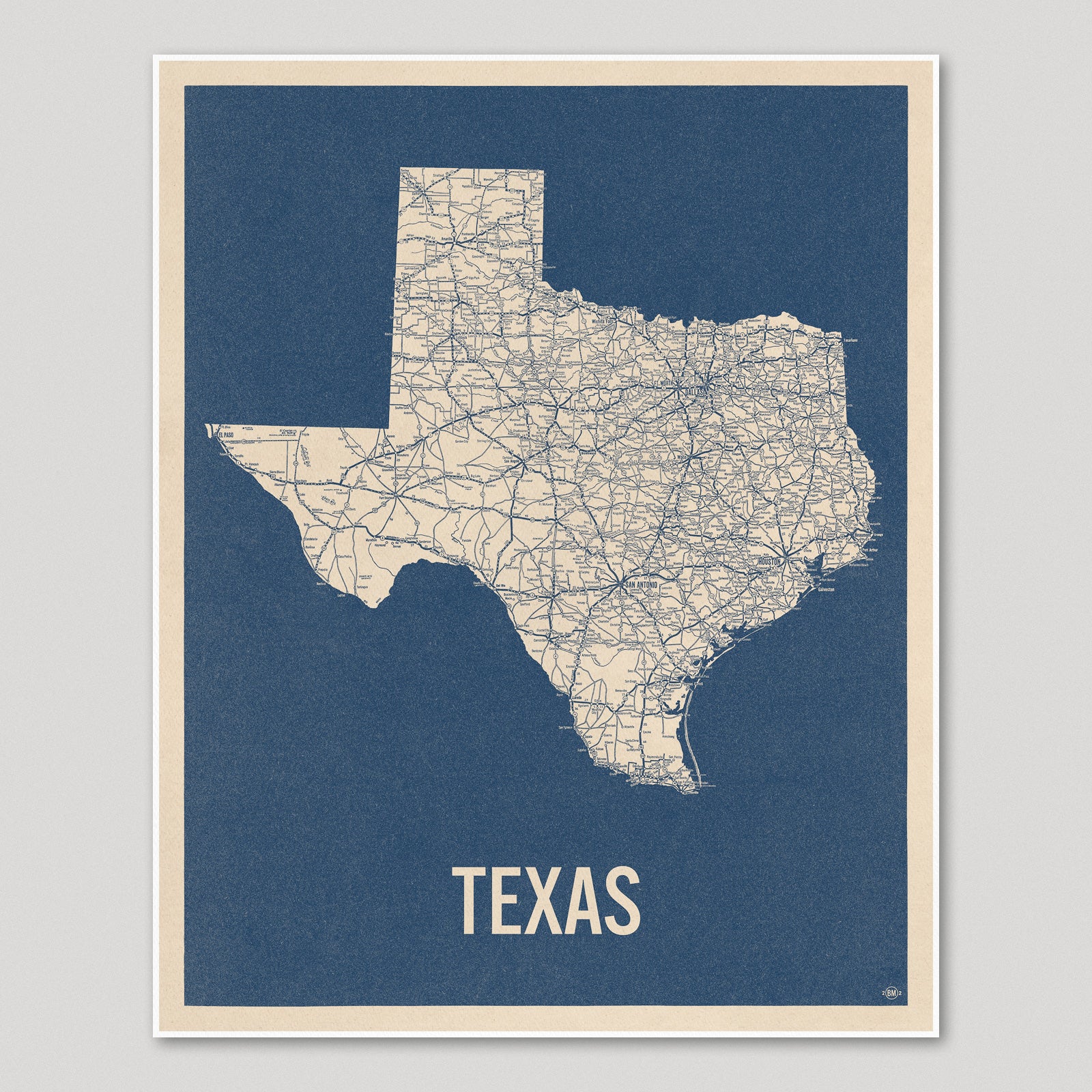 These map prints are a kind of hybrid of old and new, vintage and modern. The details are based on a 1930s highway maps, but the presentation is much more modern (almost minimalist) with bold use of only two colors – beige and dark blue – to make the state pop out of its frame. At the same time, these two colors evoke a more traditional, almost rustic style that works well in most styles of home decor.