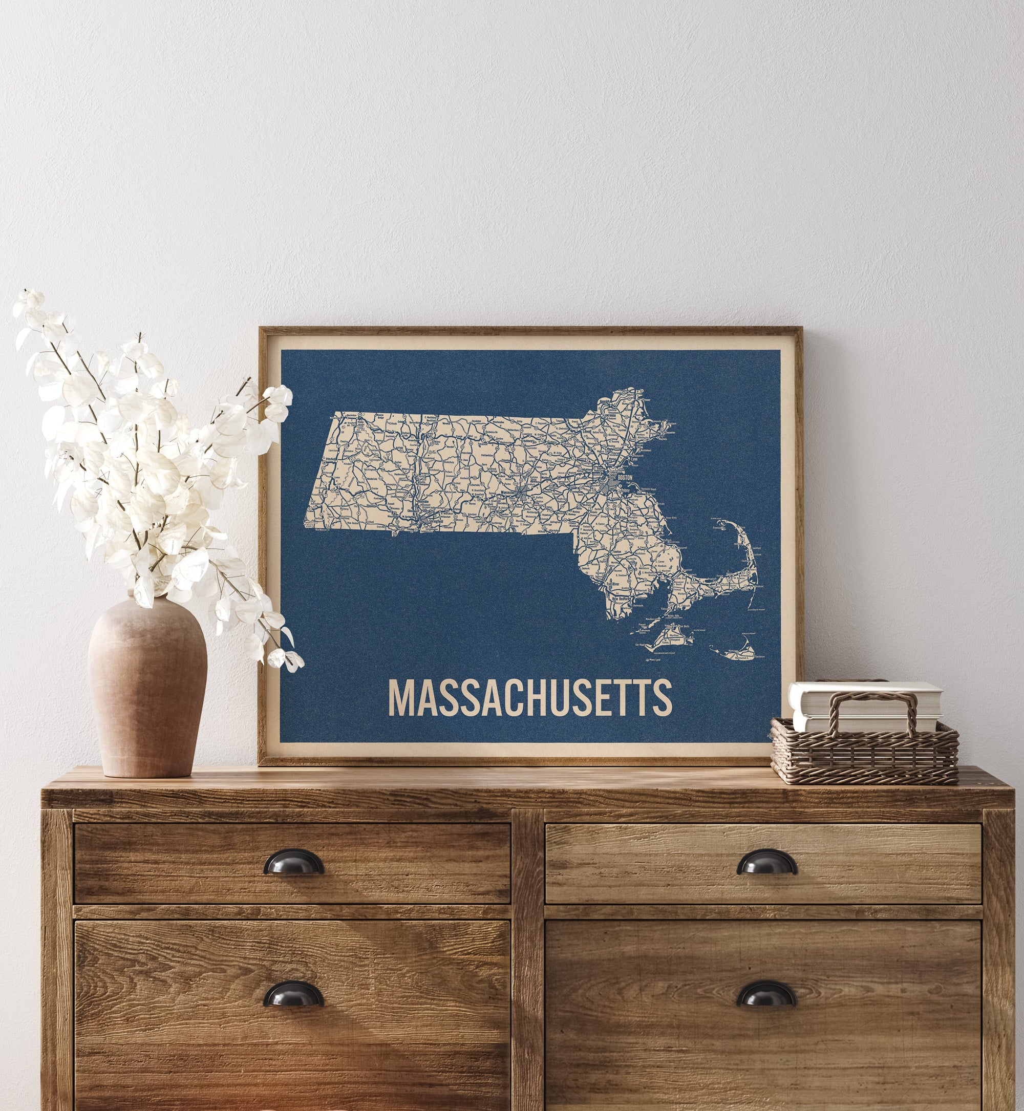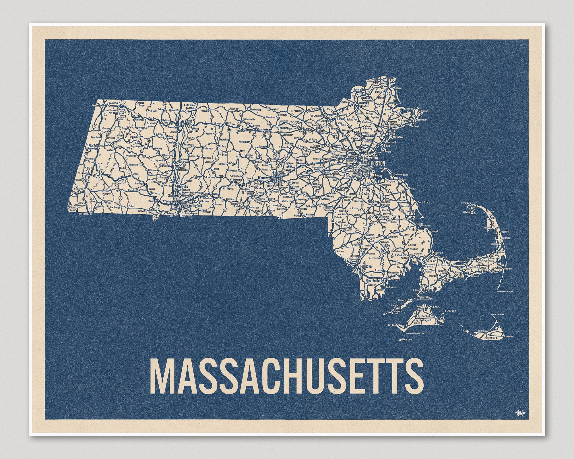 Archival art print based on a vintage 1930s highway map of Massachusetts, blue on beige.