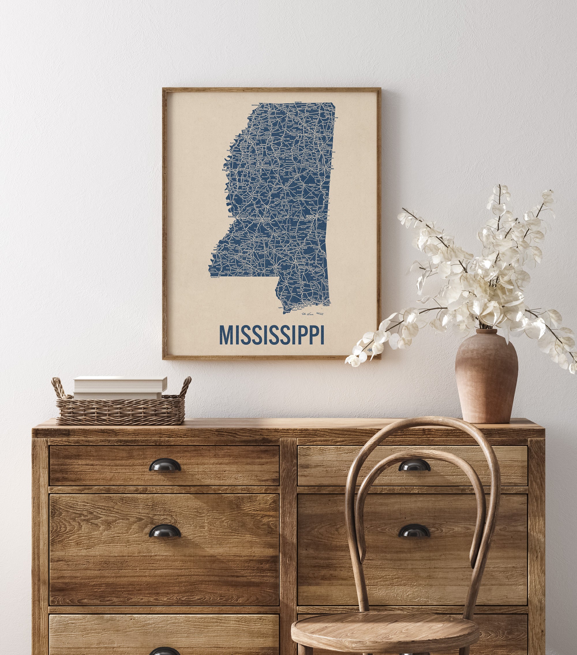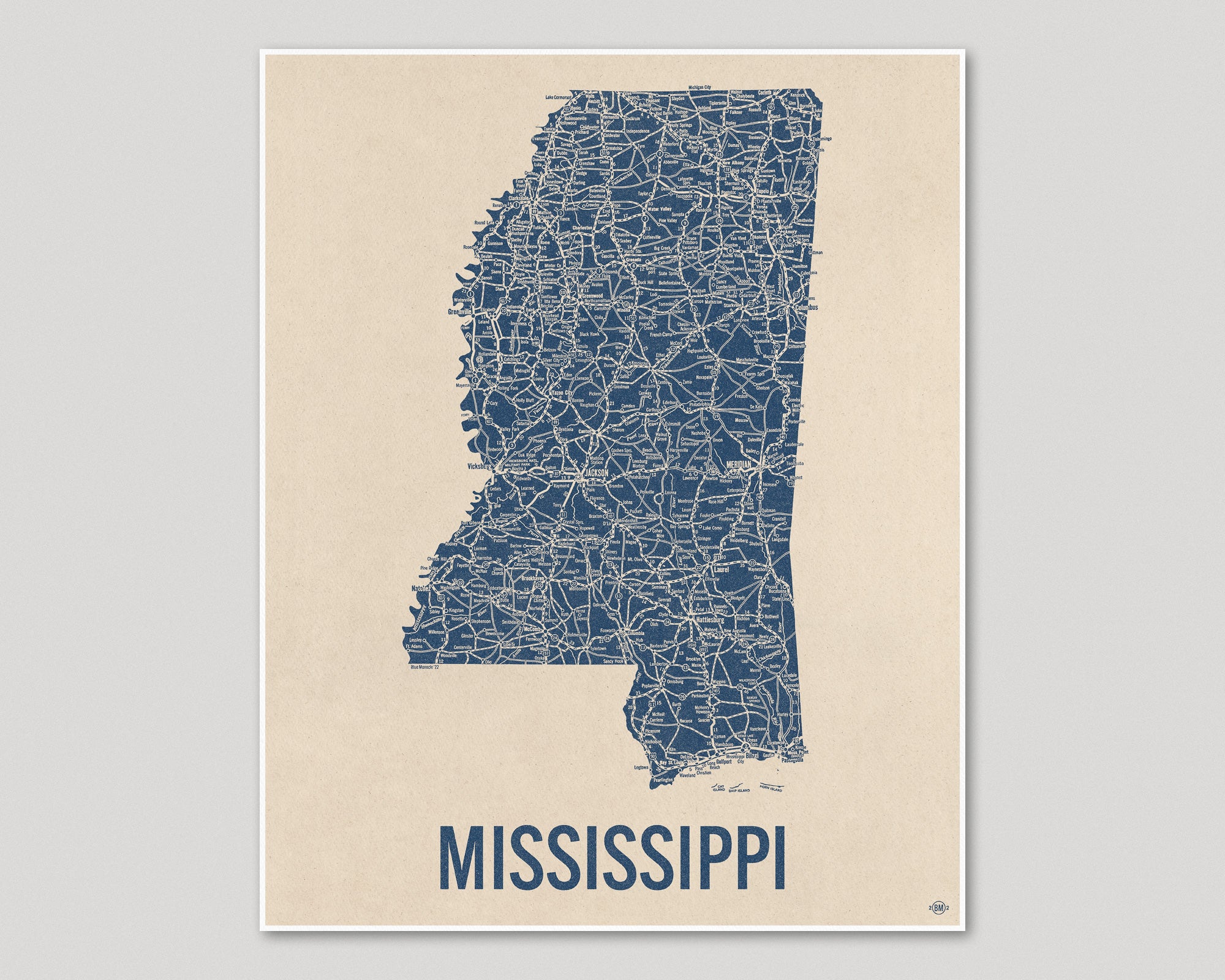 Archival art print based on a vintage 1930s highway map of Mississippi, blue on beige.