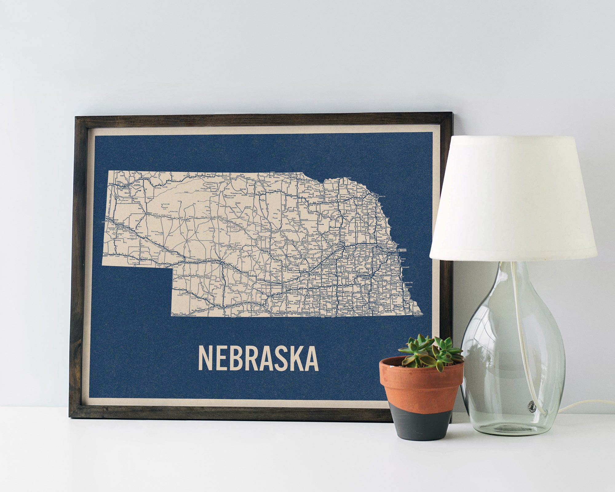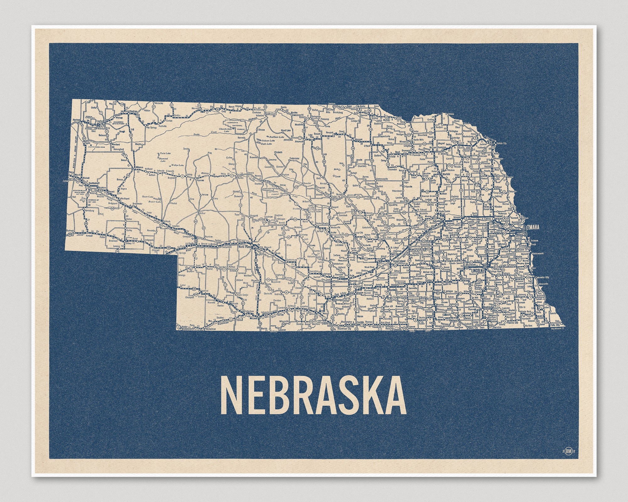 Archival art print based on a vintage 1930s highway map of Nebraska, blue on beige.