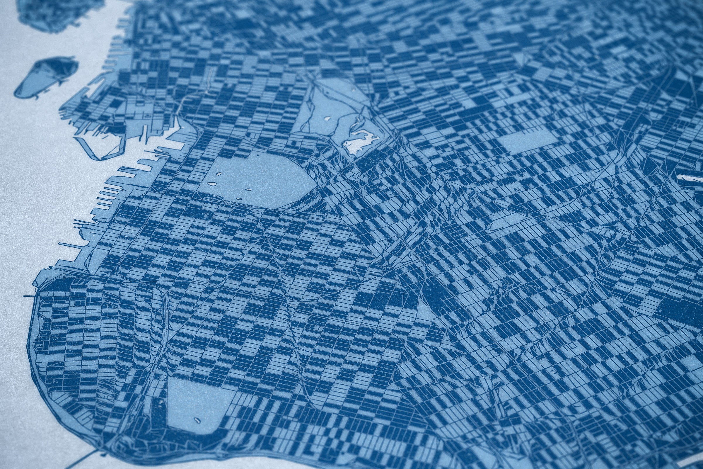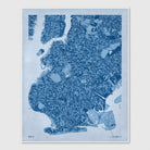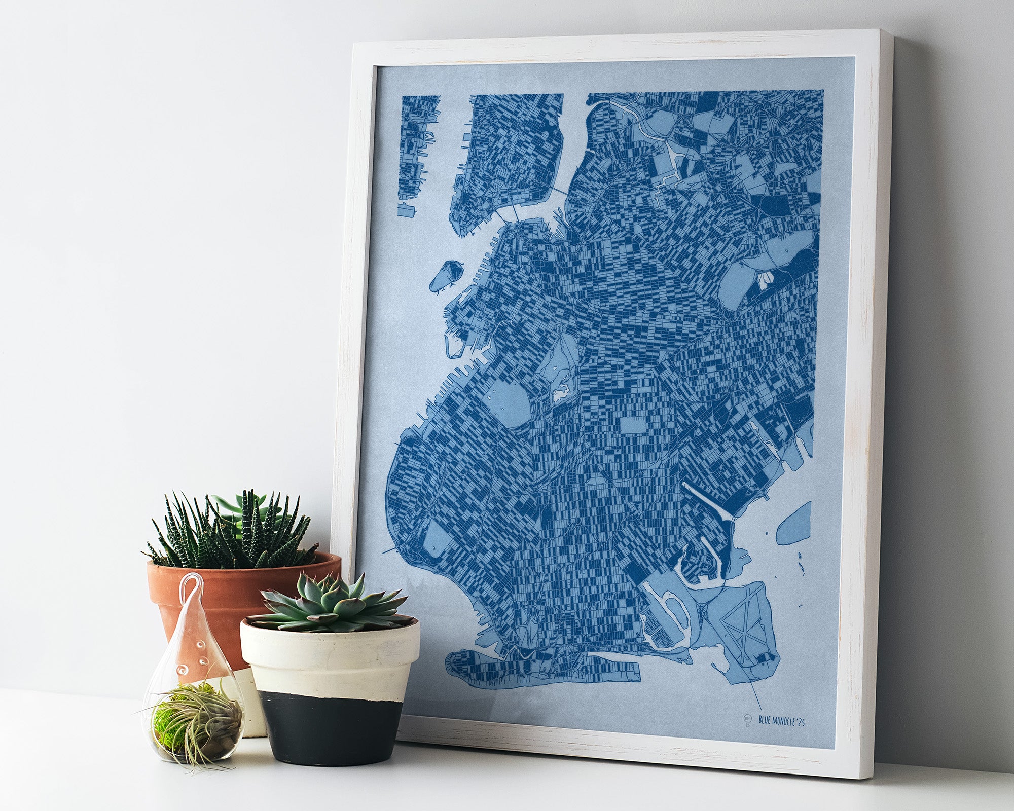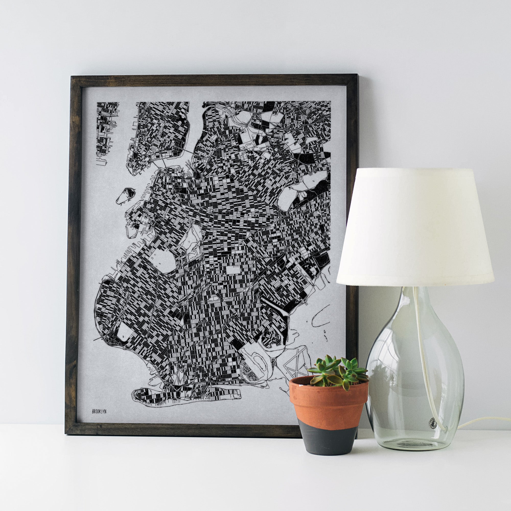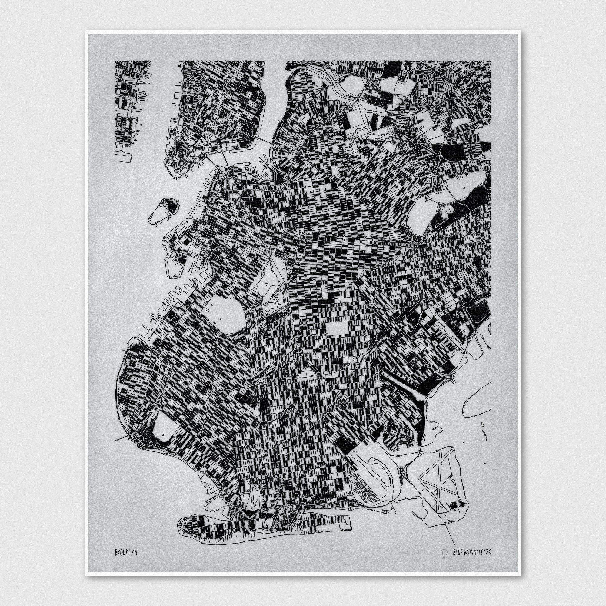 Archival art print of a modern street map of Brooklyn, NY in an abstract, geometric, hand-drawn style, available in blue or black/gray. Printed on 100% cotton, acid-free fine art paper with archival pigment inks.