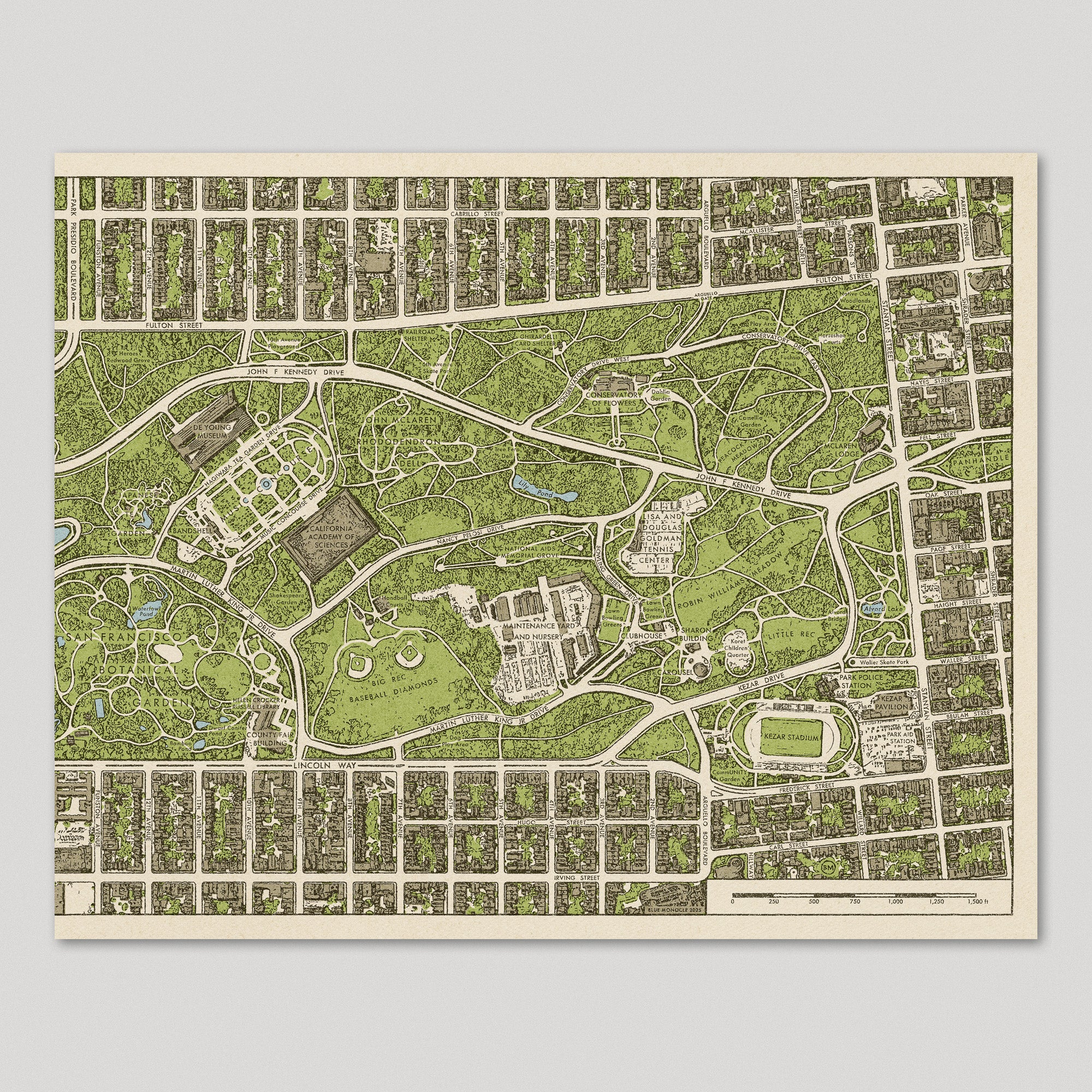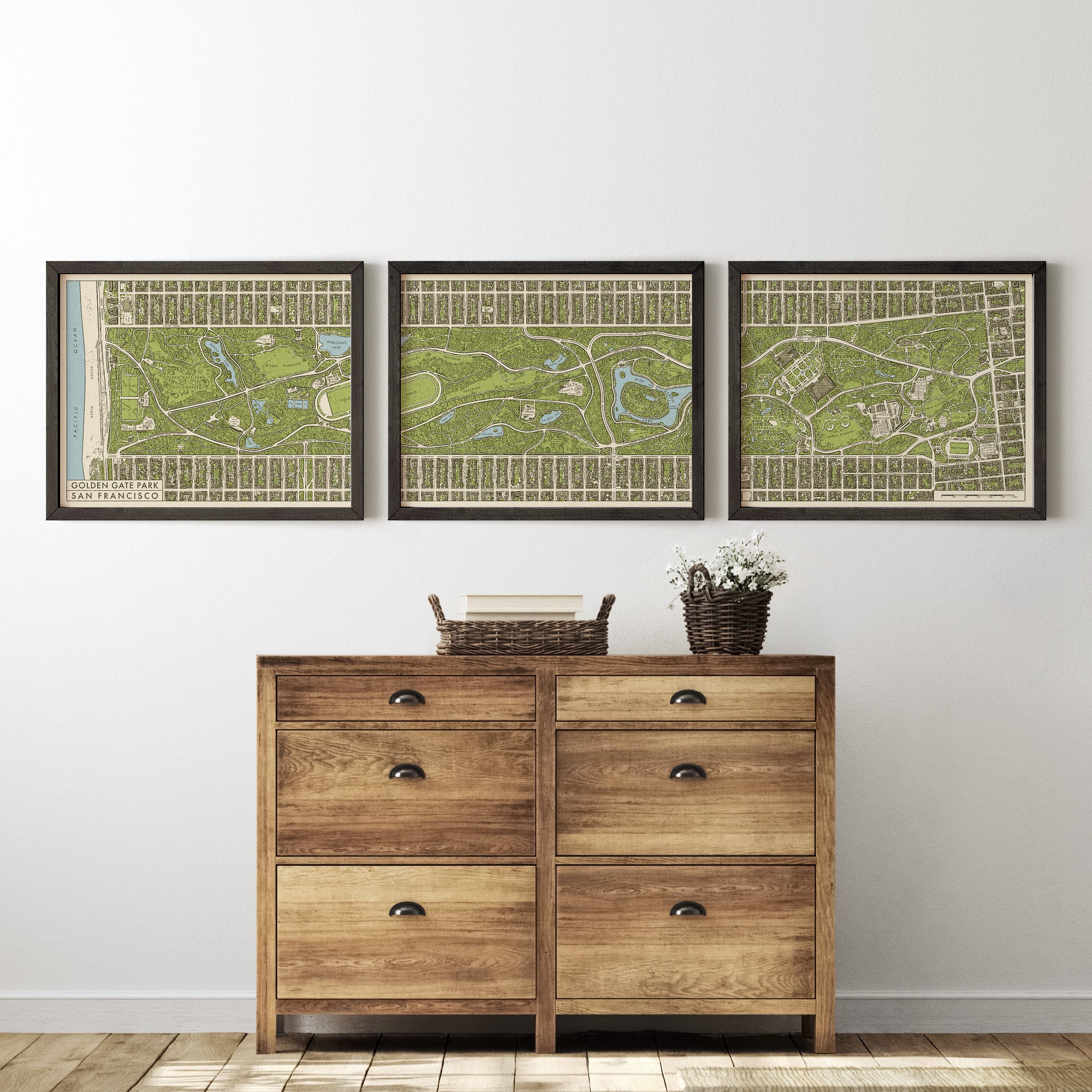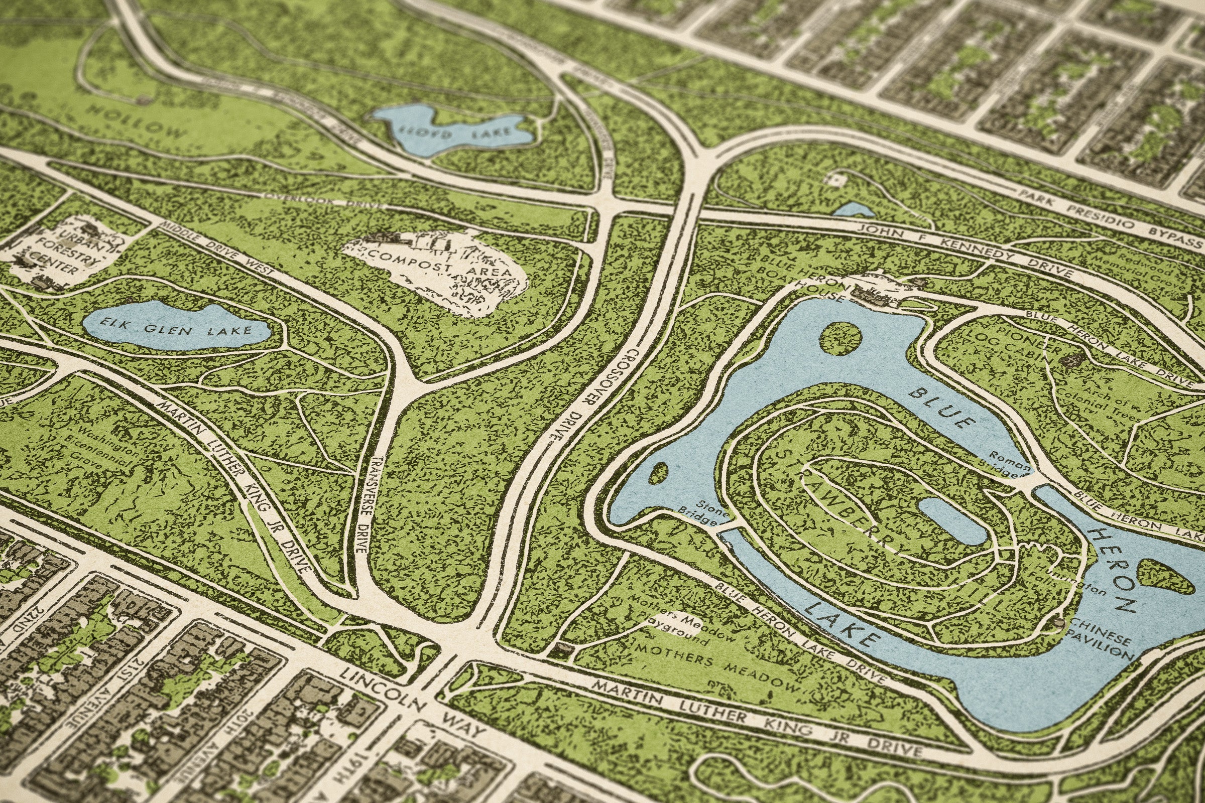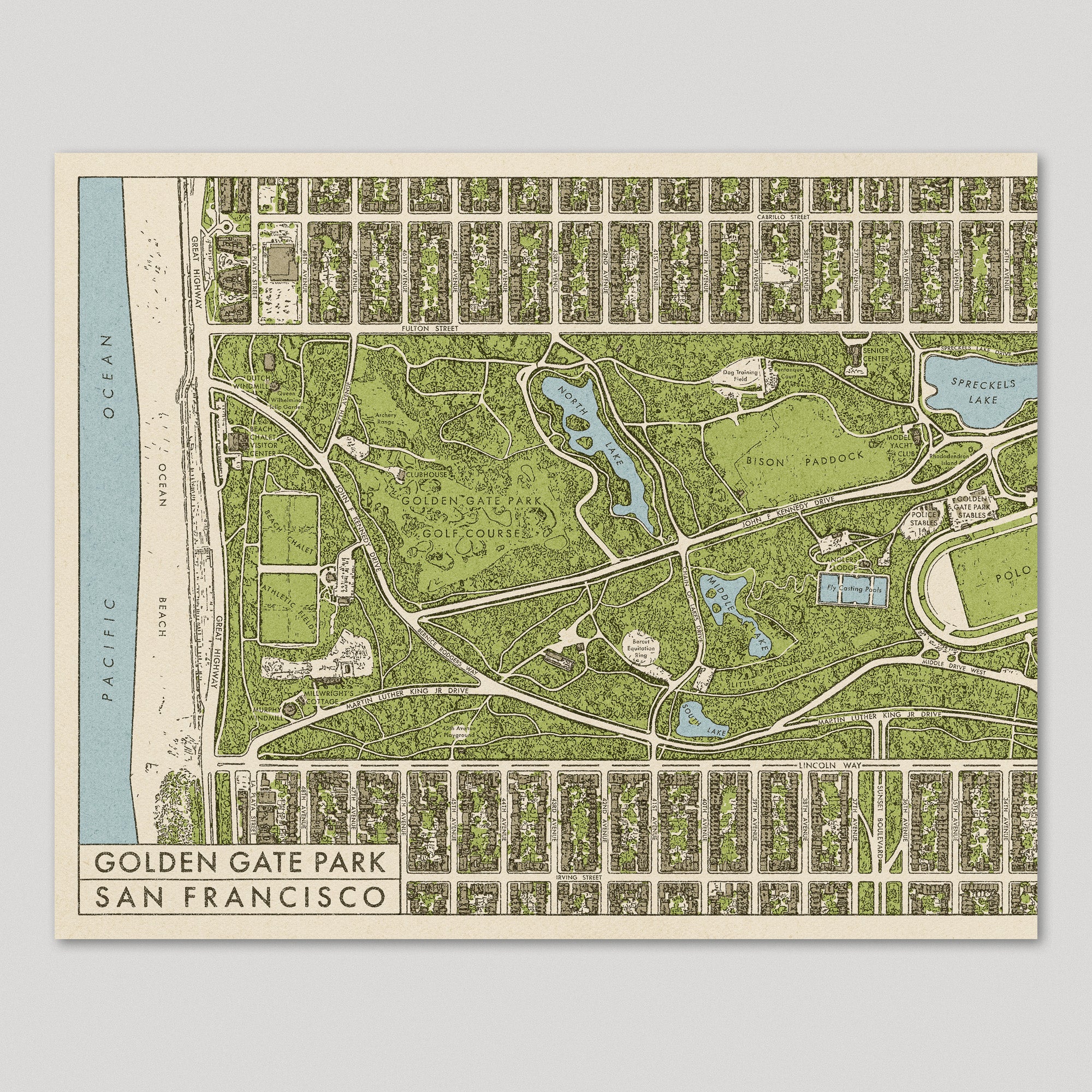 Archival art print set of a modern map of Golden Gate Park in San Francisco available as a set of three prints. The map is designed to evoke an older, somewhat midcentury style, and contains numerous details, including: streets, paths, park buildings, meadows, forests, lakes and ponds, playgrounds, athletic fields, and more. Also includes the San Francisco Botanical Garden, the de Young Museum, and the California Academy of Sciences.