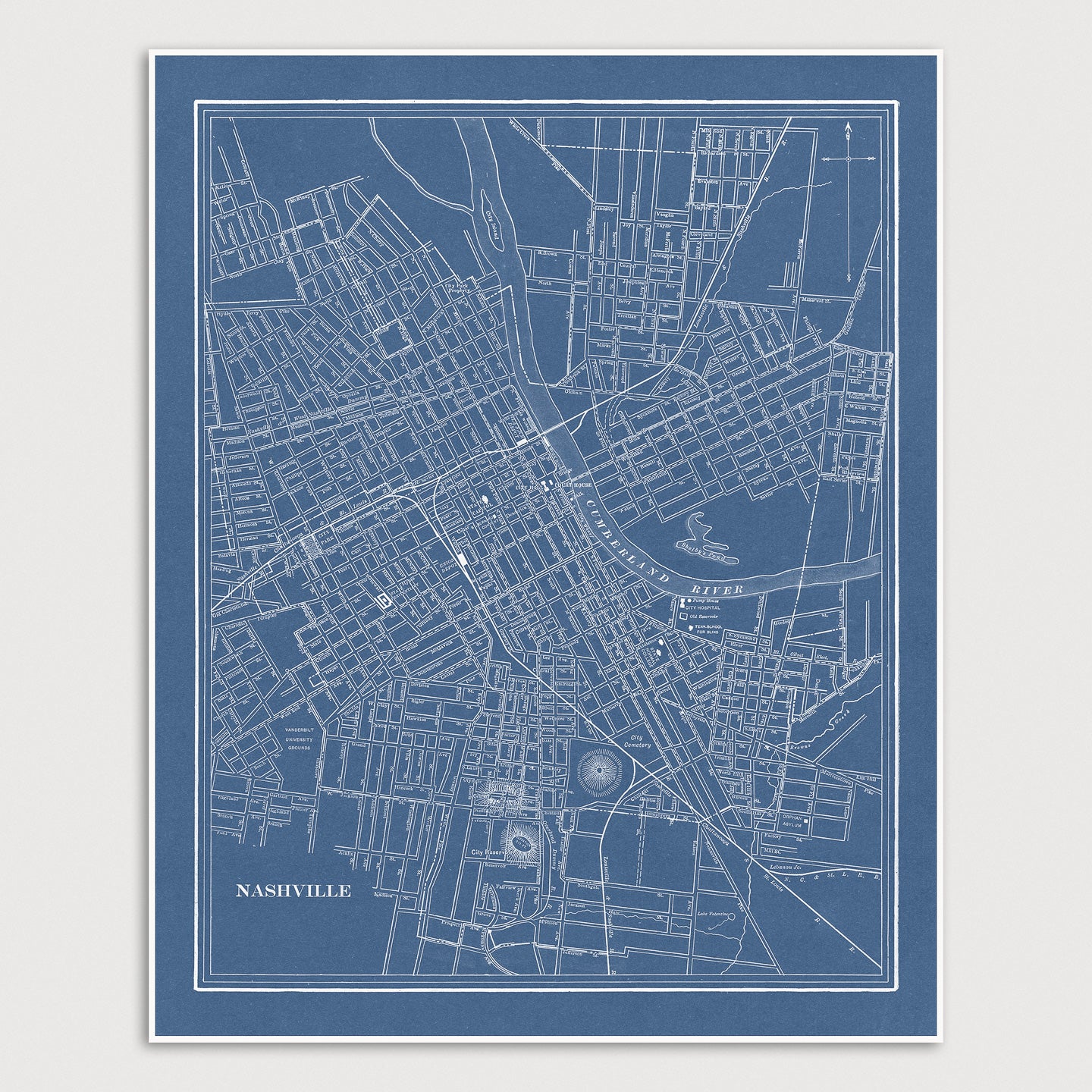 Archival art print in a blueprint style based on an antique map of Nashville, Tennessee from 1901 by George Franklin Cram. Covers an area from Douglas Ave. (East Nashville) in the north to about Wedgewood Ave. in the south, and from 14th St. in the east to Vanderbilt University in the west.