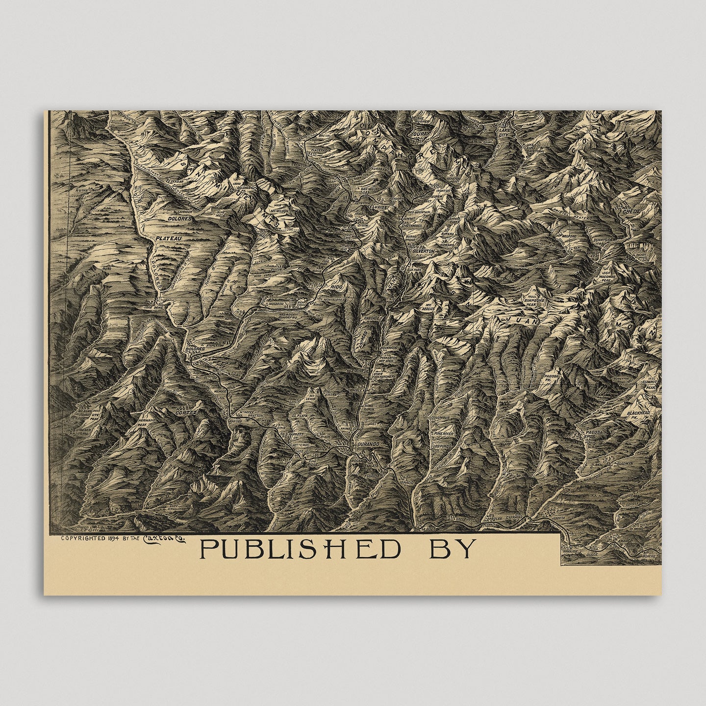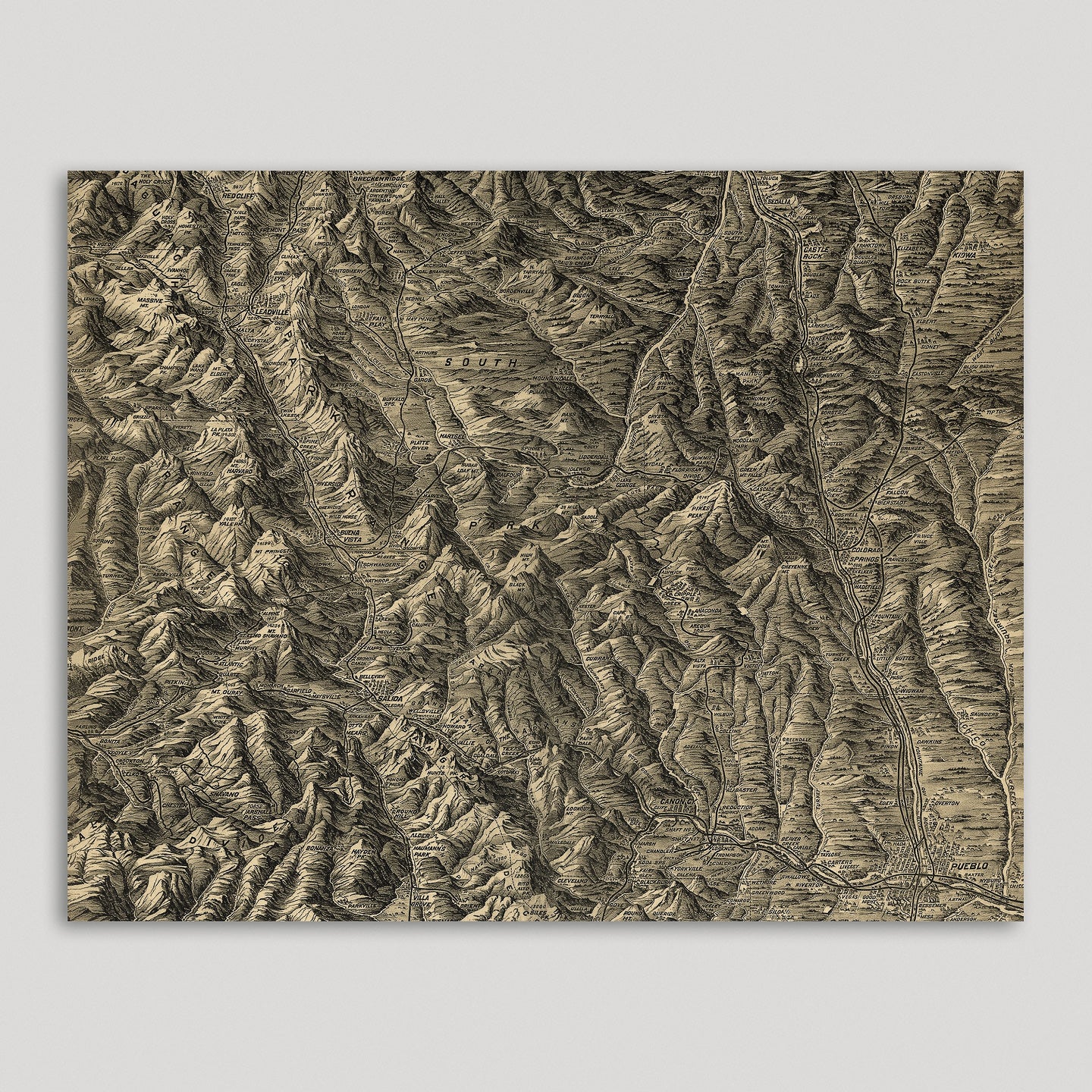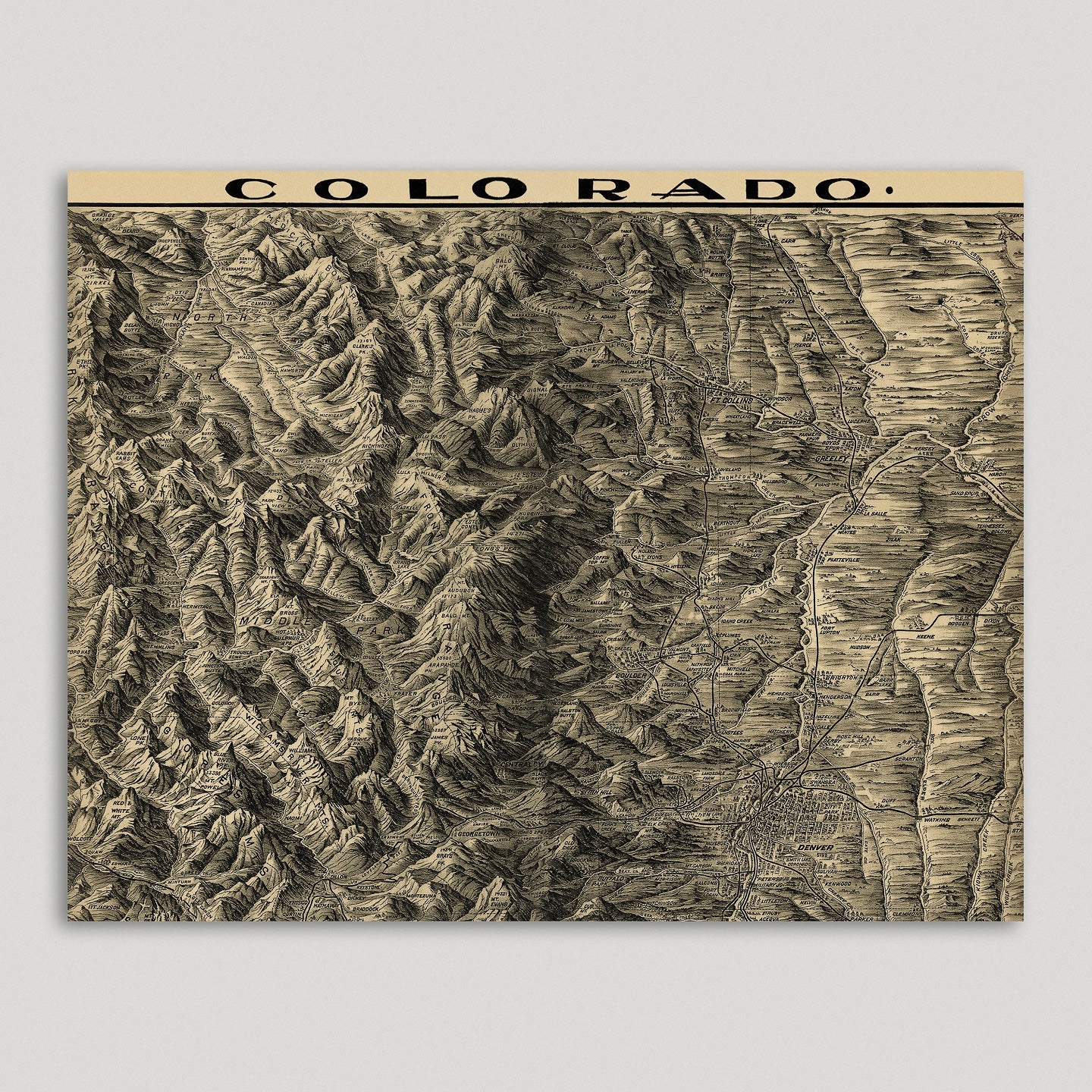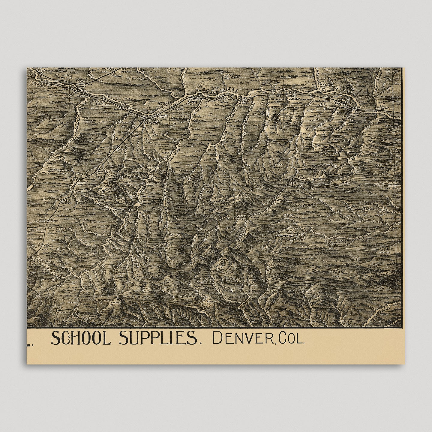 Archival print reproduction of an antique map of Colorado from 1894 by Frank Pezolt. Originally produced as a wall map for classrooms in the 19th century, this detailed topographic map of Colorado includes numerous cities, towns, roads, rivers and peaks.