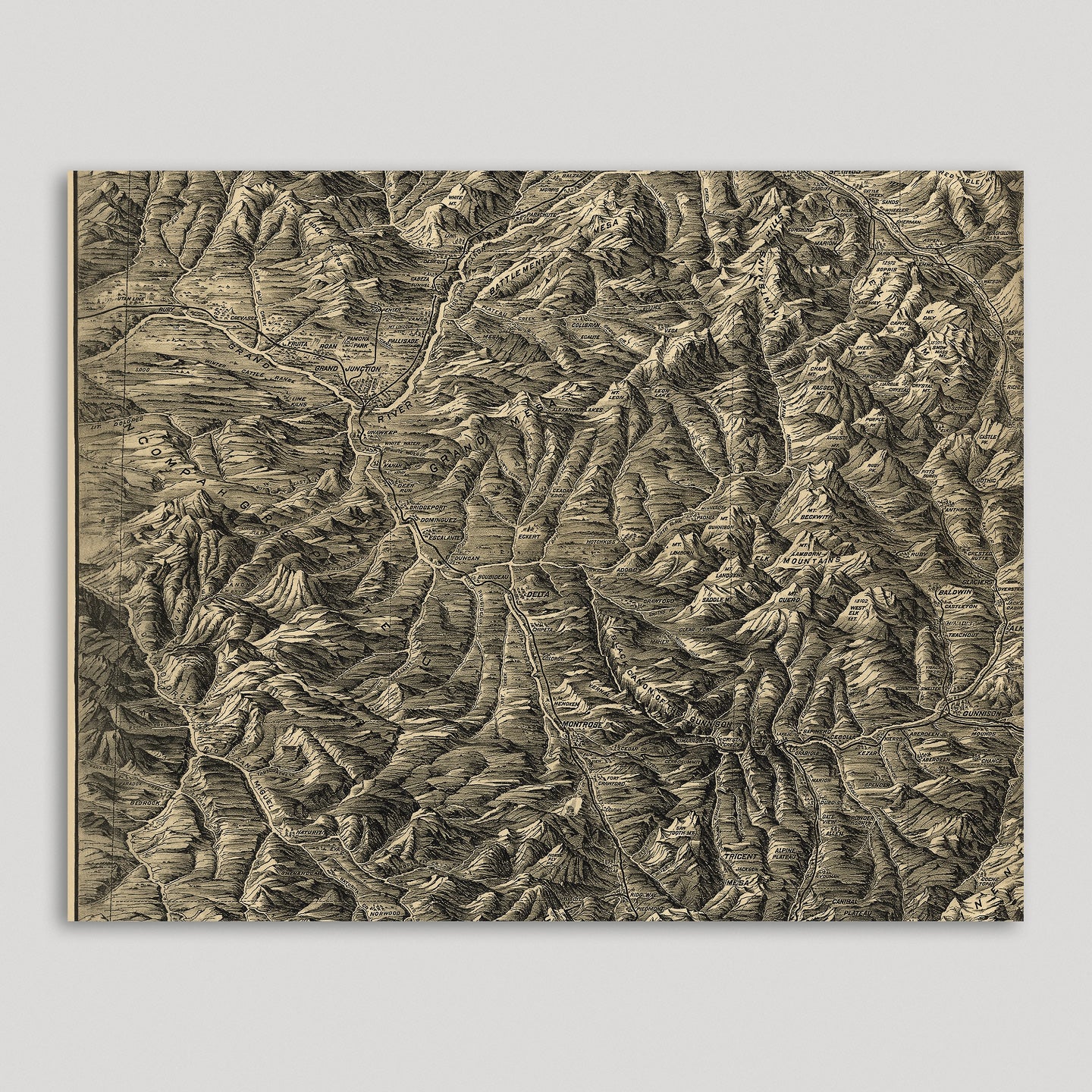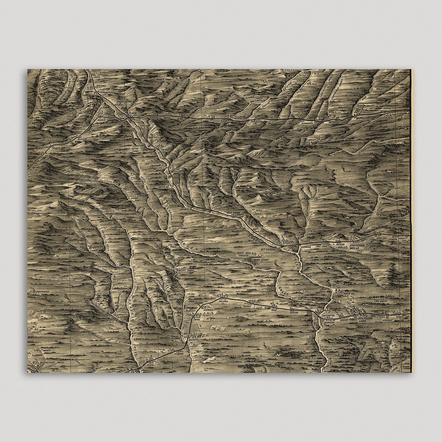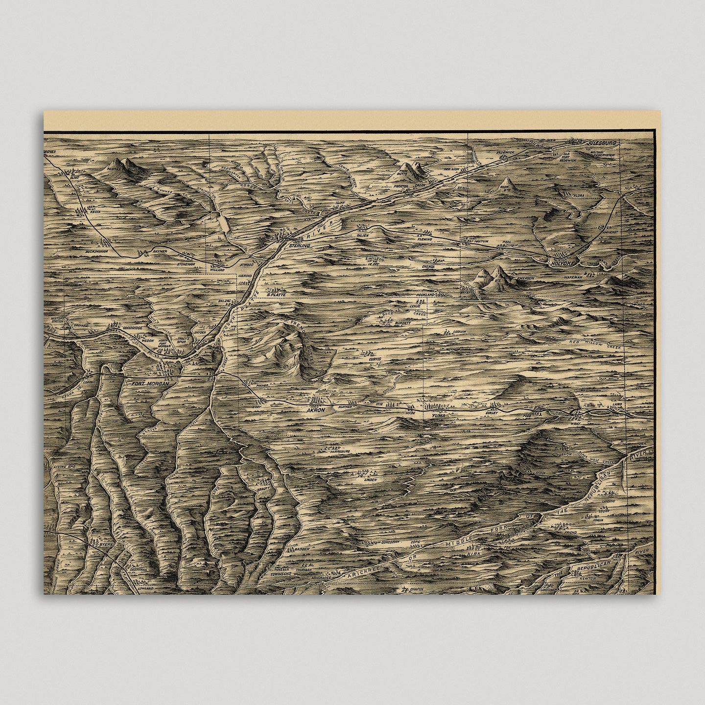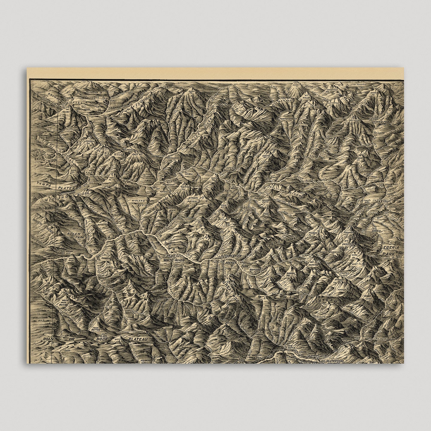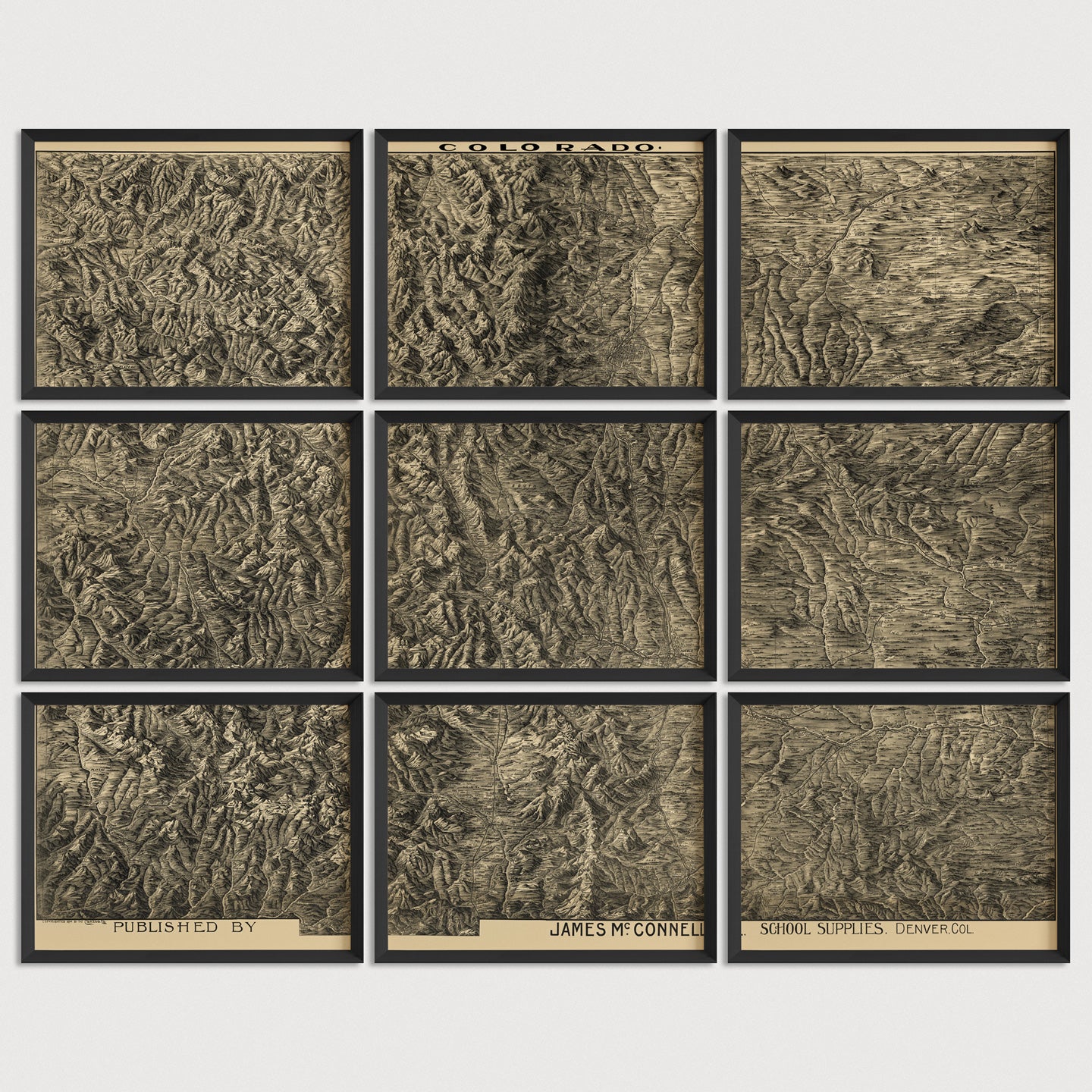 Archival print reproduction of an antique map of Colorado from 1894 by Frank Pezolt. Originally produced as a wall map for classrooms in the 19th century, this detailed topographic map of Colorado includes numerous cities, towns, roads, rivers and peaks.