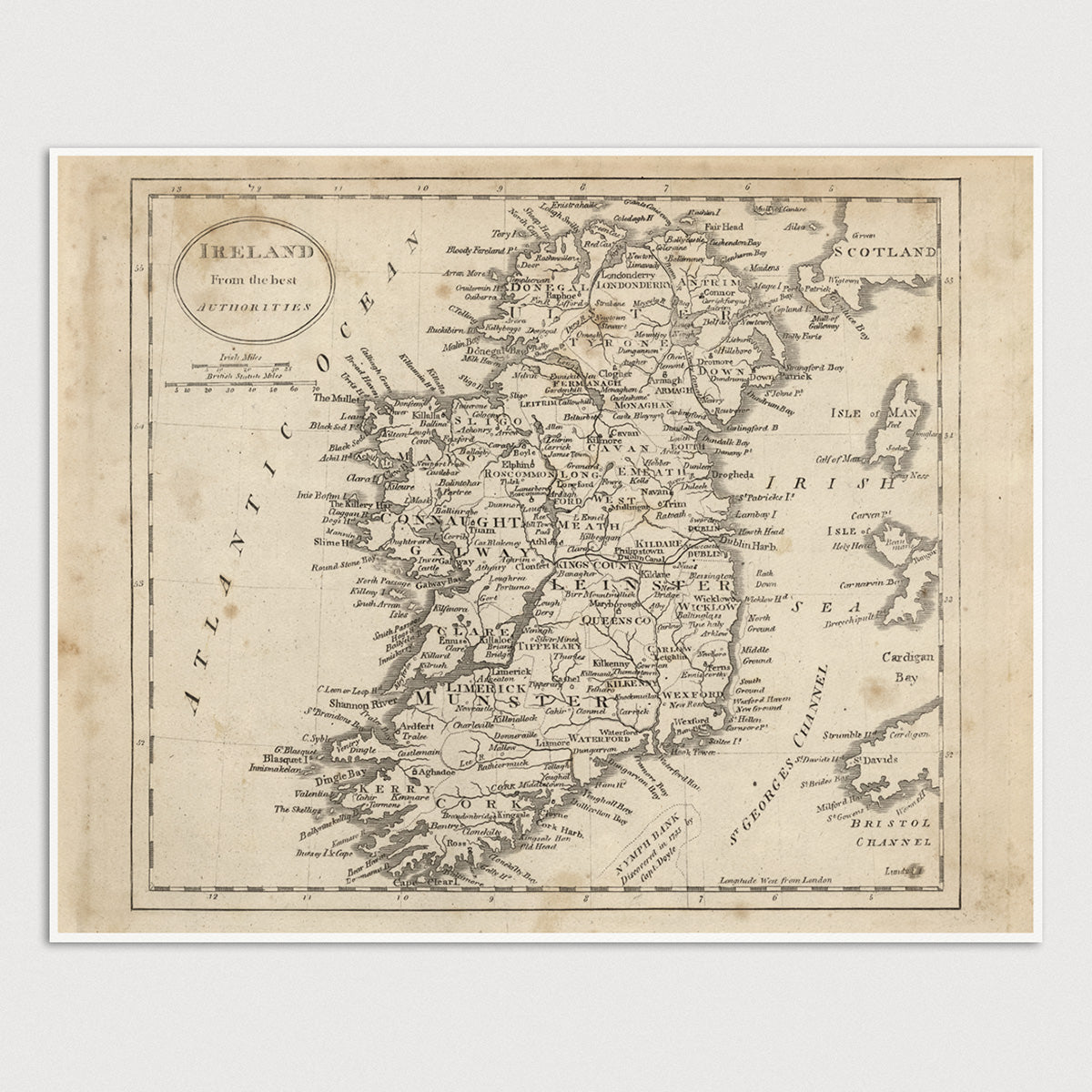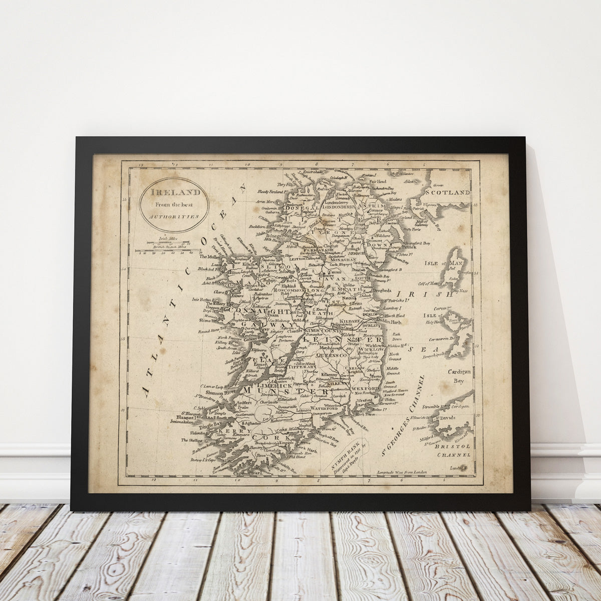 Archival print reproduction of an antique map of Ireland from 1816 by Mathew Carey.
