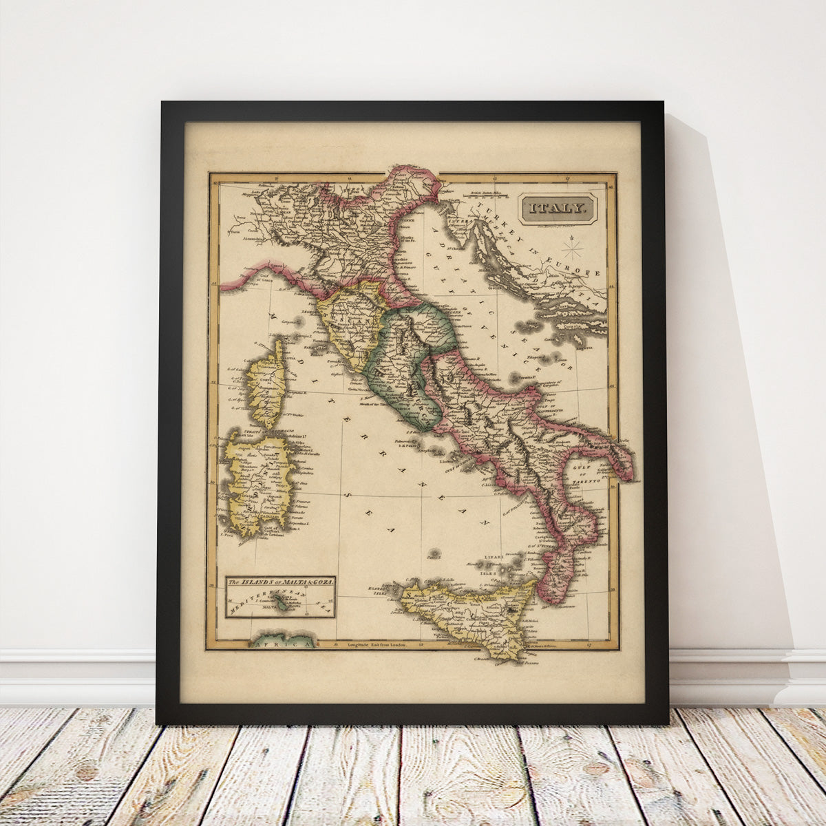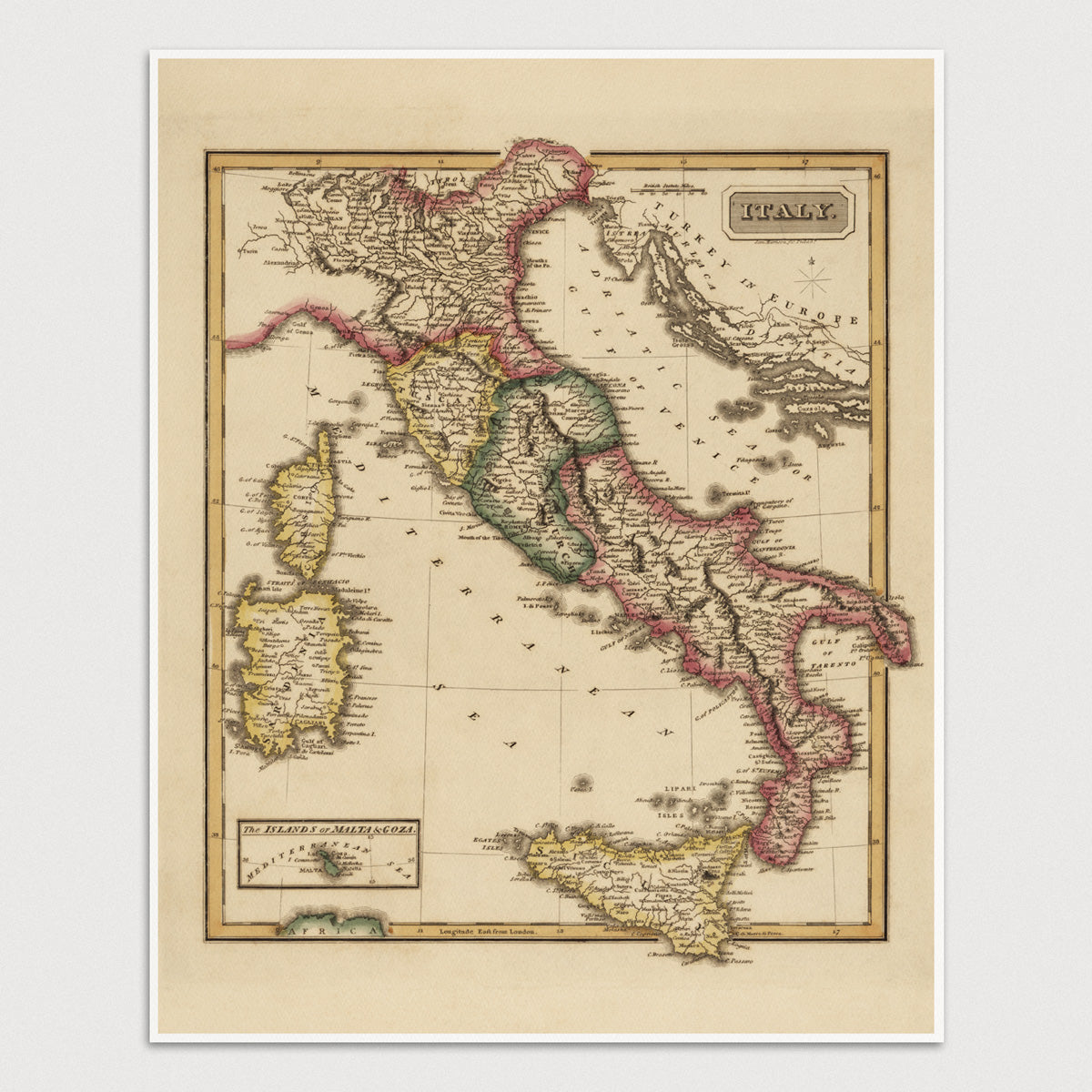 Archival print reproduction of an antique map of Italy from c1817 by Fielding Lucas.