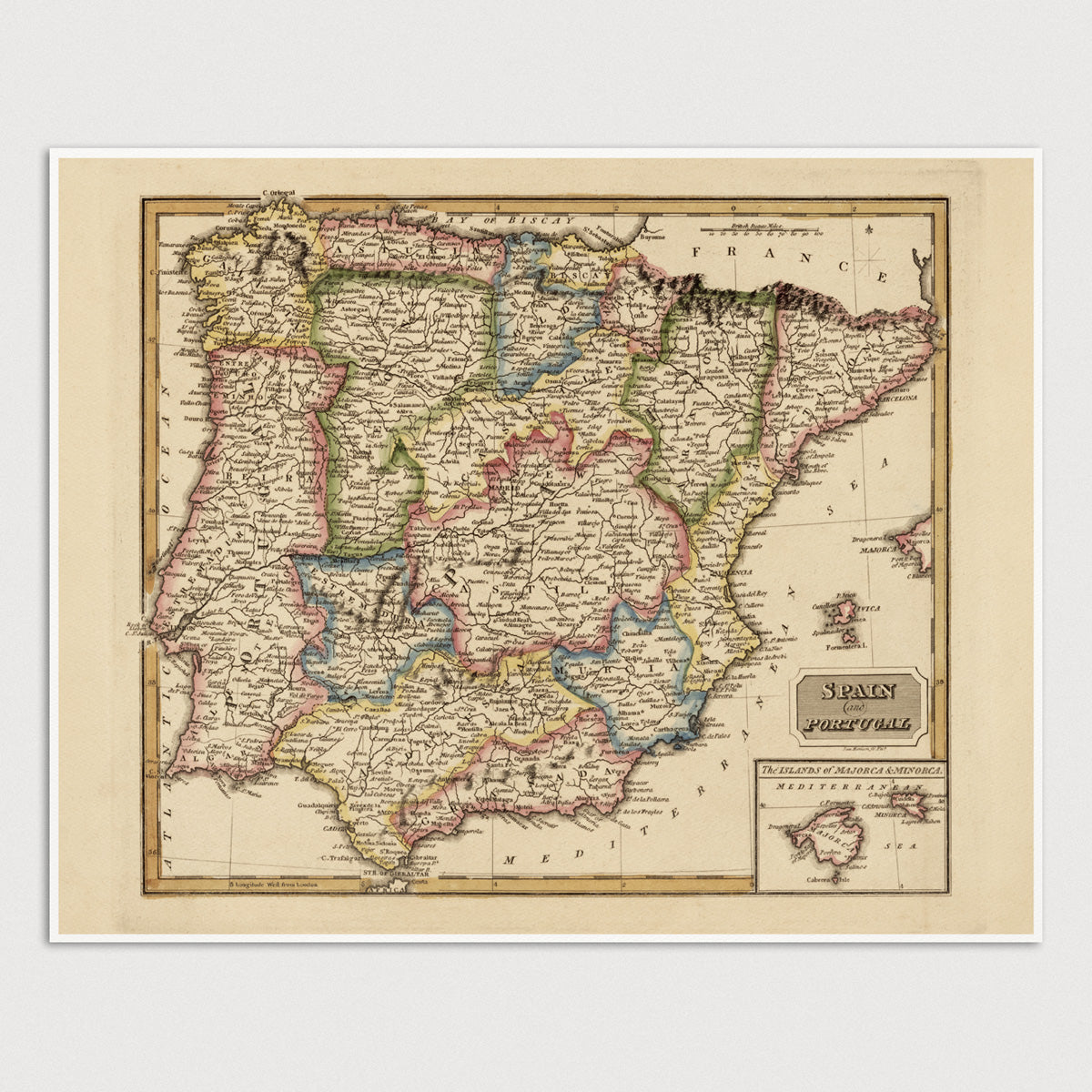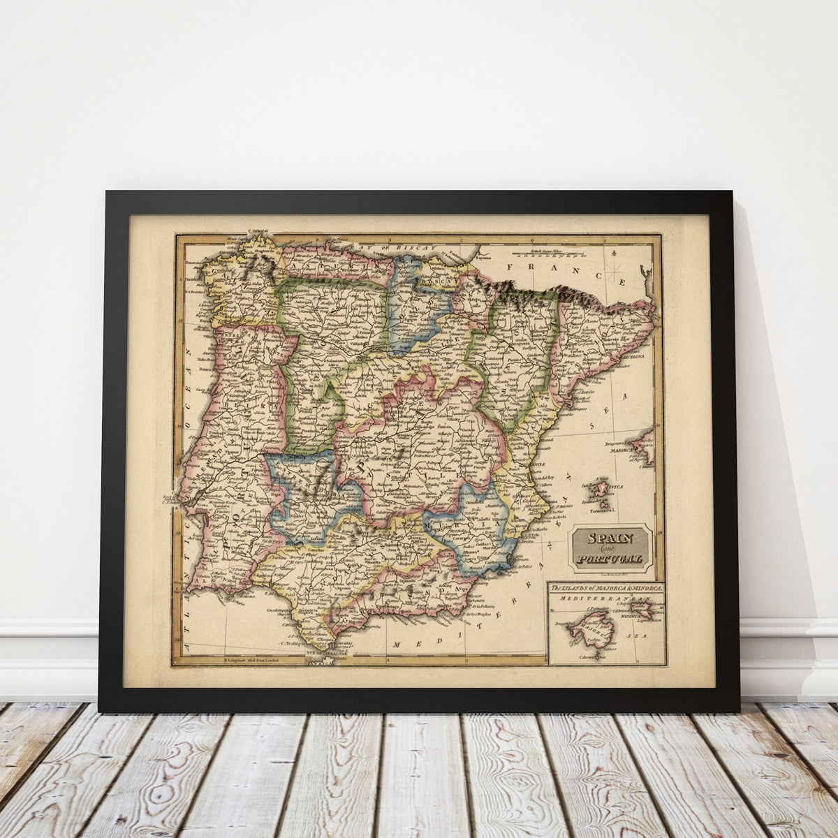 Archival print reproduction of an antique map of Portugal and Spain from c1817 by Fielding Lucas.