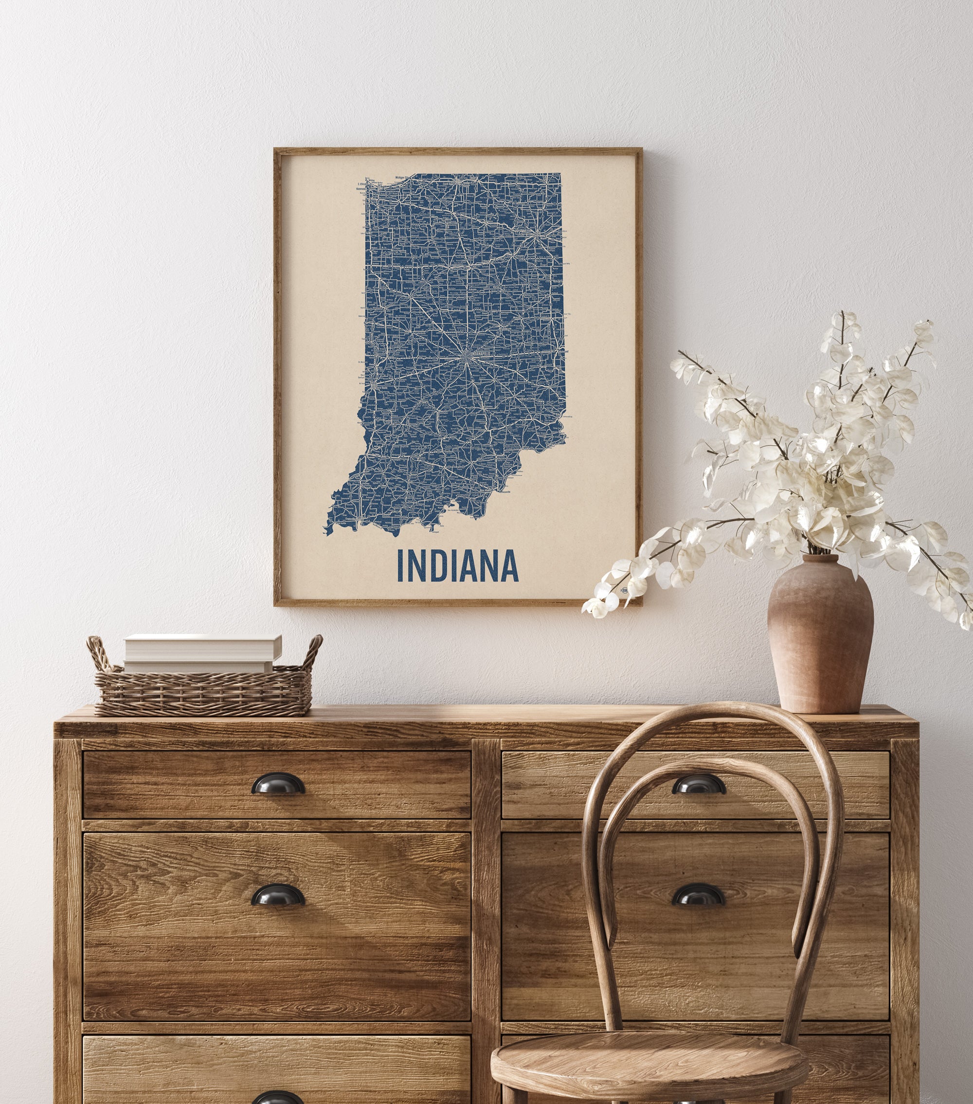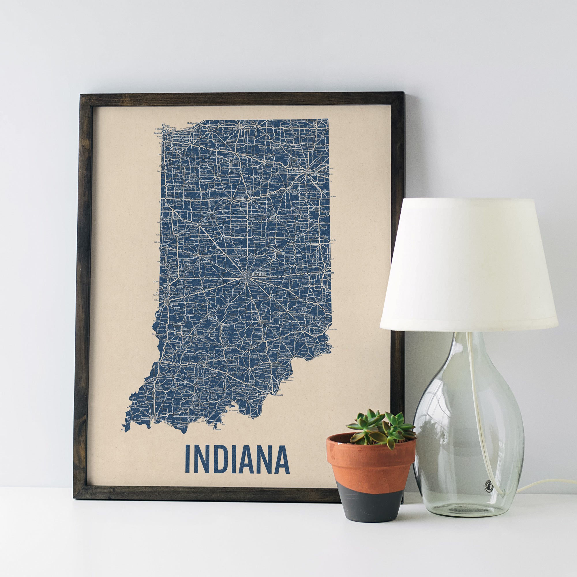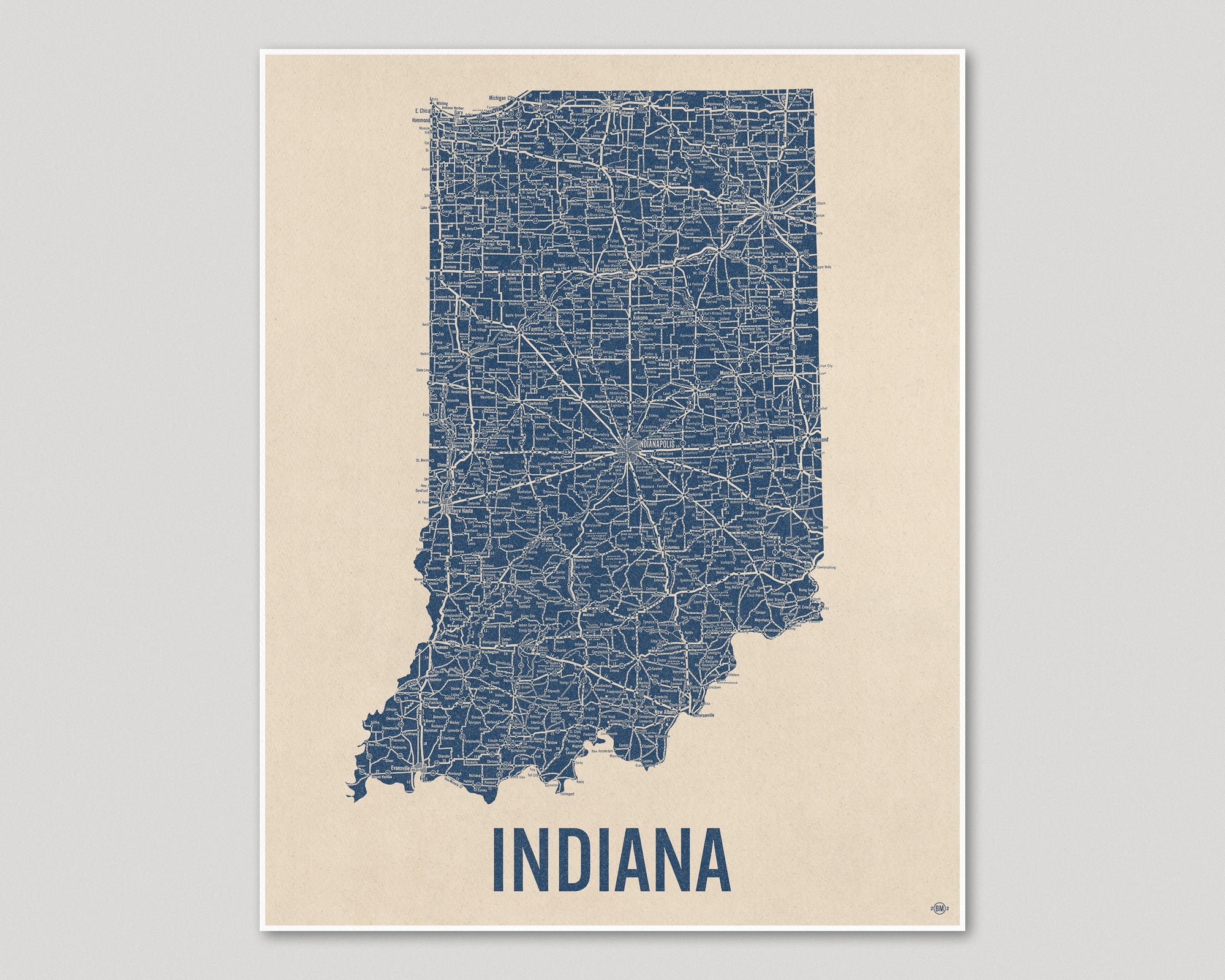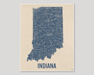 Archival art print based on a vintage 1930s highway map of Indiana, blue on beige.