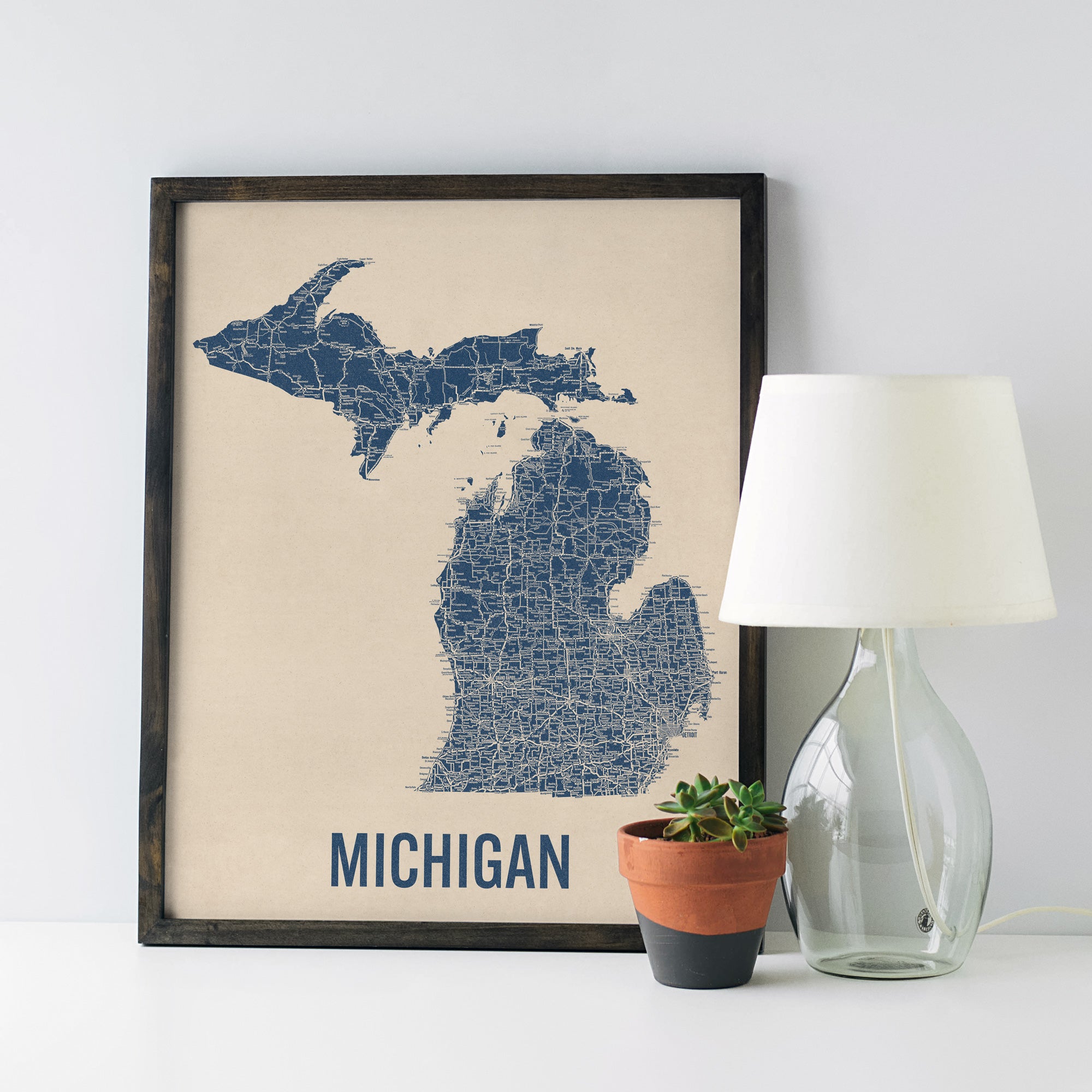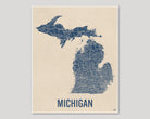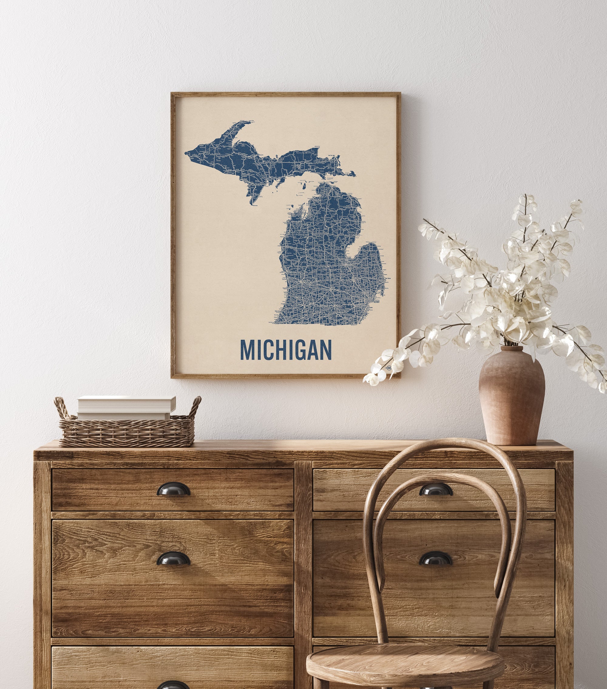 Archival art print based on a vintage 1930s highway map of Michigan, blue on beige.