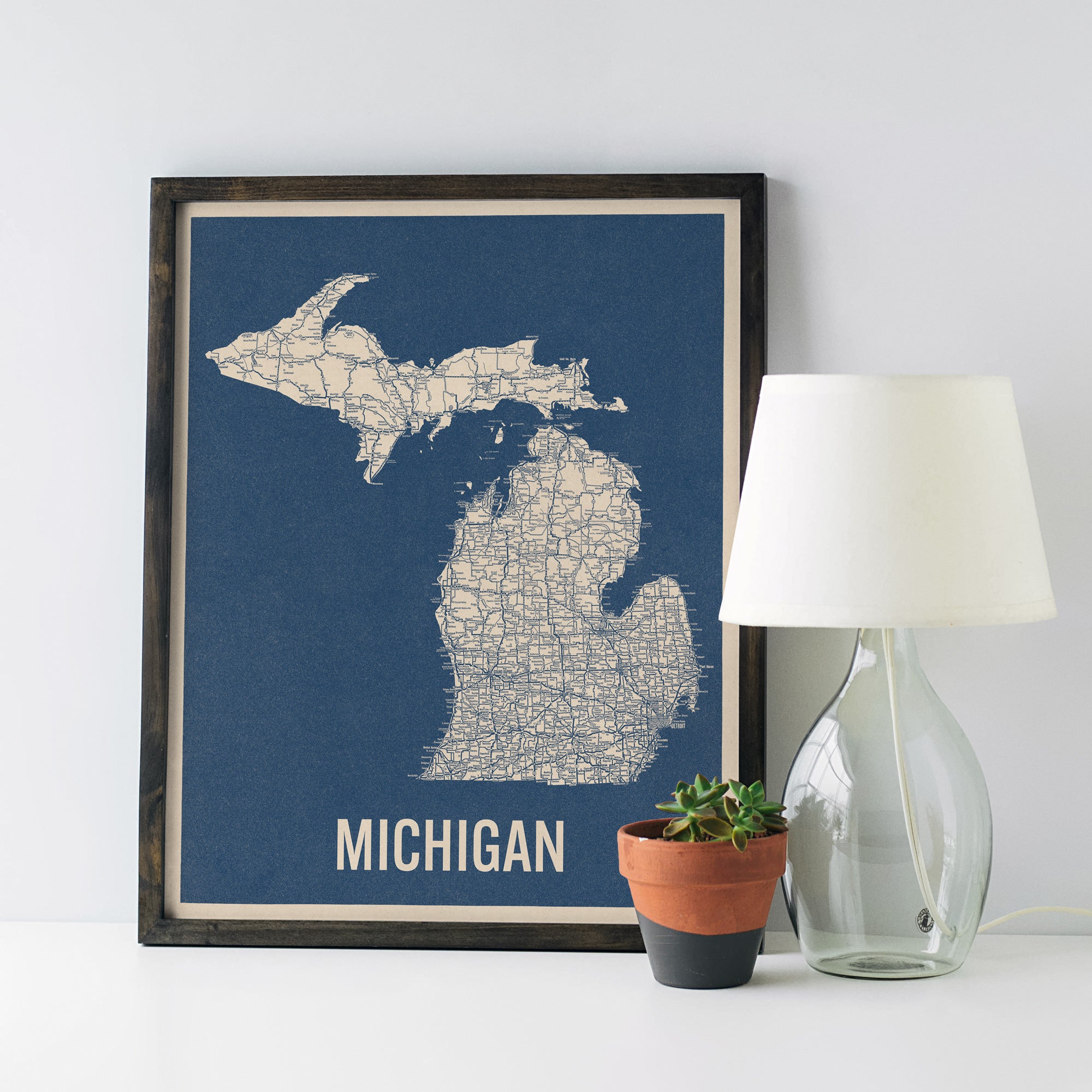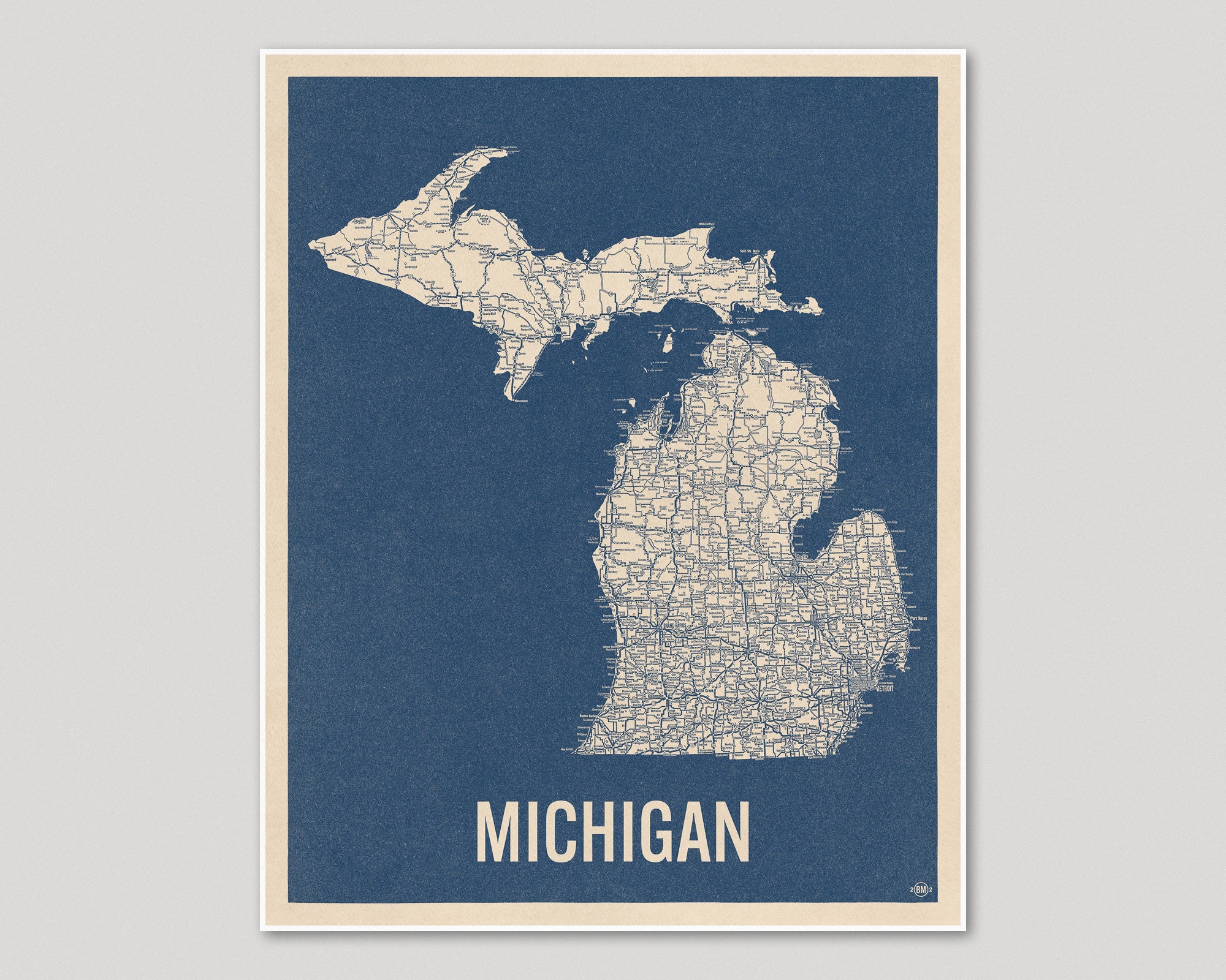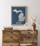 Archival art print based on a vintage 1930s highway map of Michigan, blue on beige.