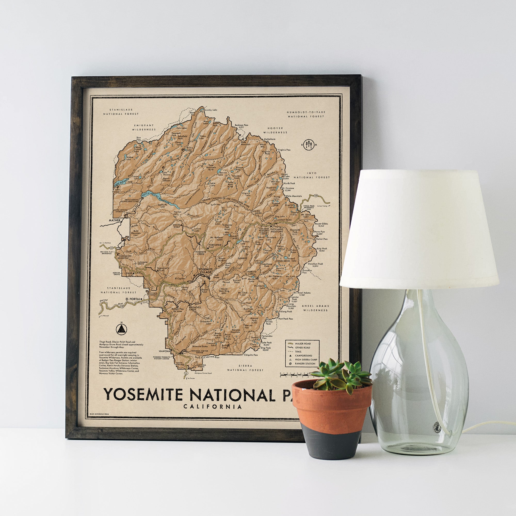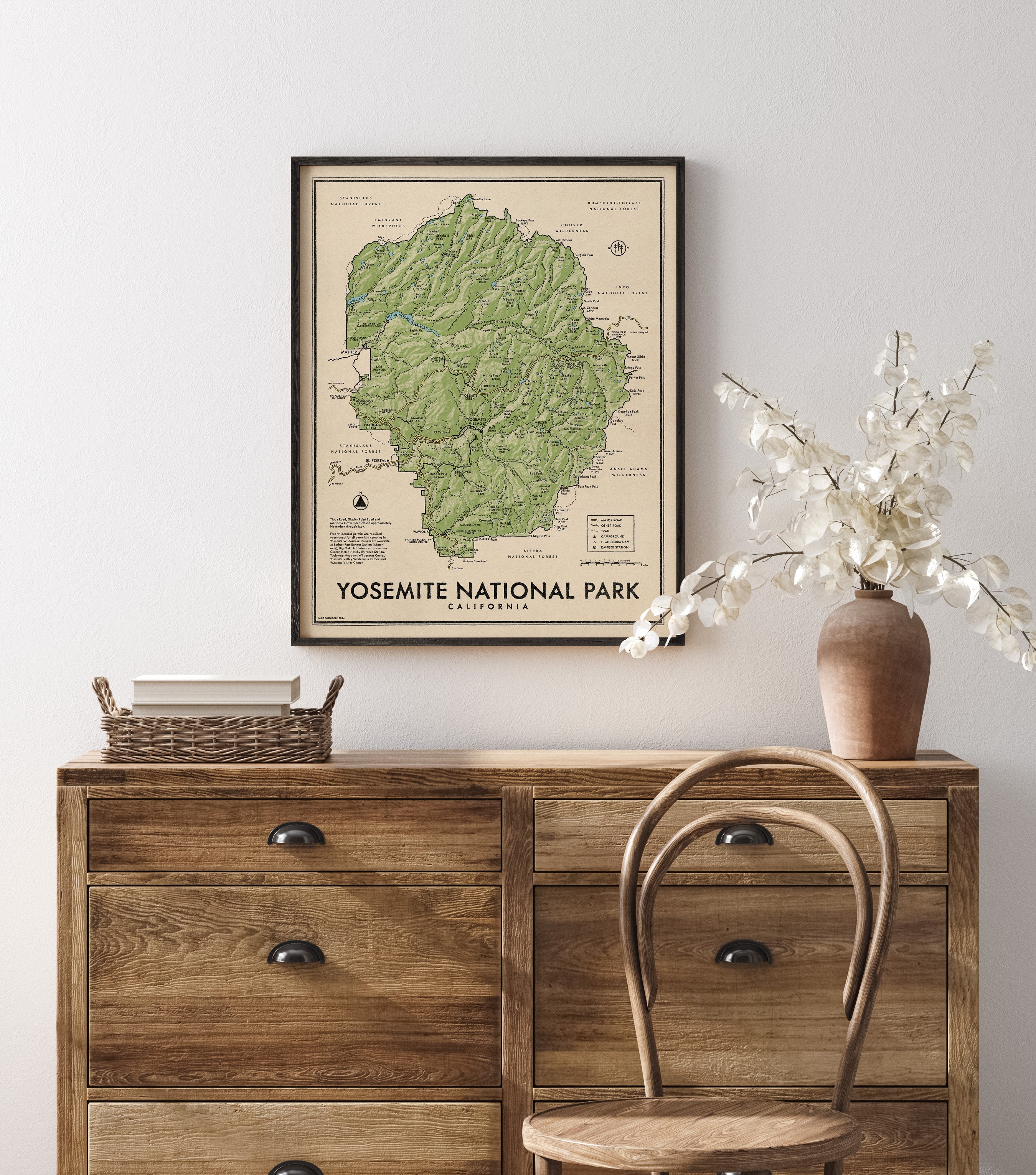 Yosemite National Park Map Art Print, Green or Brown, Vintage Style