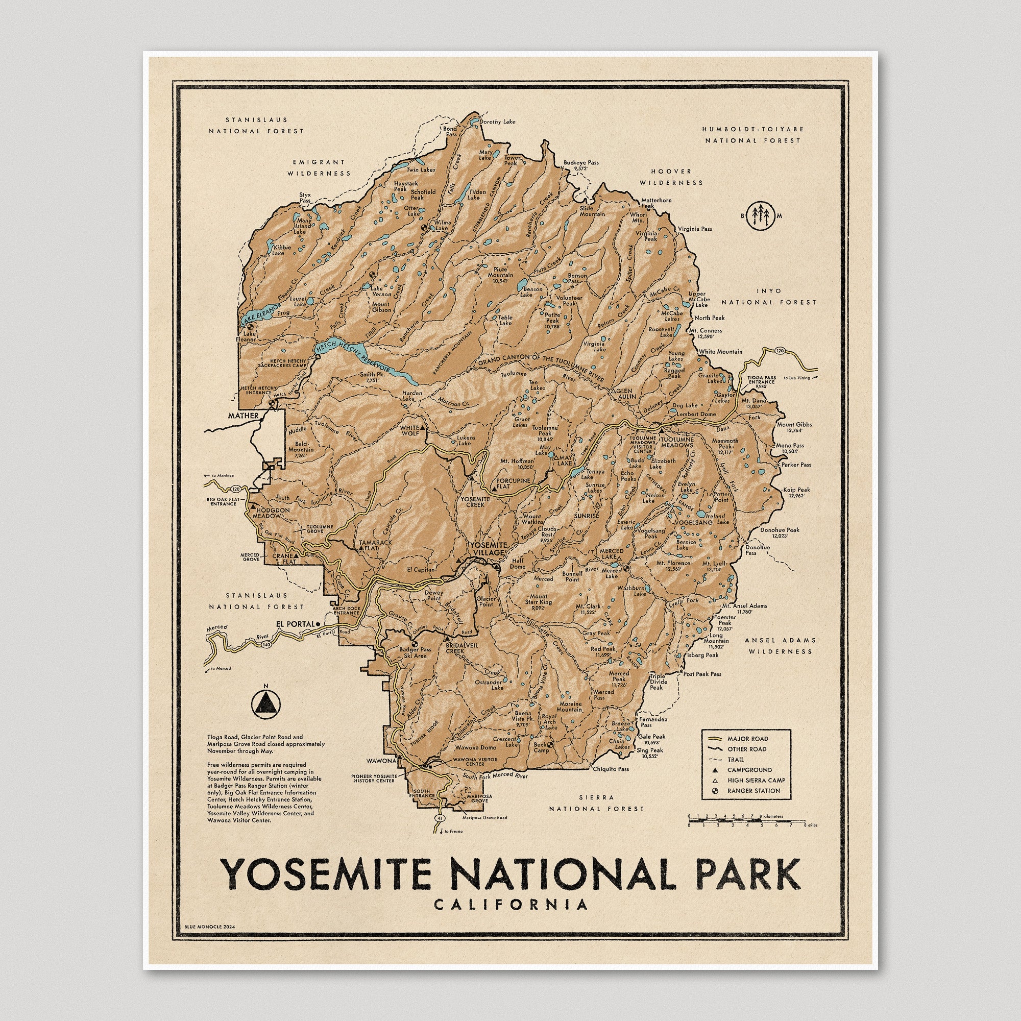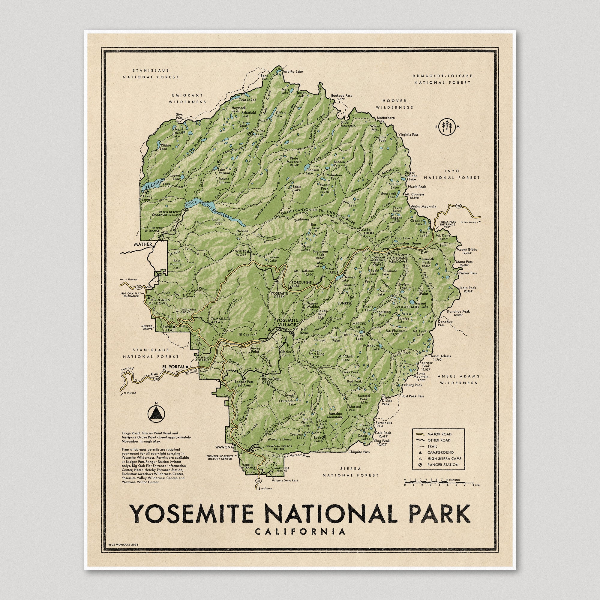 Archival art print of a modern map of Yosemite National Park, California made in a vintage style, available in green or brown. Shows many details, including campgrounds, ranger stations, roads, trails, peaks, lakes, and rivers.
