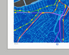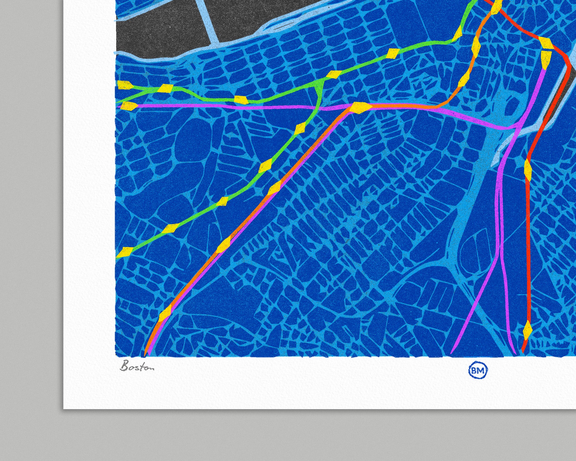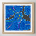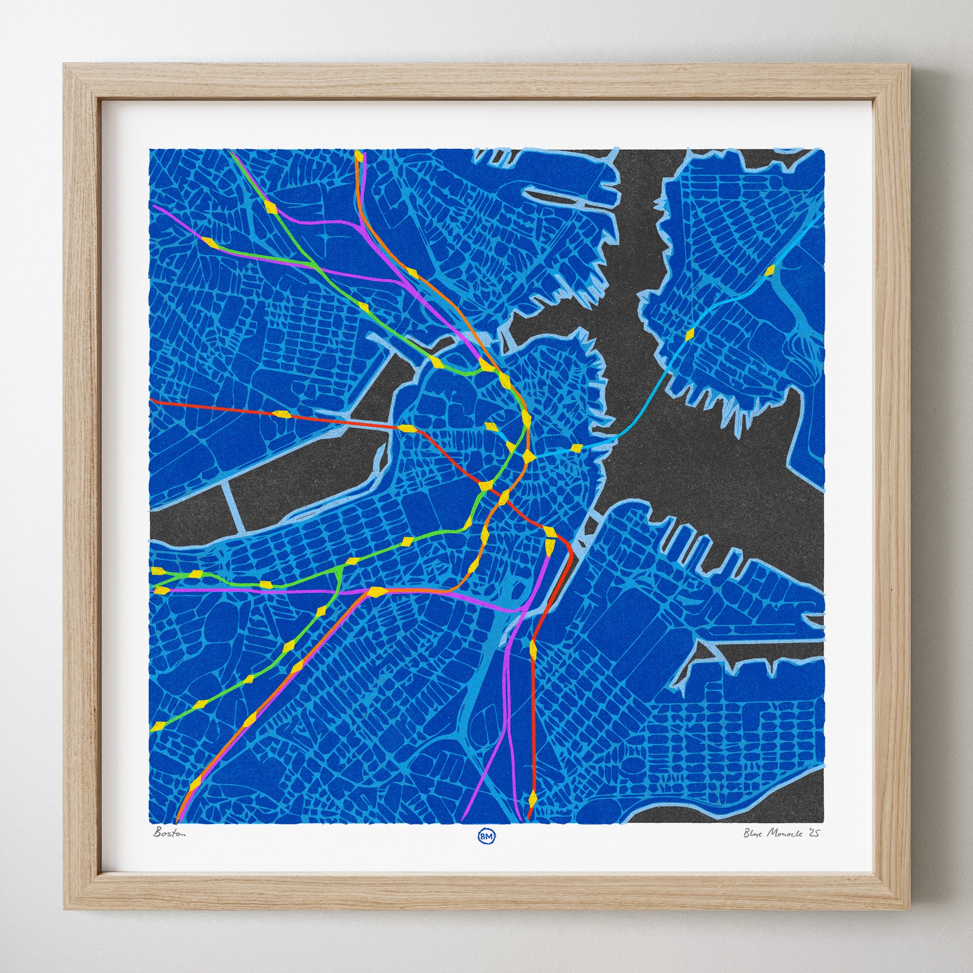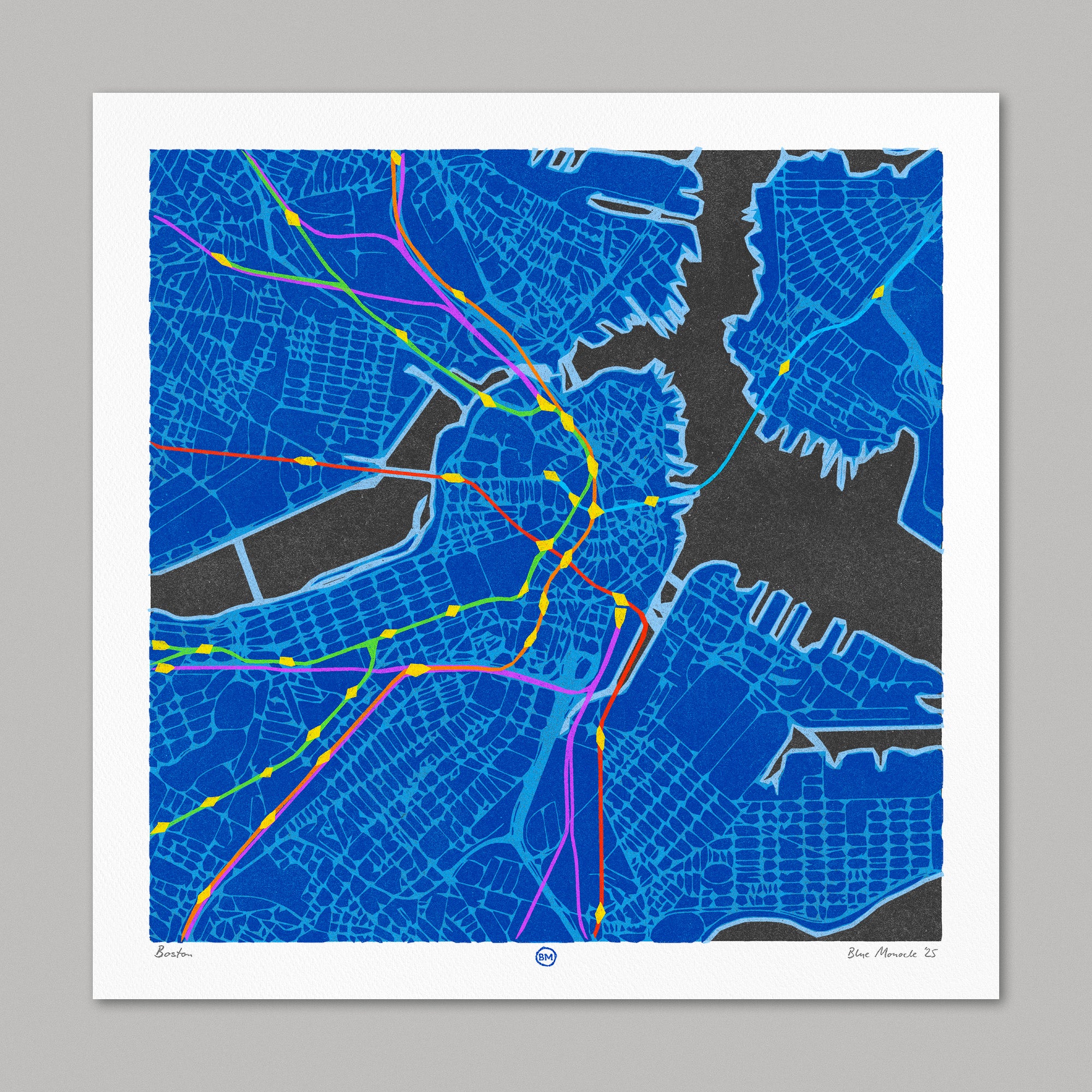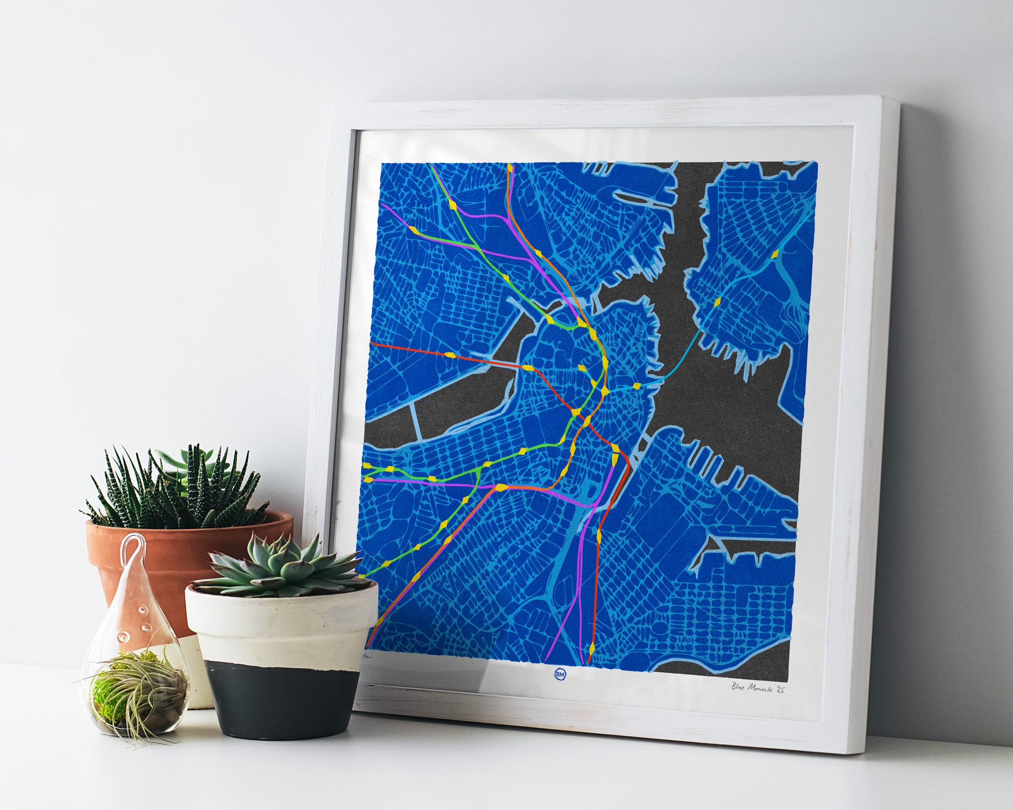 Archival art print of a map of downtown Boston in dark blue. Shows streets in light blue, subway lines in red, blue, orange, and green, and commuter train lines in purple.