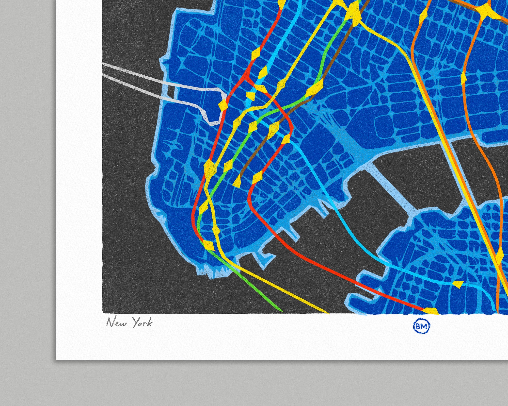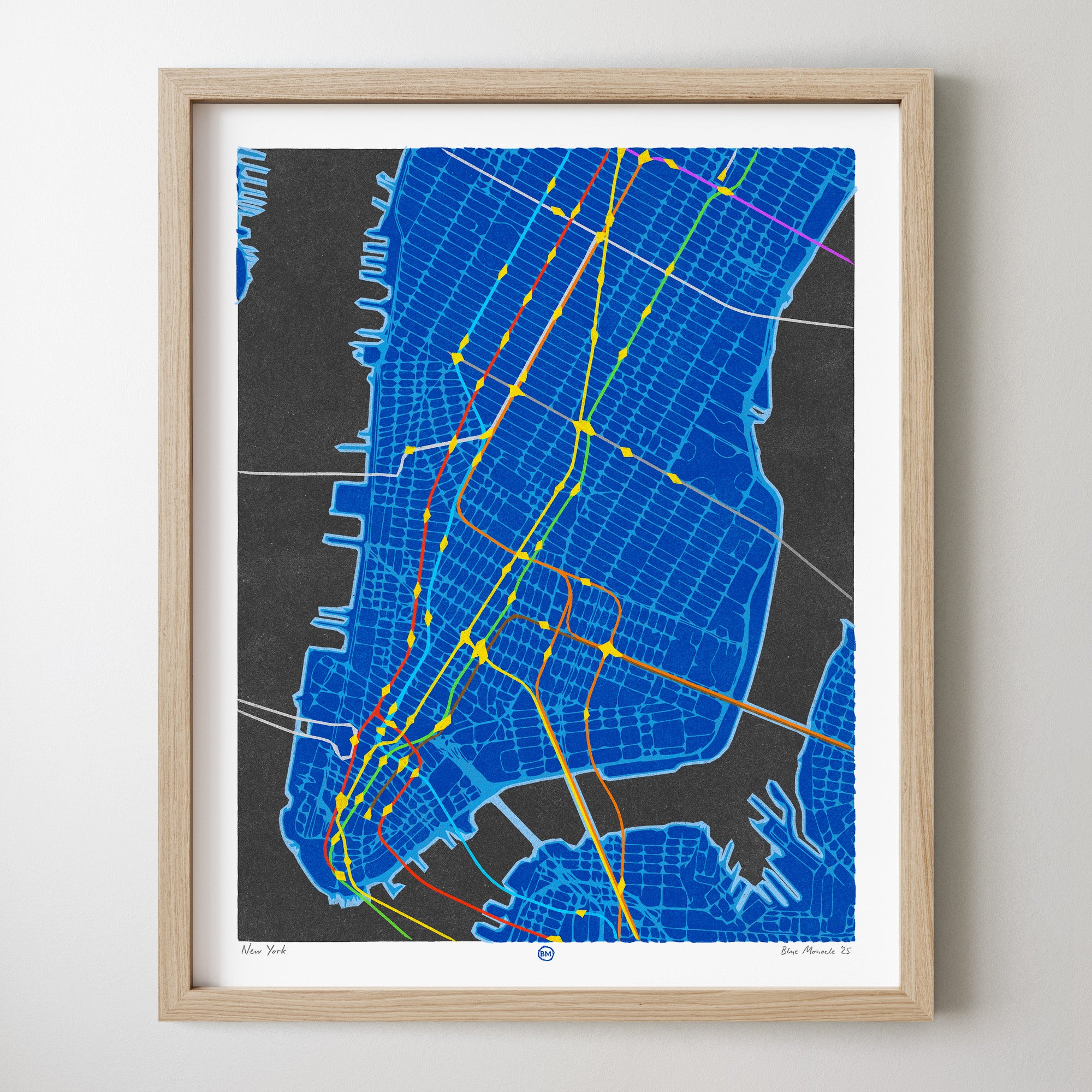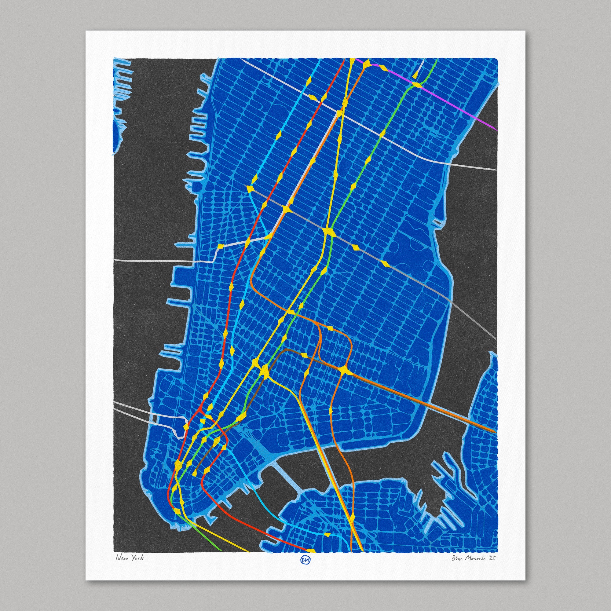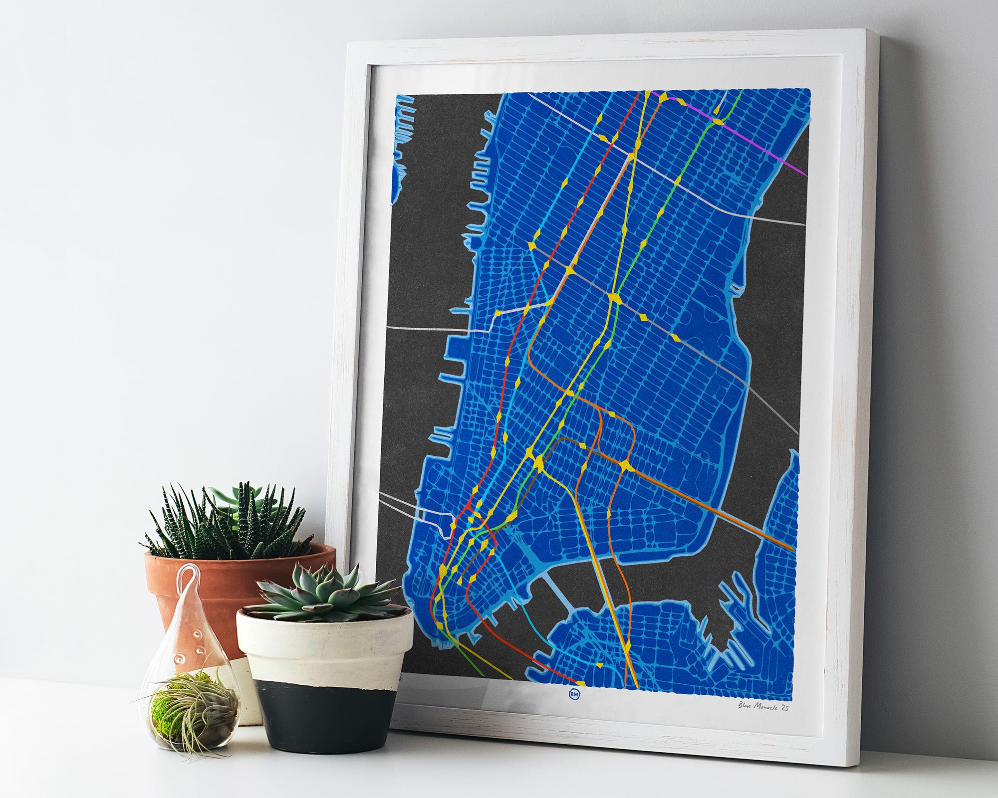 Archival art print of a map of Lower Manhattan, New York City in dark blue. Shows streets in light blue. Also includes all subway lines in various colors, as well as  PATH lines, commuter trains, and Amtrak lines in white.