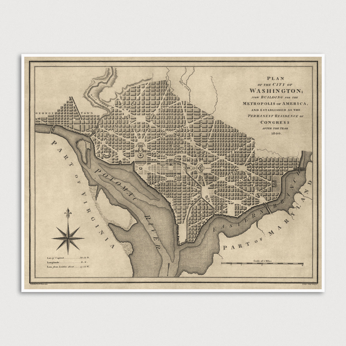 Archival print reproduction of an antique map of Washington, DC from 1793 by William Bent.
