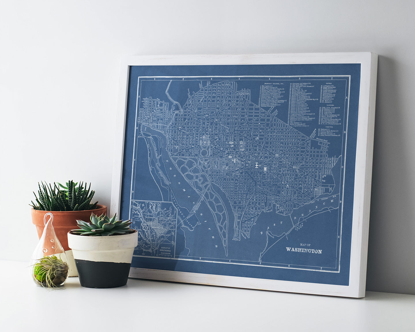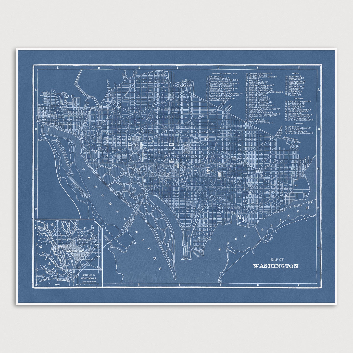 Archival art print in a blueprint style based on an antique map of Washington, DC from 1901 by George Franklin Cram.