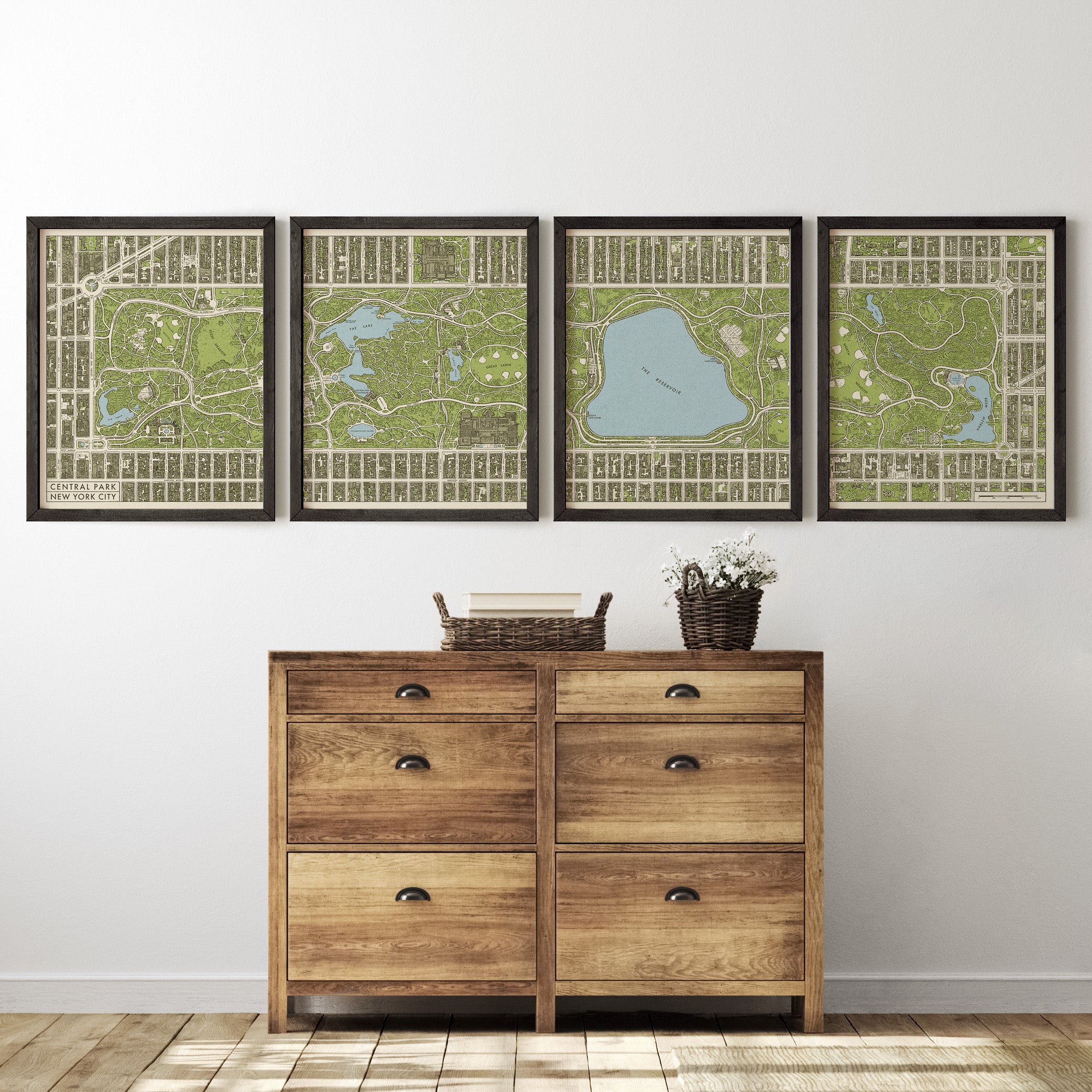 Archival art print set of a modern map of Central Park in Manhattan, New York City available as a set of four prints. The map is designed to evoke an older, somewhat midcentury style, and contains numerous details, including: streets, paths, trails, park buildings, arches, monuments, meadows, forests, lakes and ponds, playgrounds, subway stations, and more. Also includes the Central Park Zoo, the Metropolitan Museum of Art, and the American Museum of Natural History.