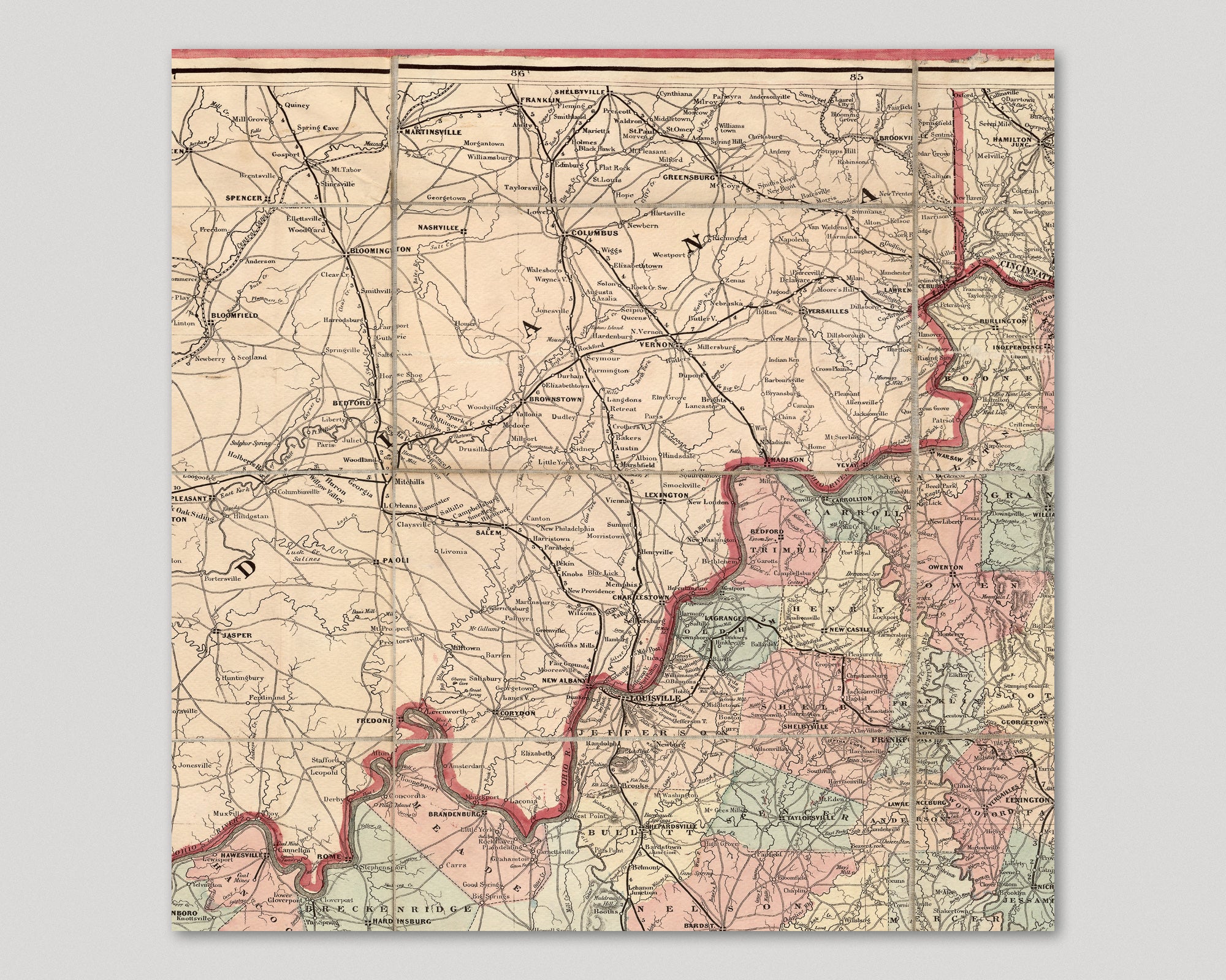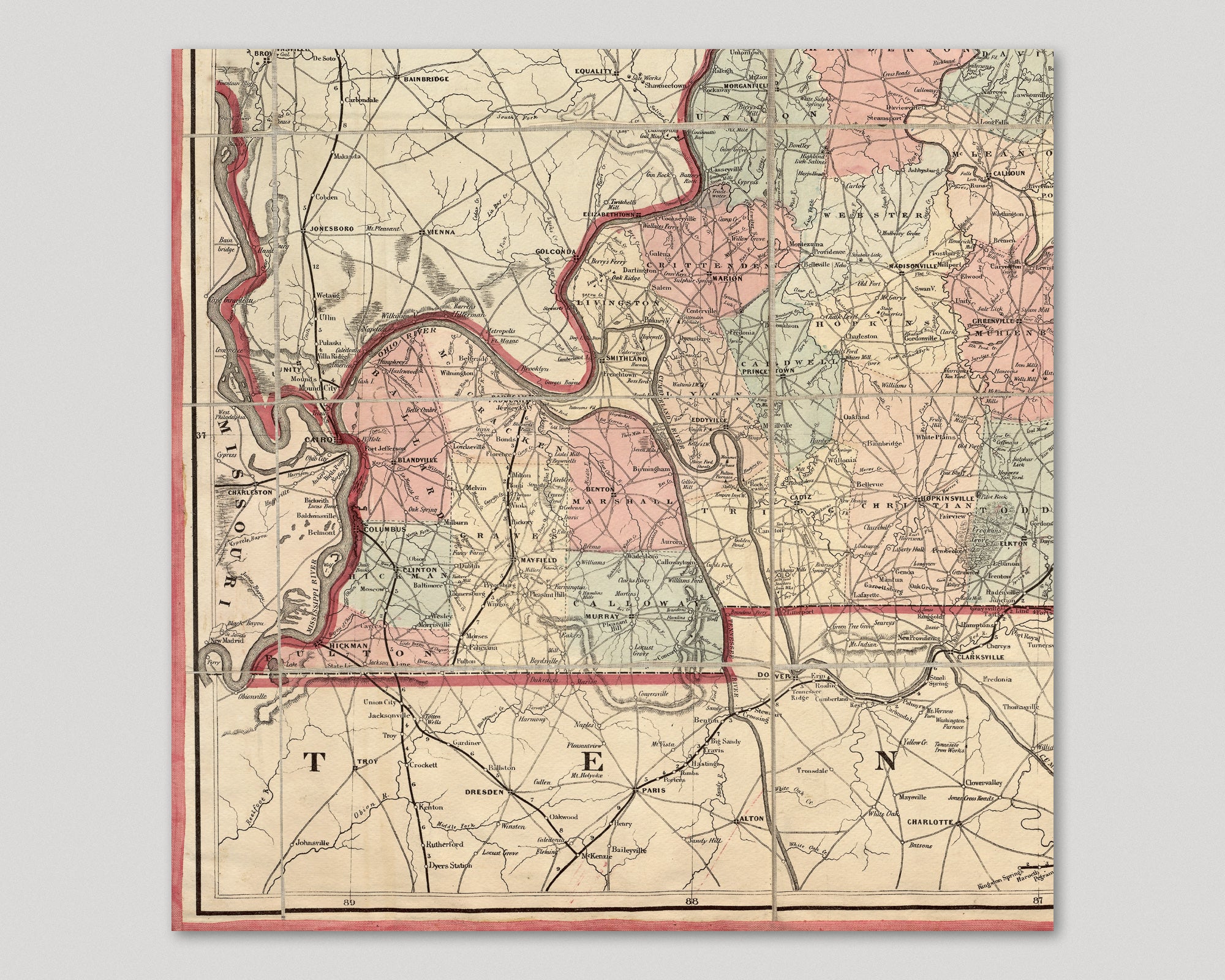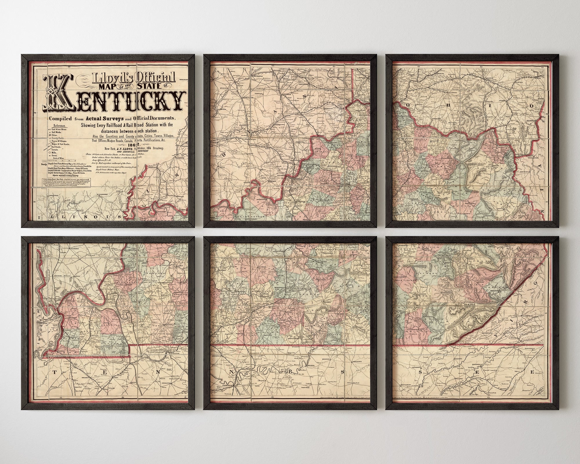 Archival print reproduction of an antique map of Kentucky from 1862 by James T. Lloyd. Detailed 19th century map of Kentucky, showing the locations of counties, cities, towns, rivers, roads, railroads, mountains, and mines.