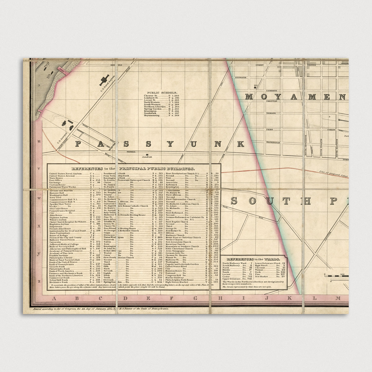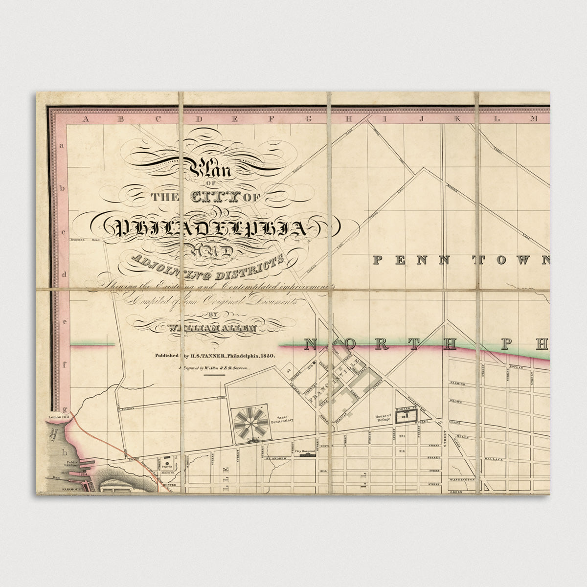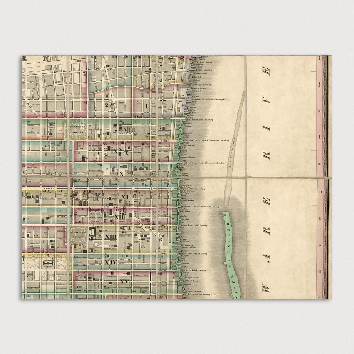 Archival print reproduction of an antique map of Philadelphia, Pennsylvania from 1830 by William Allen. Detailed mid-19th century map of Philadelphia showing numerous details, including streets, wharves, neighborhoods and wards, squares, and important buildings. Includes an index in the lower left to "Principal Public Buildings".
