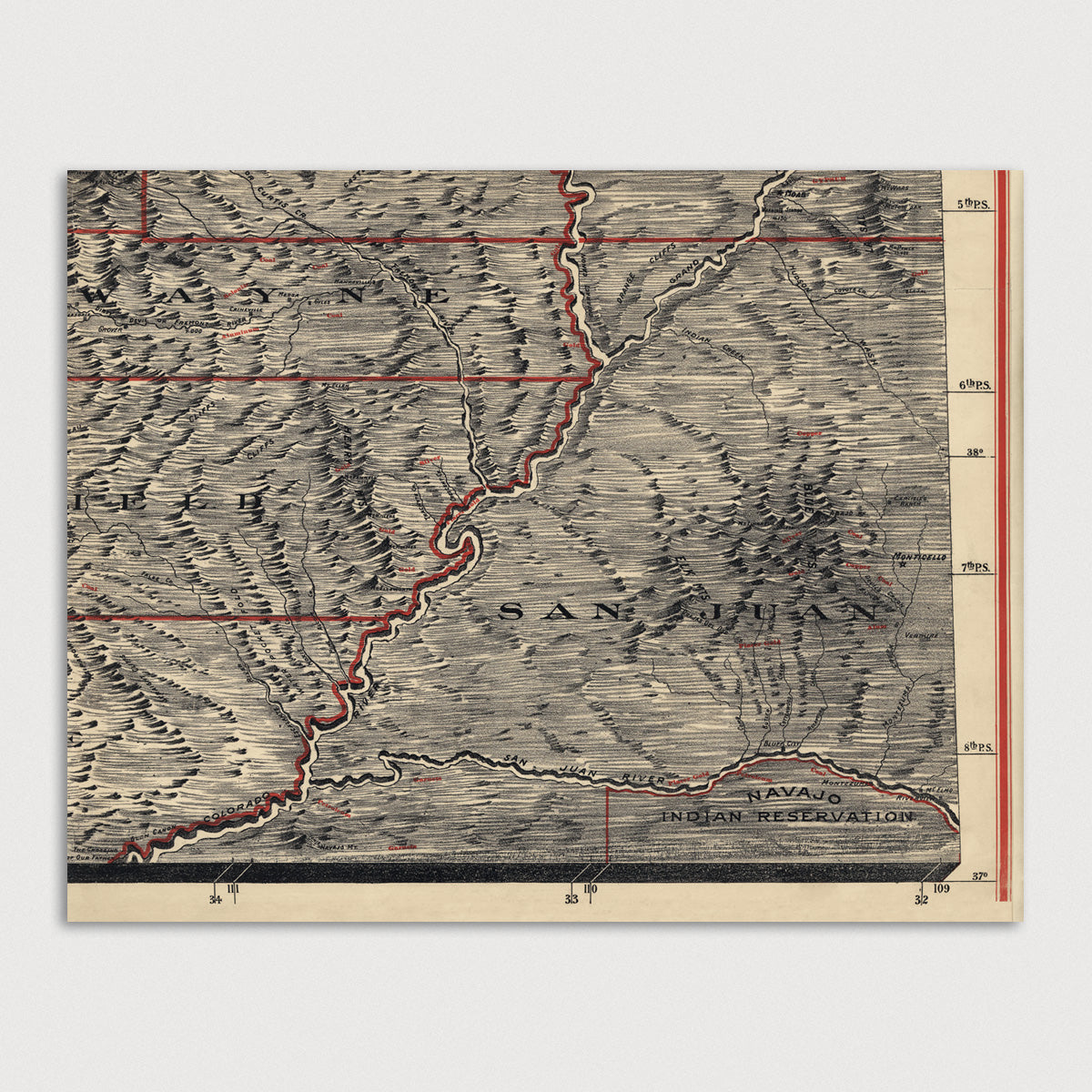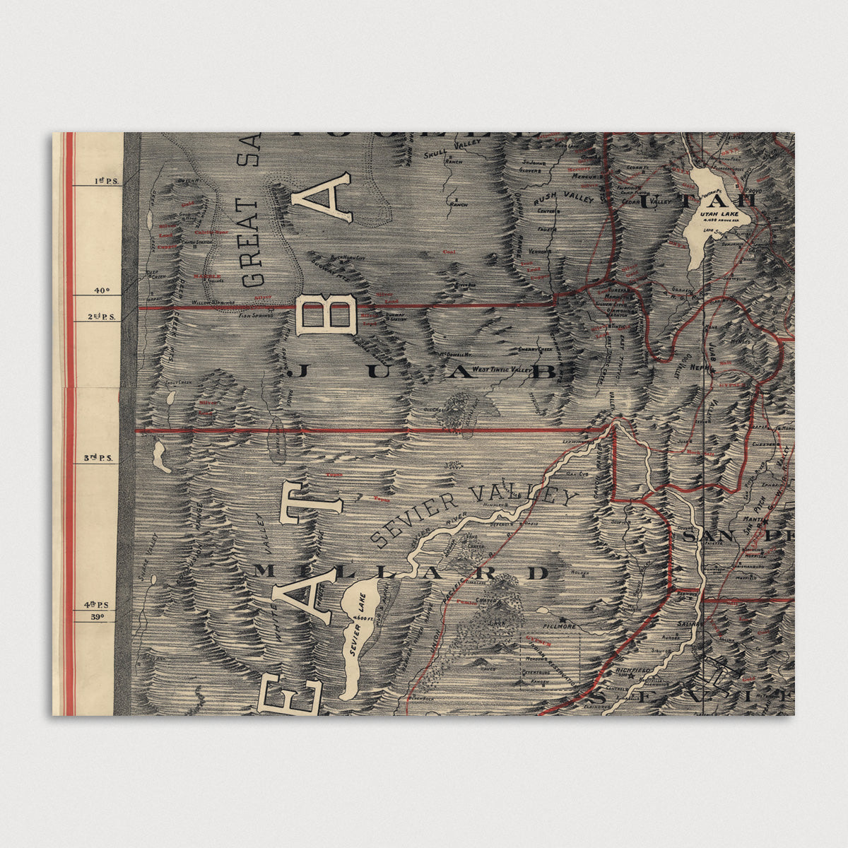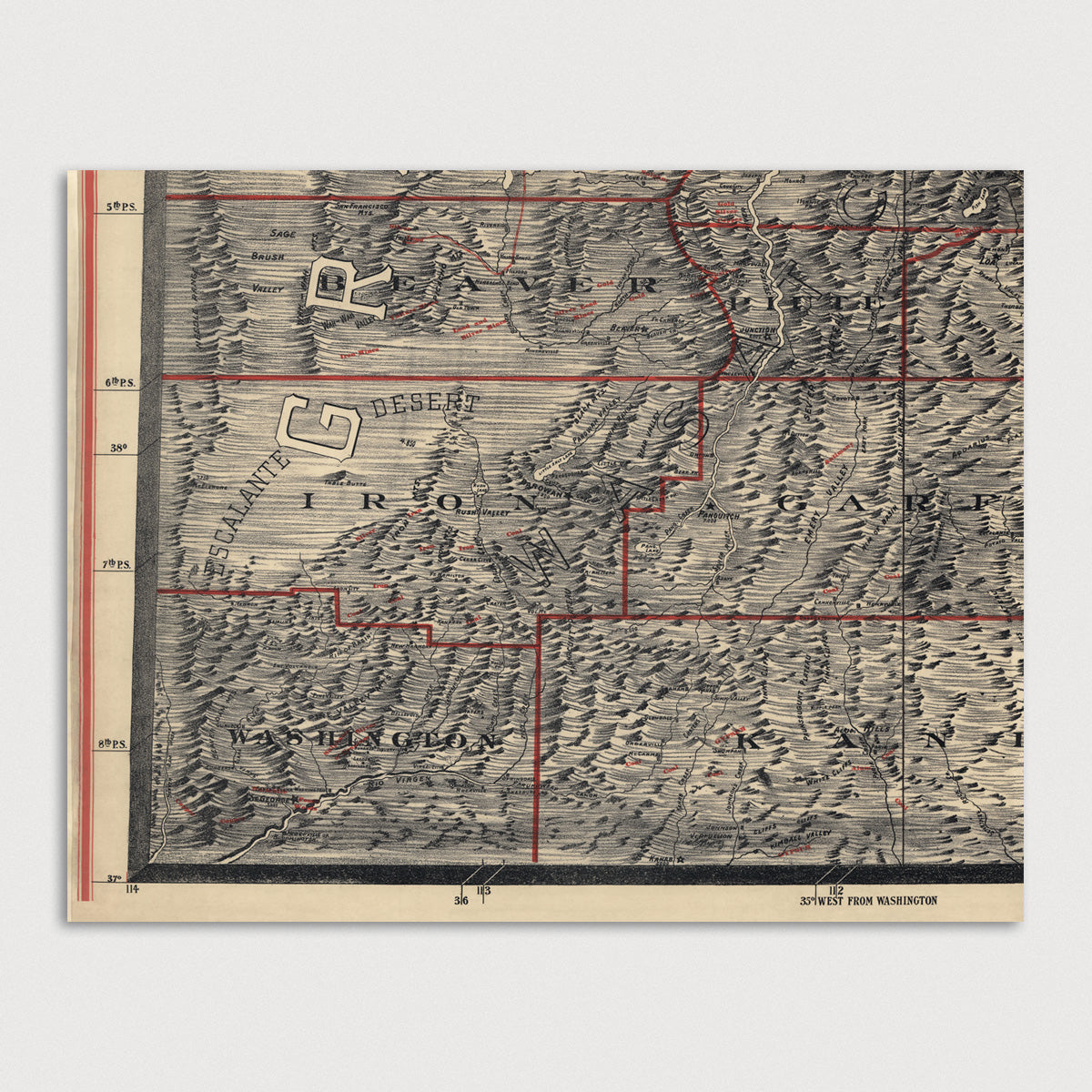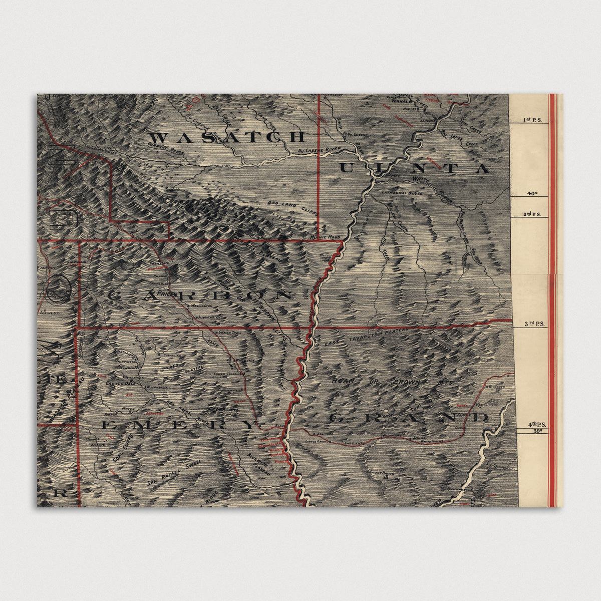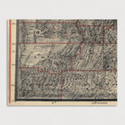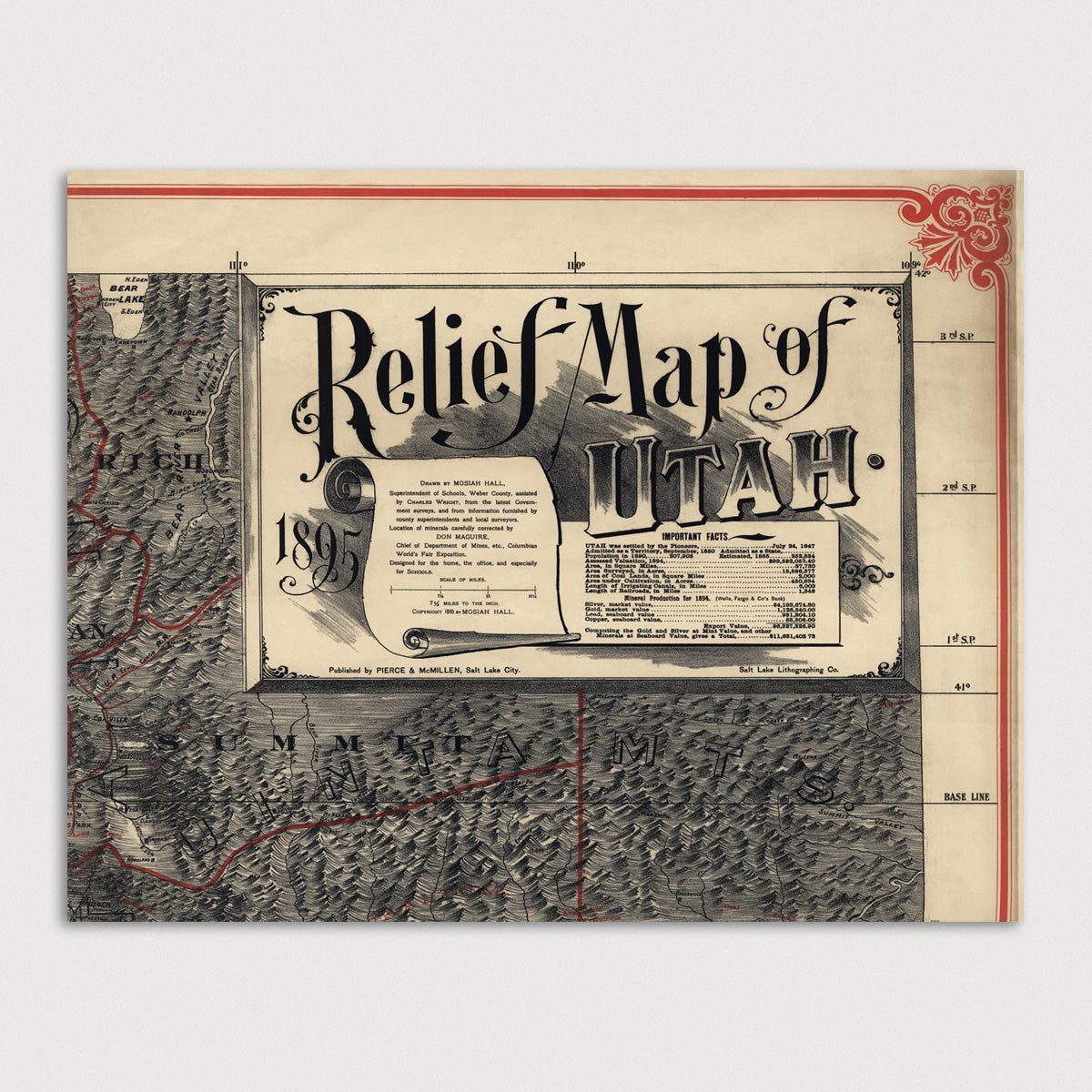 Archival print reproduction of an antique map of Utah from 1895 by Mosiah Hall. Most likely made as a classroom map to be hung in schools. County borders and minerals are illustrated on the map in red.