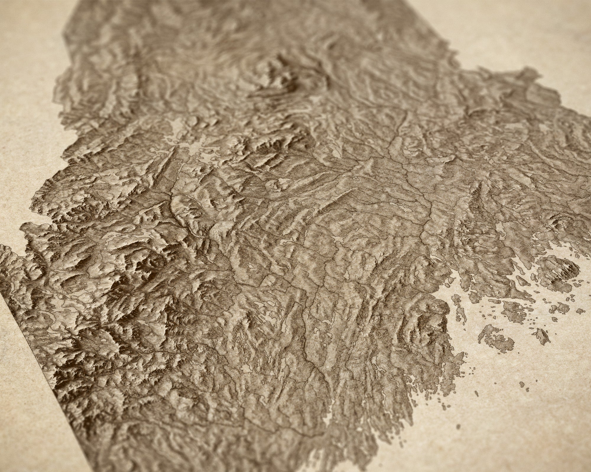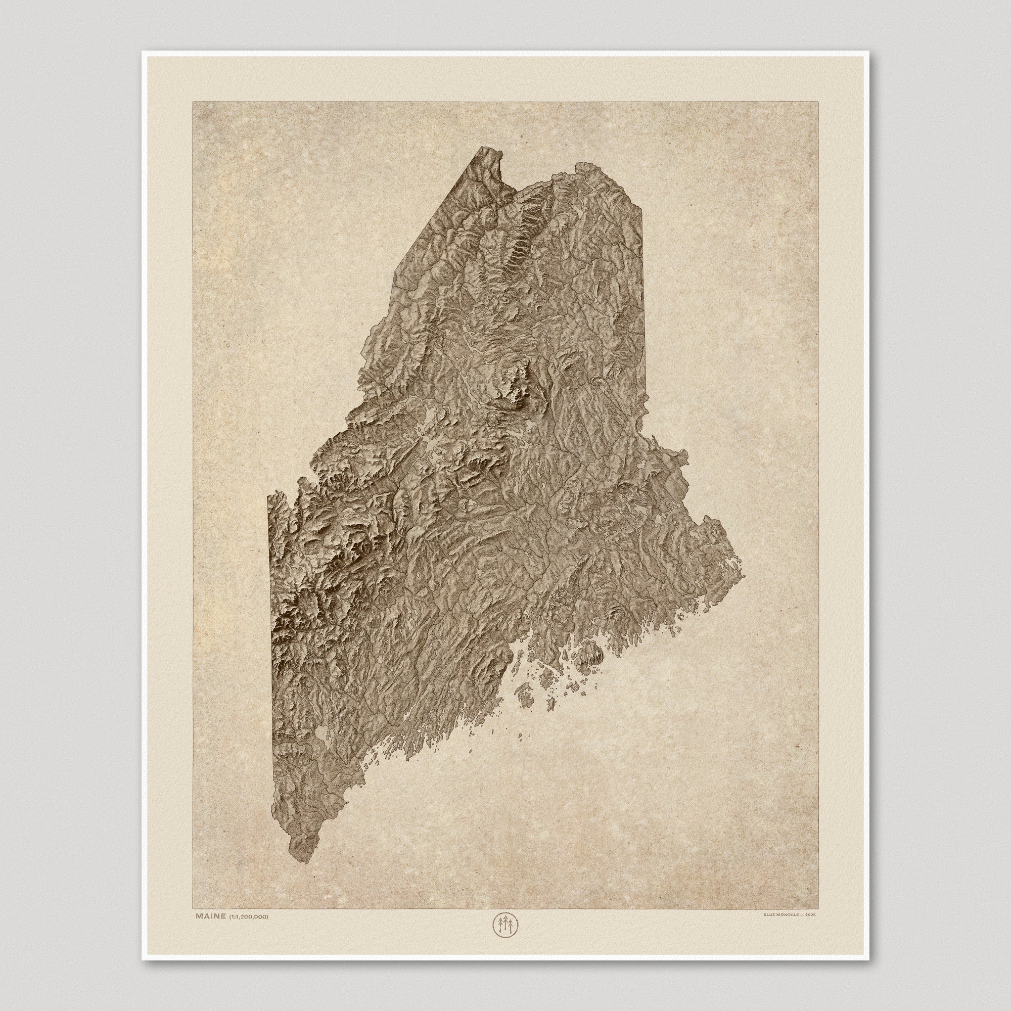 Archival art print of a modern shaded relief map of Maine in a rustic, vintage sepia style. The map focuses on landforms with highly-detailed depictions of mountains, valleys, lakes and rivers.