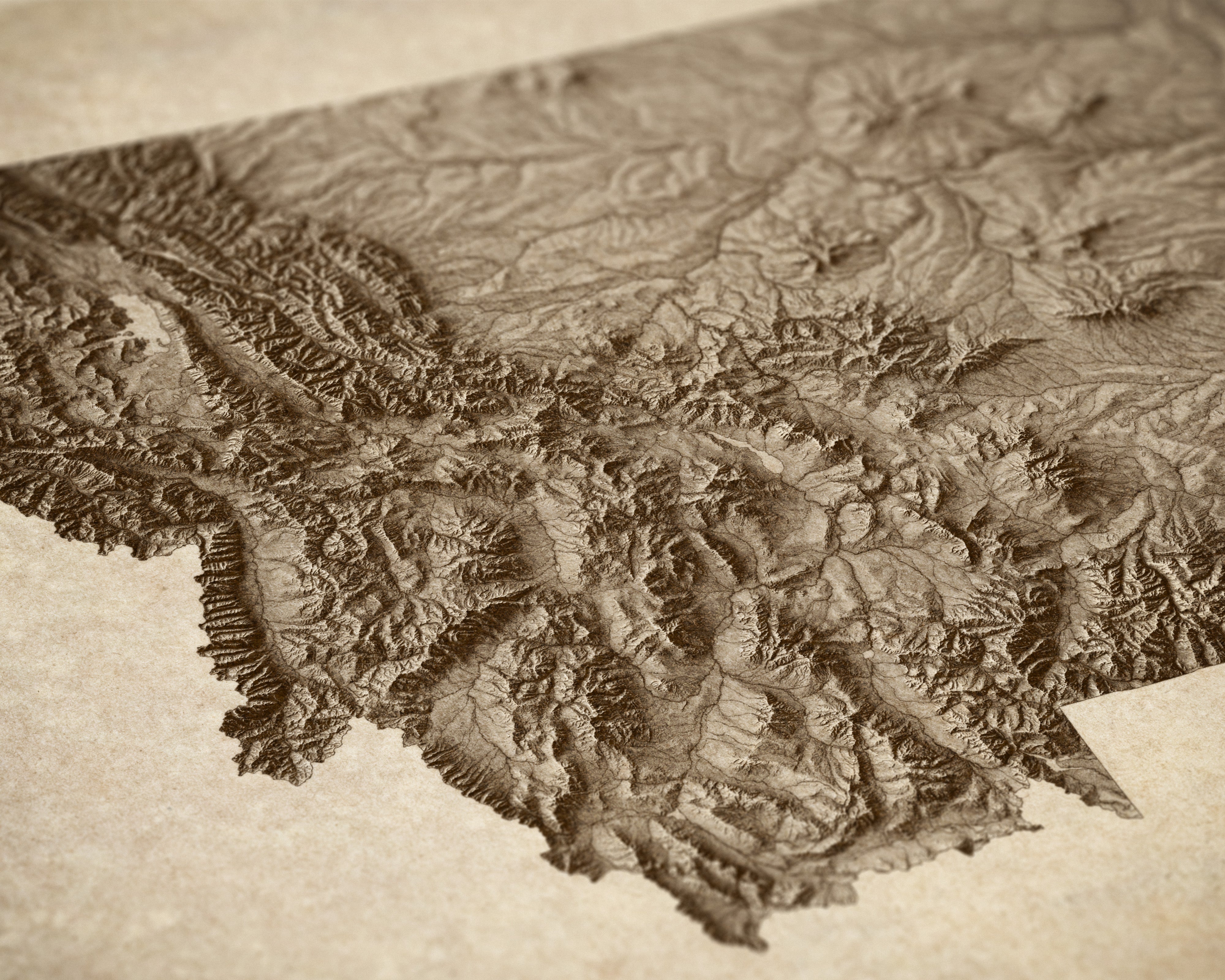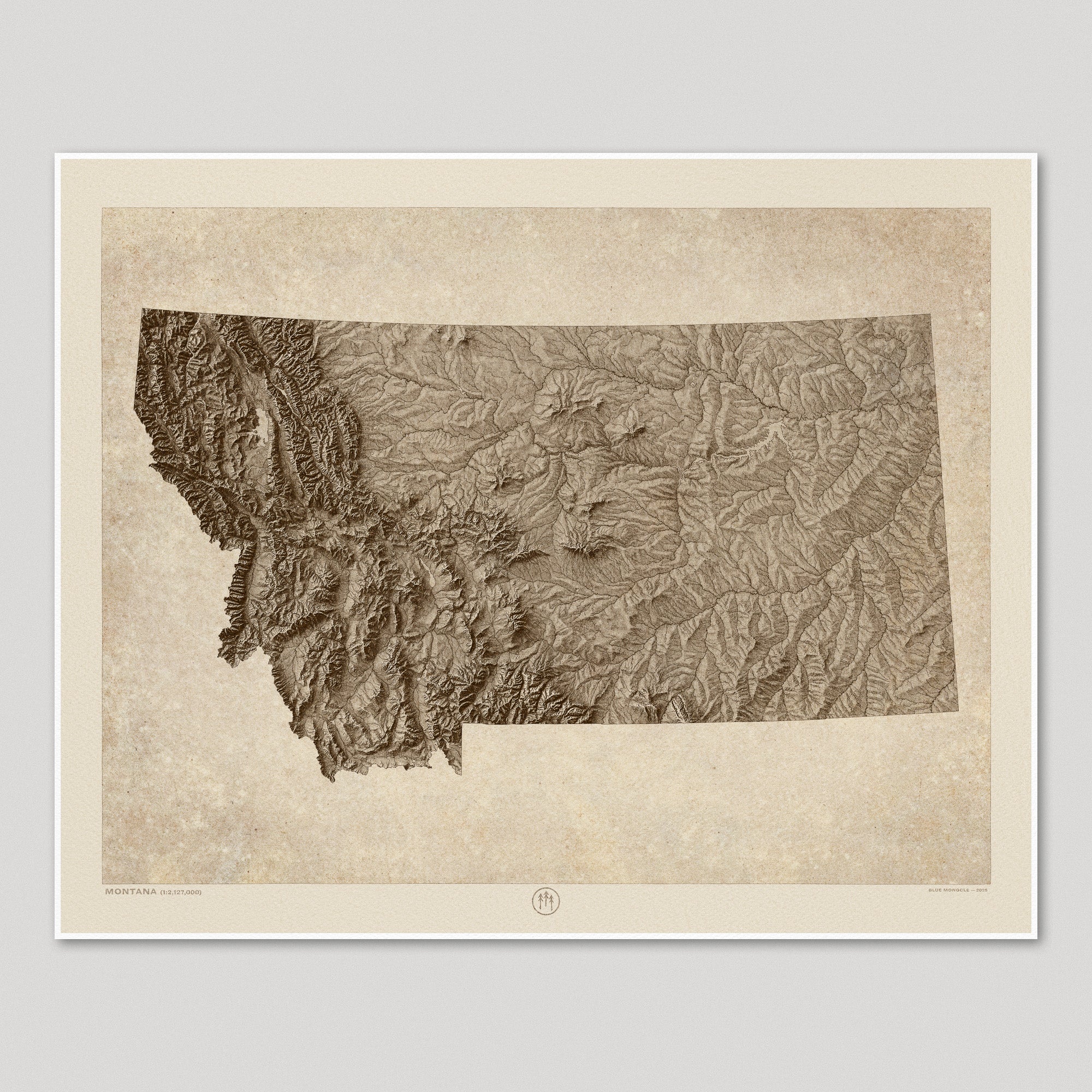 Archival art print of a modern shaded relief map of Montana in a rustic, vintage sepia style. The map focuses on landforms with highly-detailed depictions of mountains, valleys, canyons and rivers.