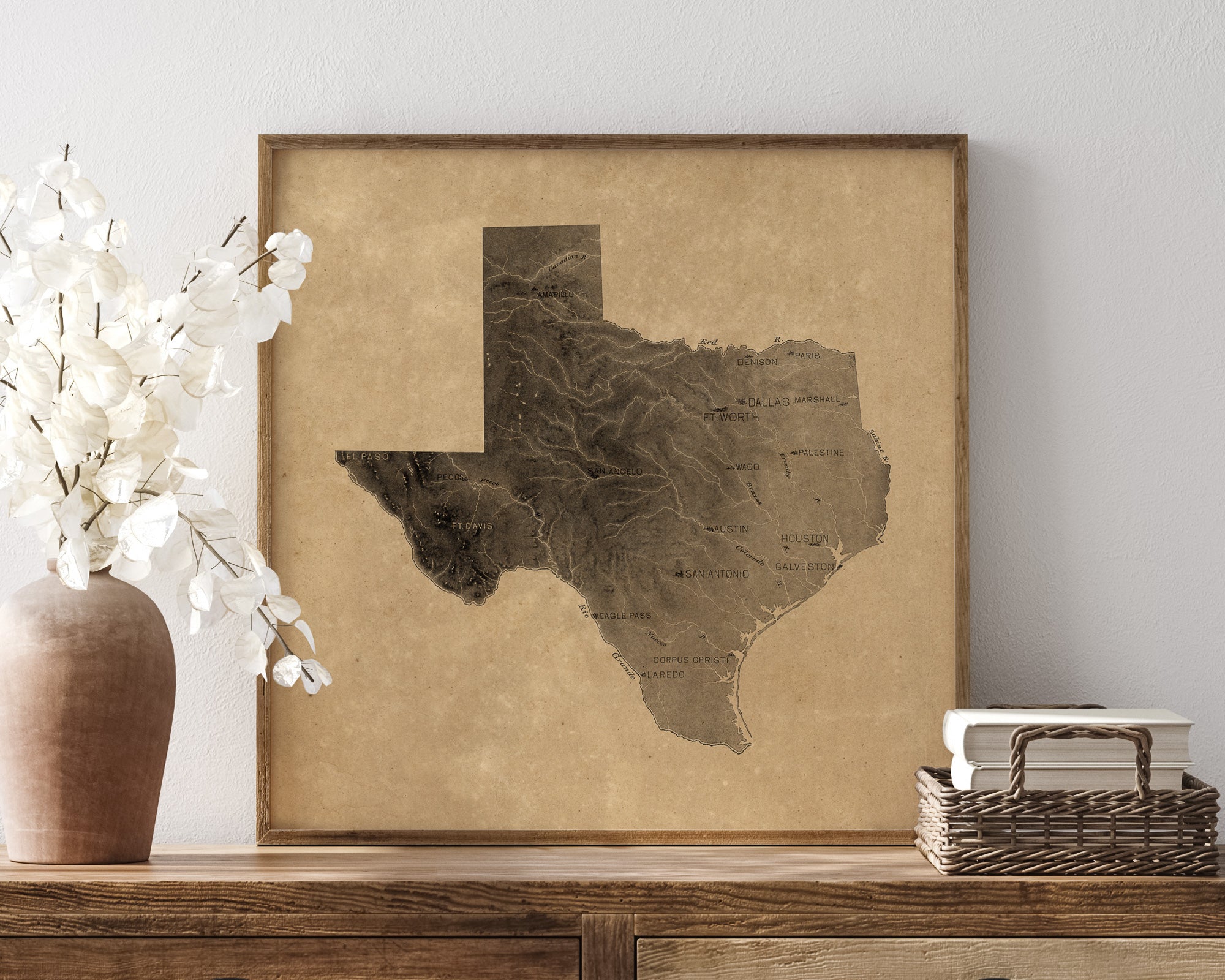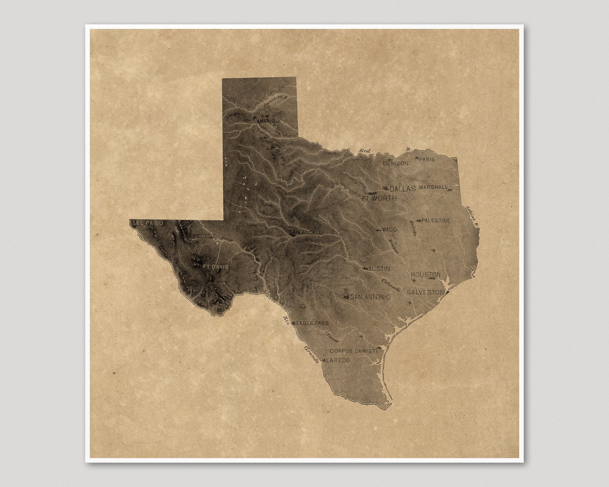 Archival art print based on a vintage early-20th century relief map of Texas.