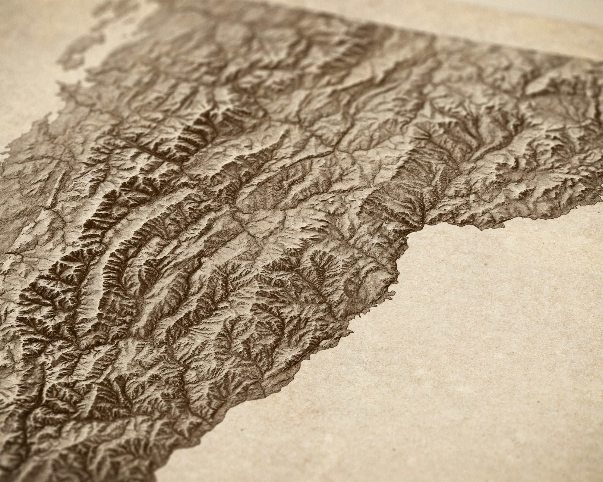 Archival art print of a modern shaded relief map of Vermont in a rustic, vintage sepia style. The map focuses on landforms with highly-detailed depictions of mountains, valleys, canyons, lakes and rivers.