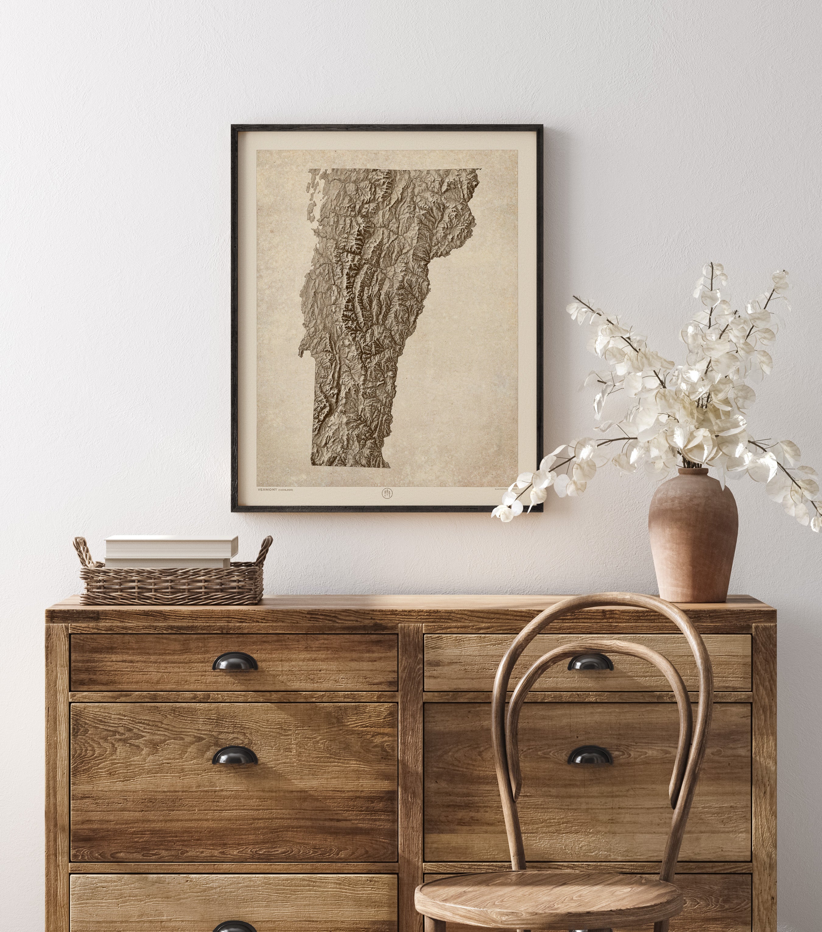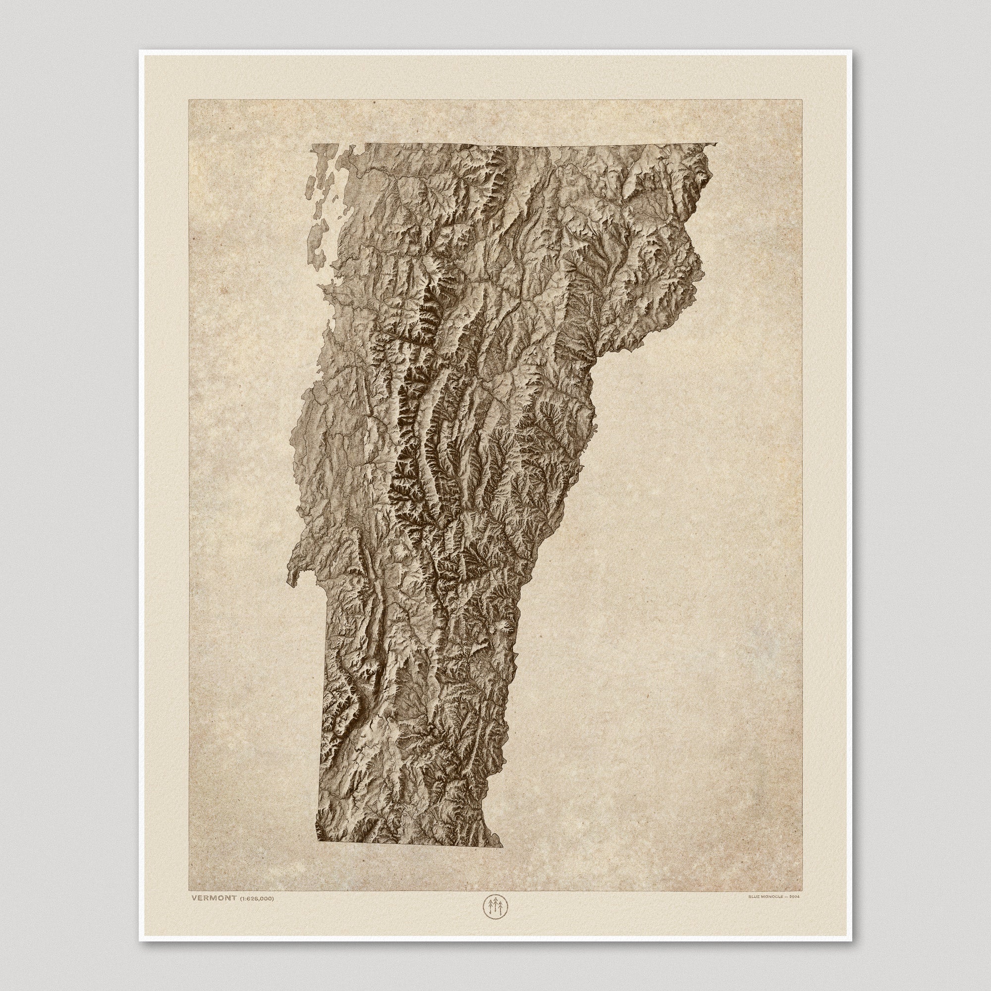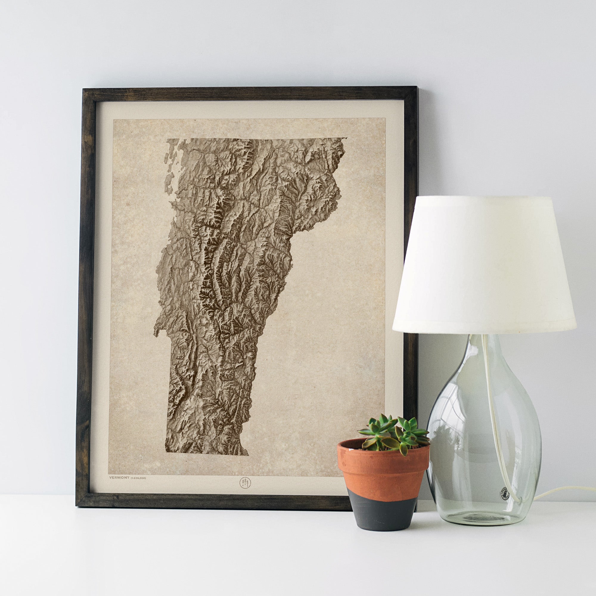Vermont Relief Map Art Print, Sepia, Vintage Style
