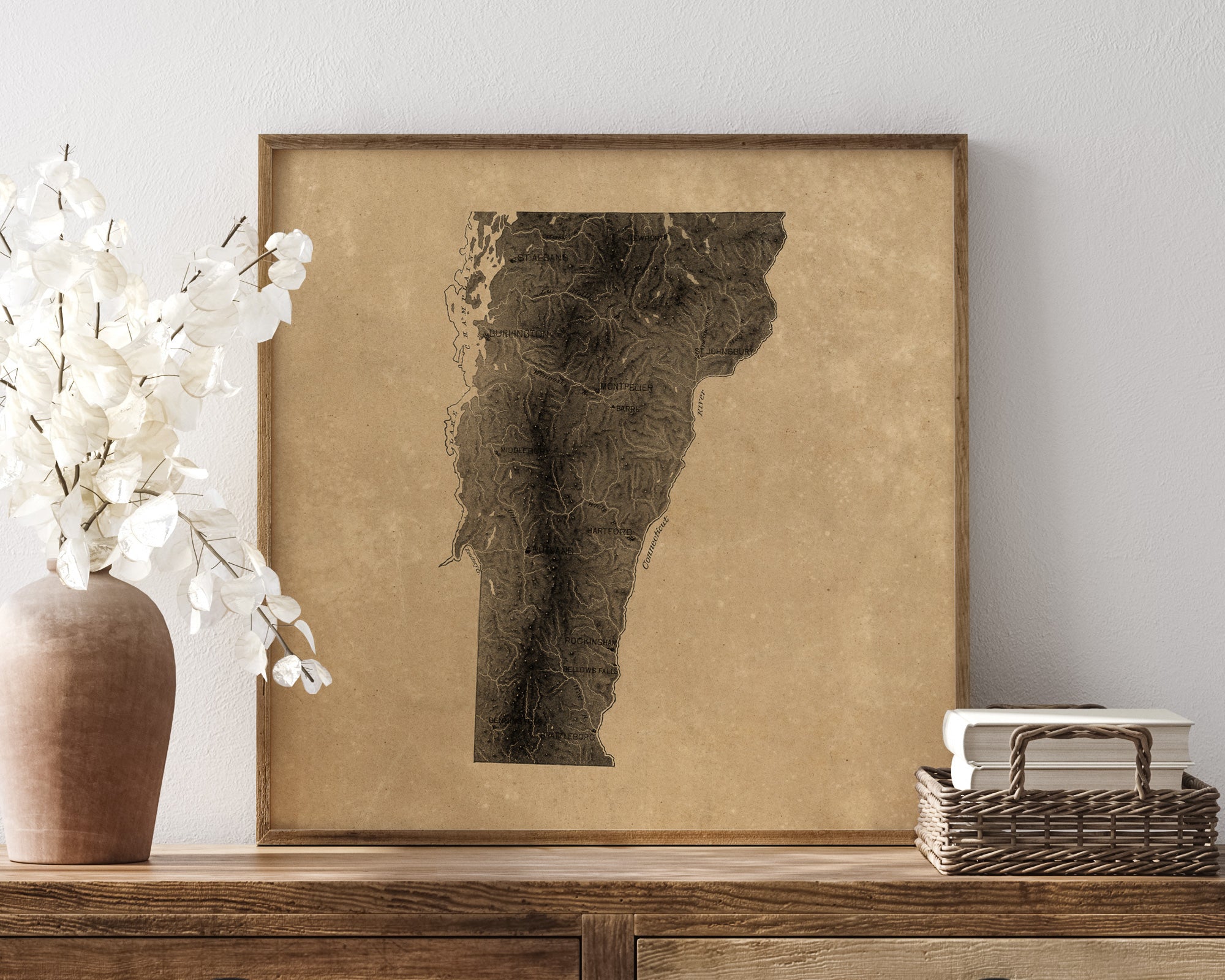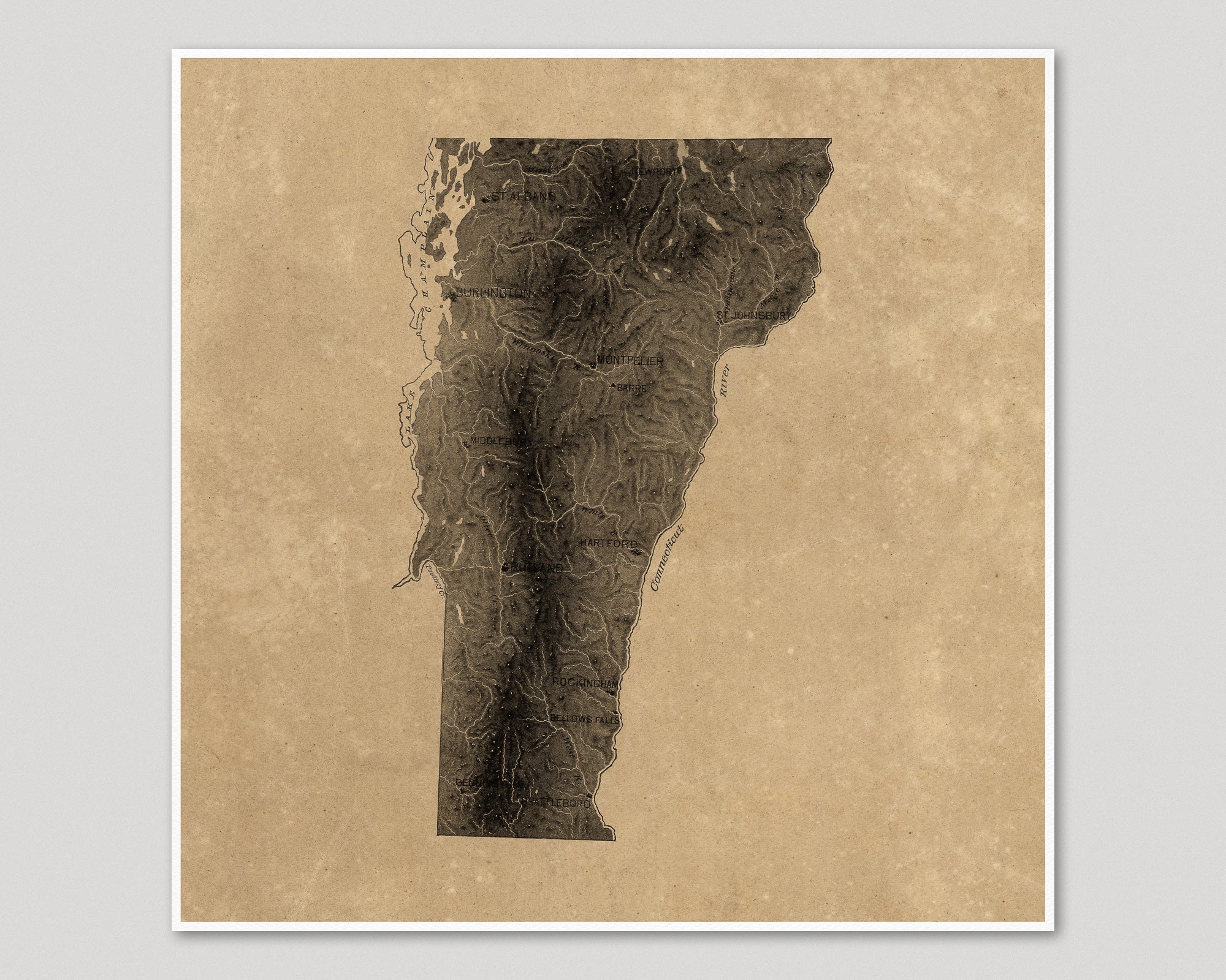 Archival art print based on a vintage early-20th century relief map of Vermont.
