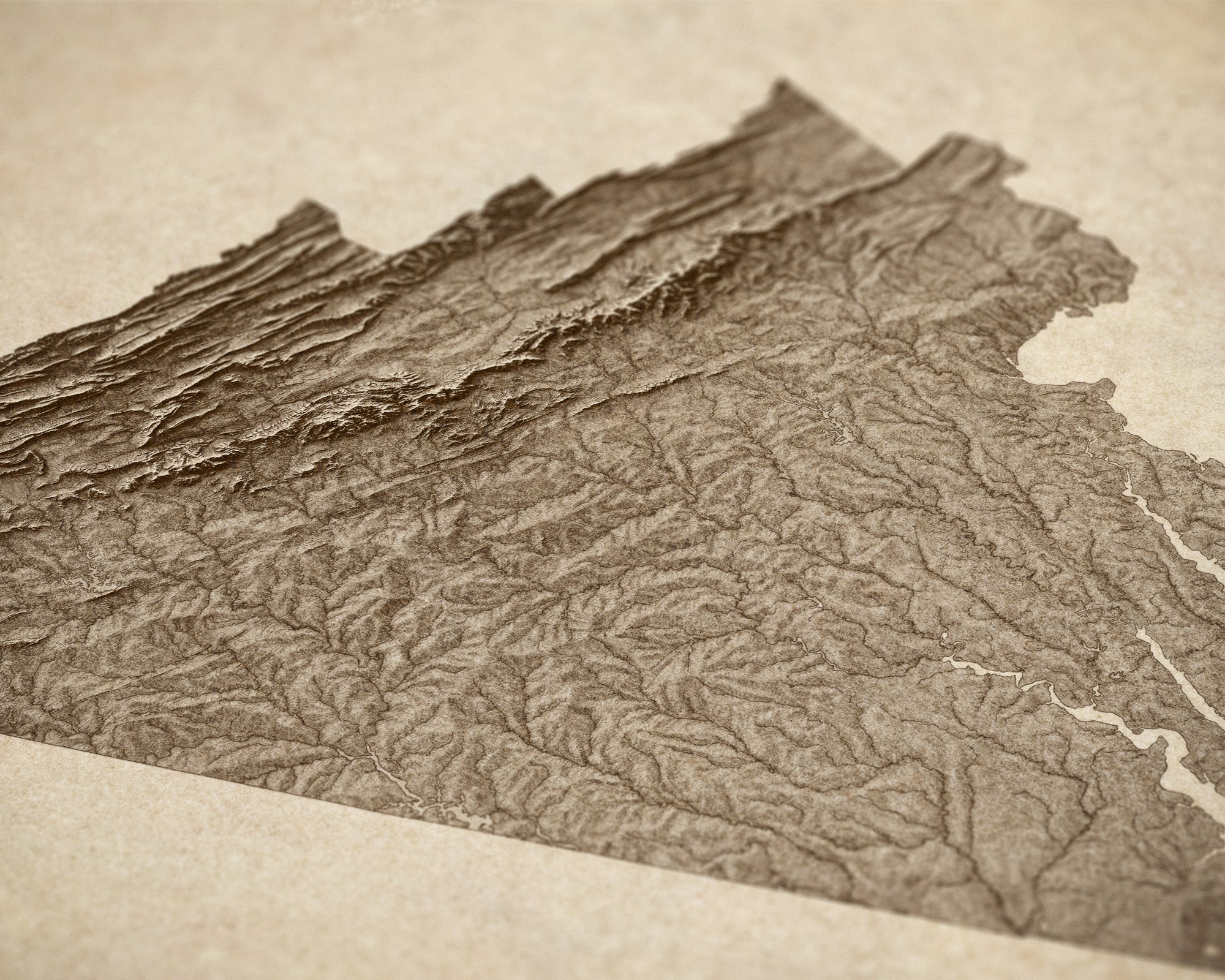 Archival art print of a modern shaded relief map of Virginia in a rustic, vintage sepia style. The map focuses on landforms with highly-detailed depictions of mountains, valleys, and rivers.