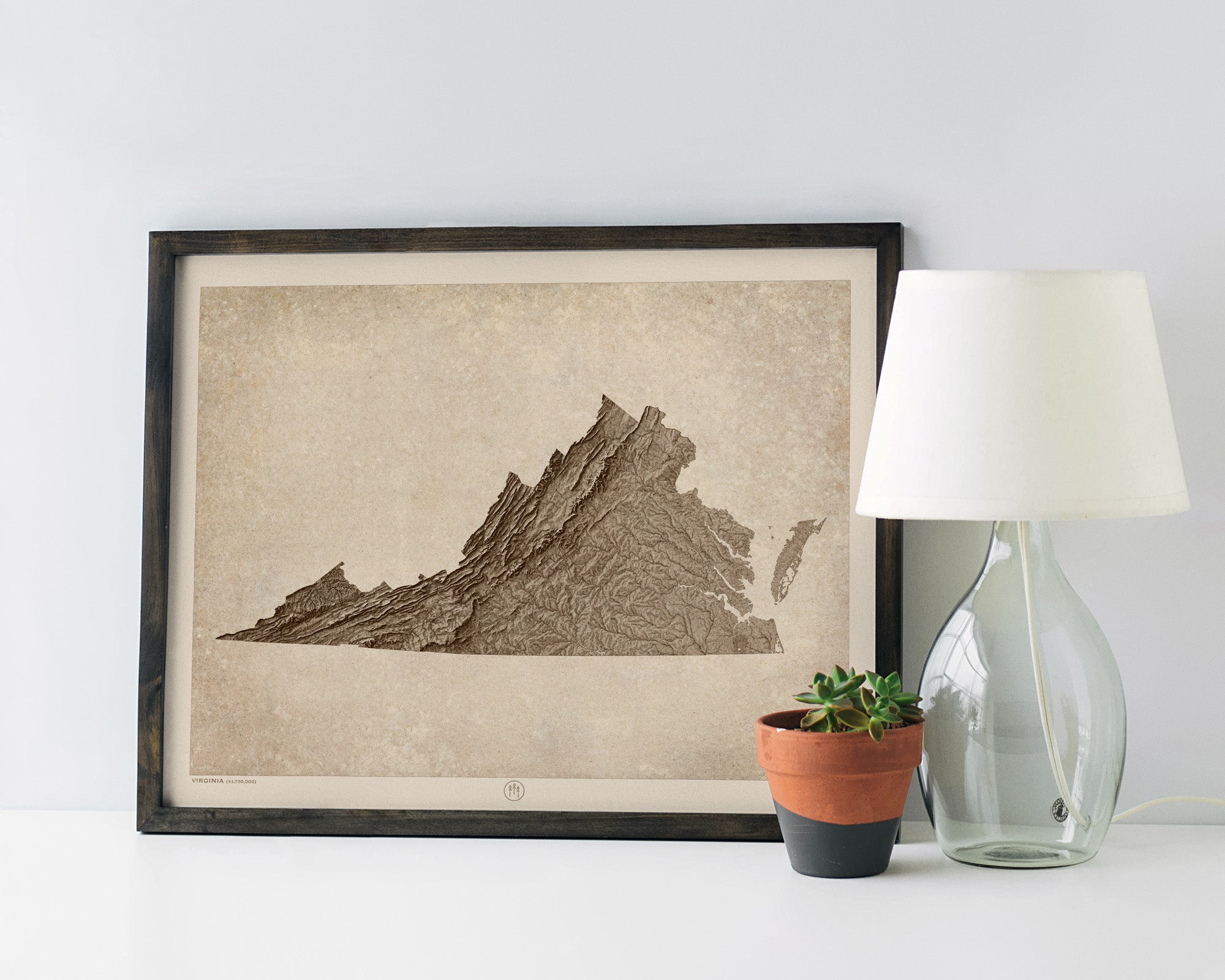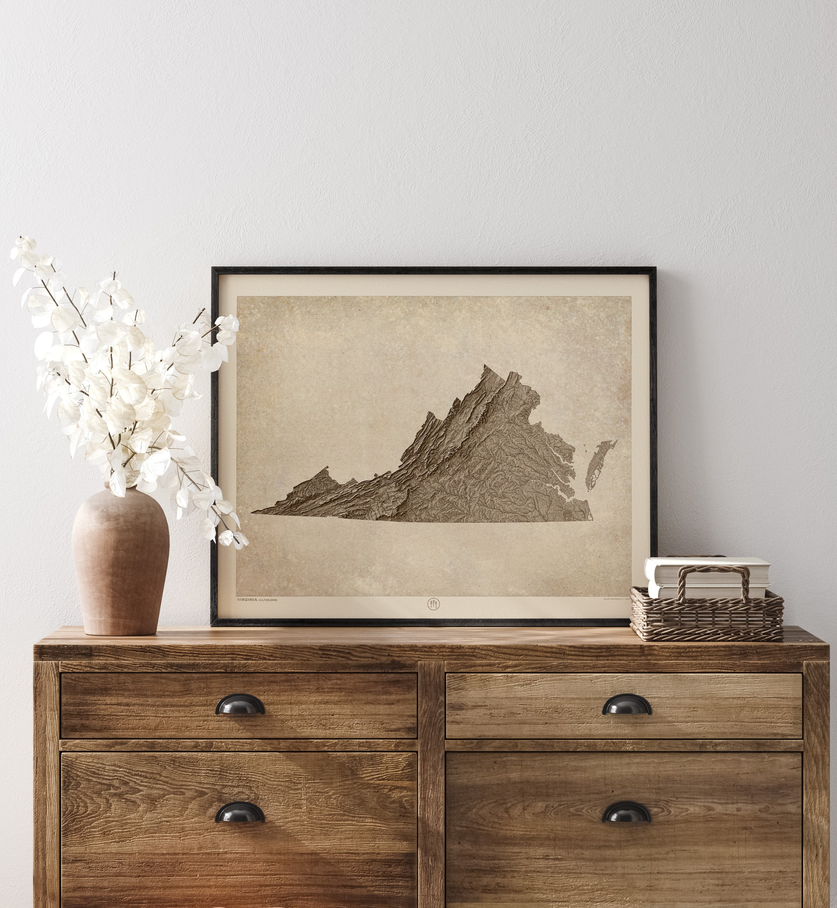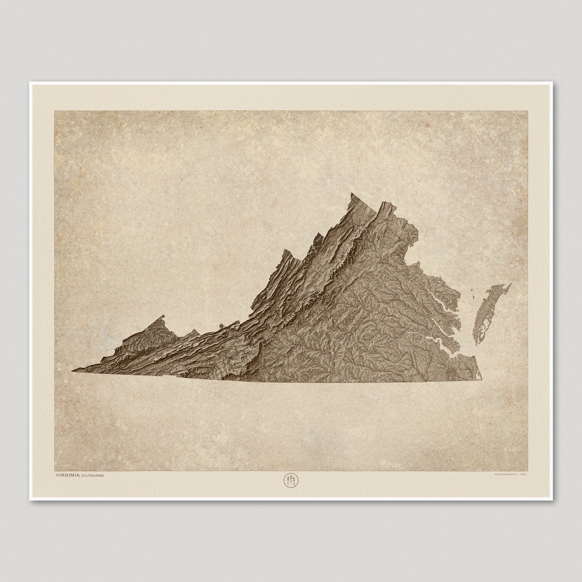 Virginia Relief Map Art Print, Sepia, Vintage Style
