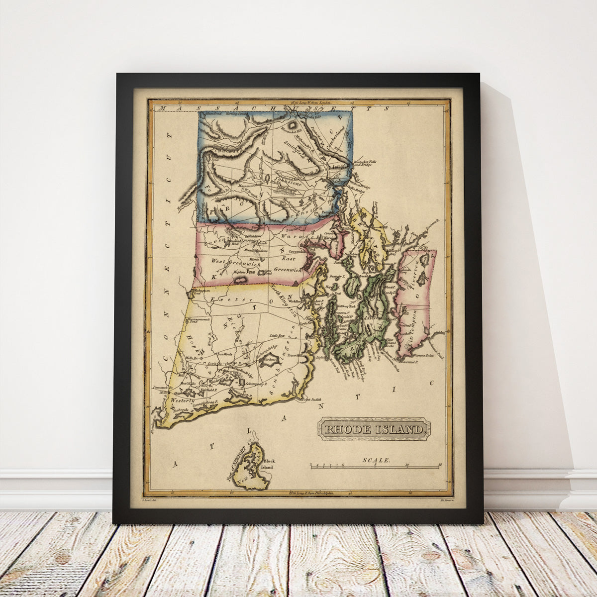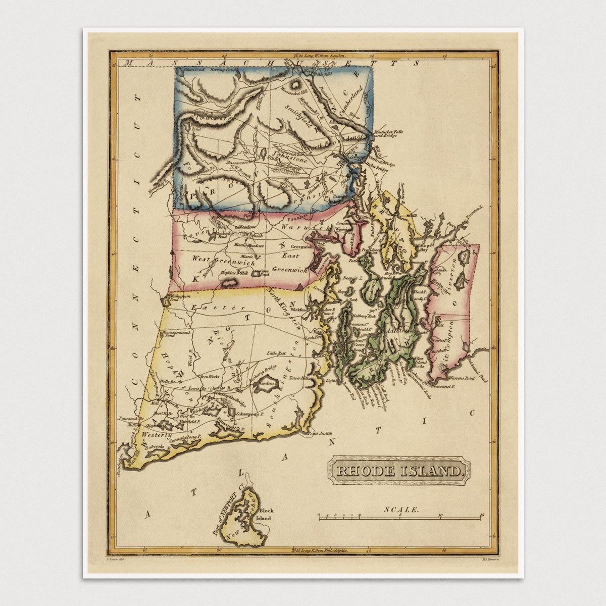 Archival print reproduction of an antique map of Rhode Island from c1817 by Fielding Lucas.