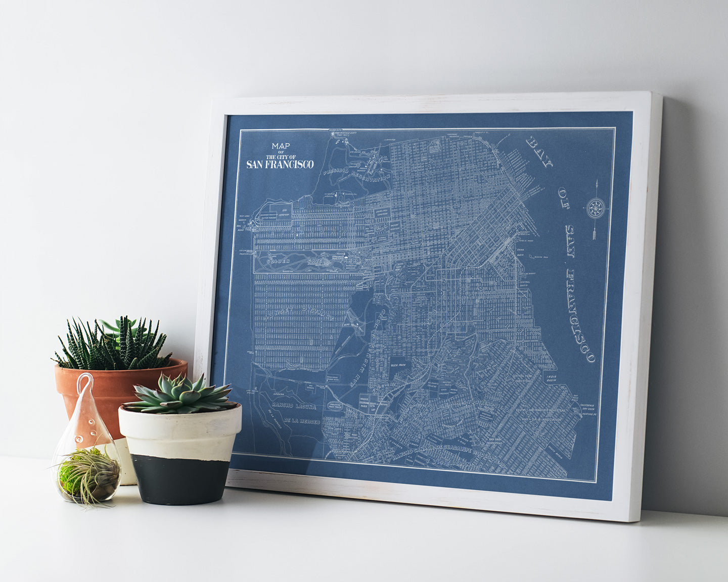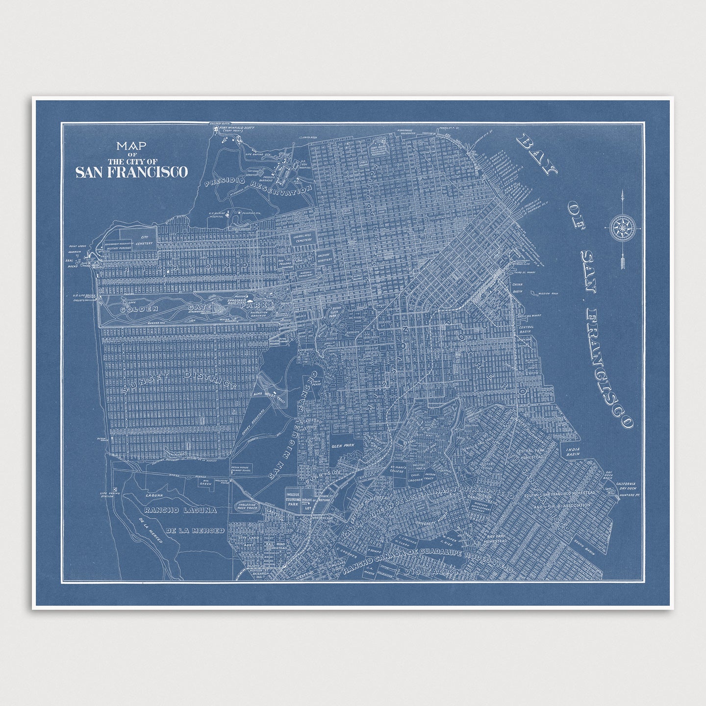 Archival art print in a blueprint style based on an antique map of San Francisco, California from 1901 by George Franklin Cram. Covers all of the present-day limits of the city, and indicates a number of neighborhoods, including Mission, Potrero, Western Addition, Richmond, and Sunset, and shows the names of the original ranchos in the southern part of the city.